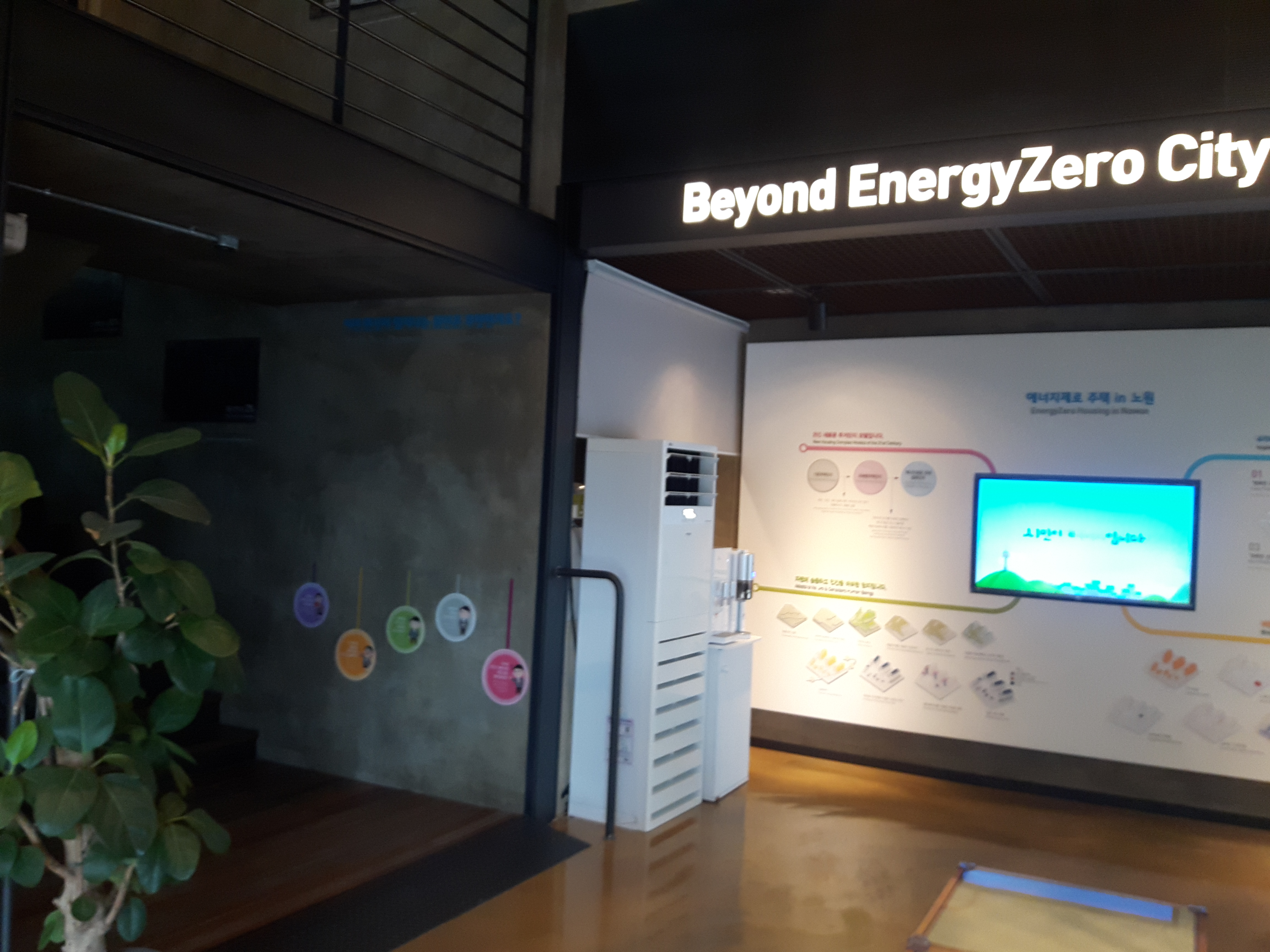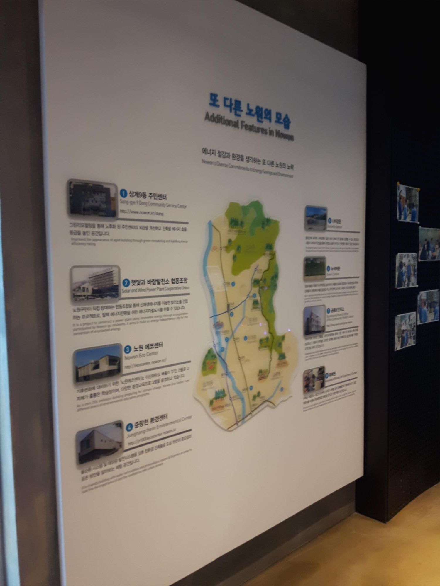 벽면에는 노원의 다른 에너지절감 친환경 건물들에 대한 소개와, 기후변화에 대응하기 위한 다른 나라의 현황들을 그래픽으로 한눈에 보기 쉽게 표현했어요.