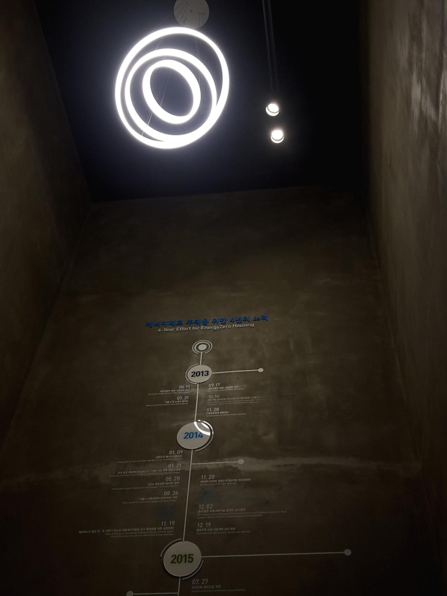 에너지제로주택을 짓기까지 4년의 노력을 연표로 만들어서 벽에 붙여놓았어요. 그 위에는 독특한 모양의 조명이 있어요.