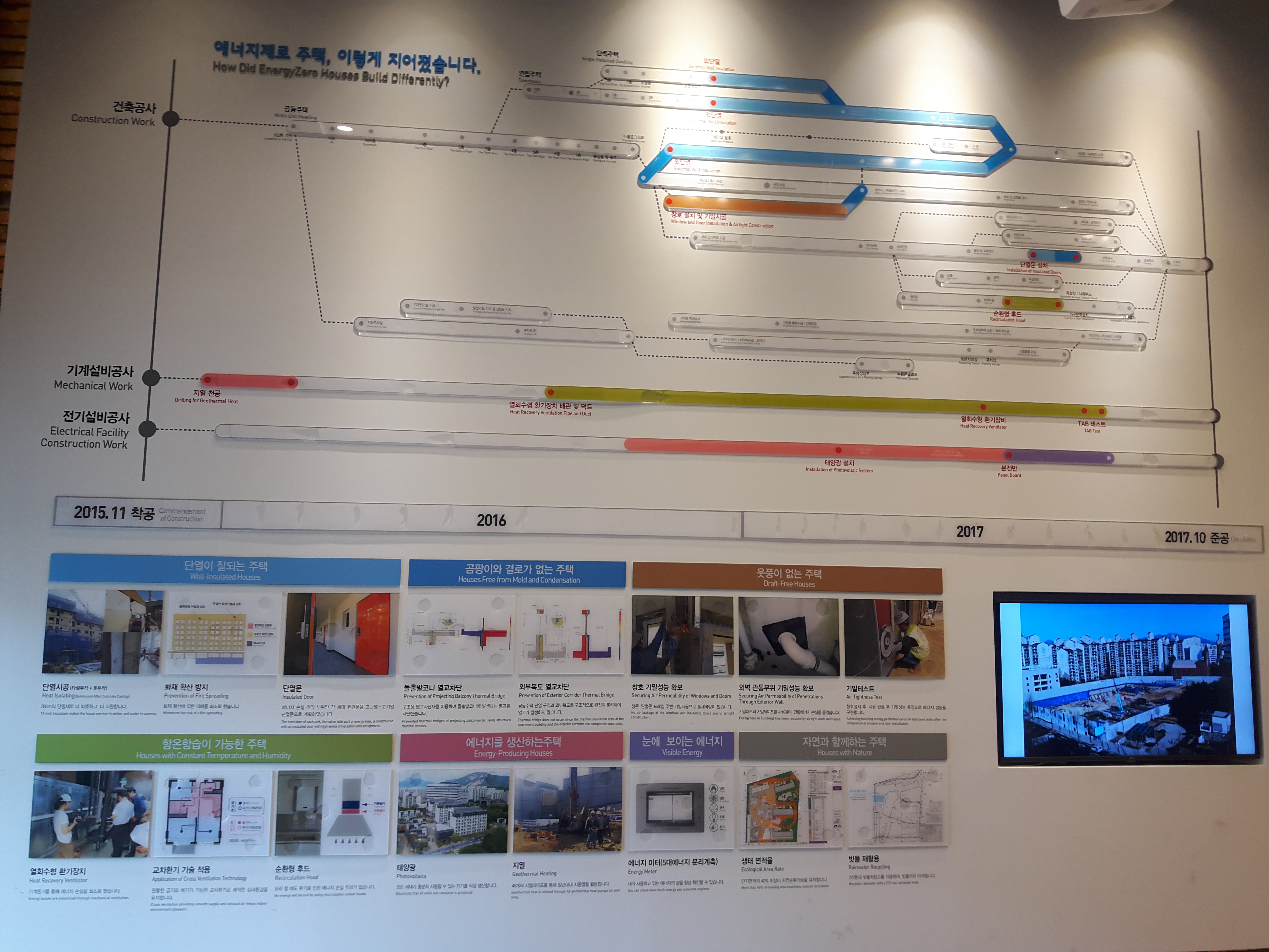 이건 노원 EZ주택에 적용된 신기술과, 연도별 착공스케쥴표에요. 오른쪽아래에는 건물을 짓는 과정을 타임랩스로 촬영했어요.