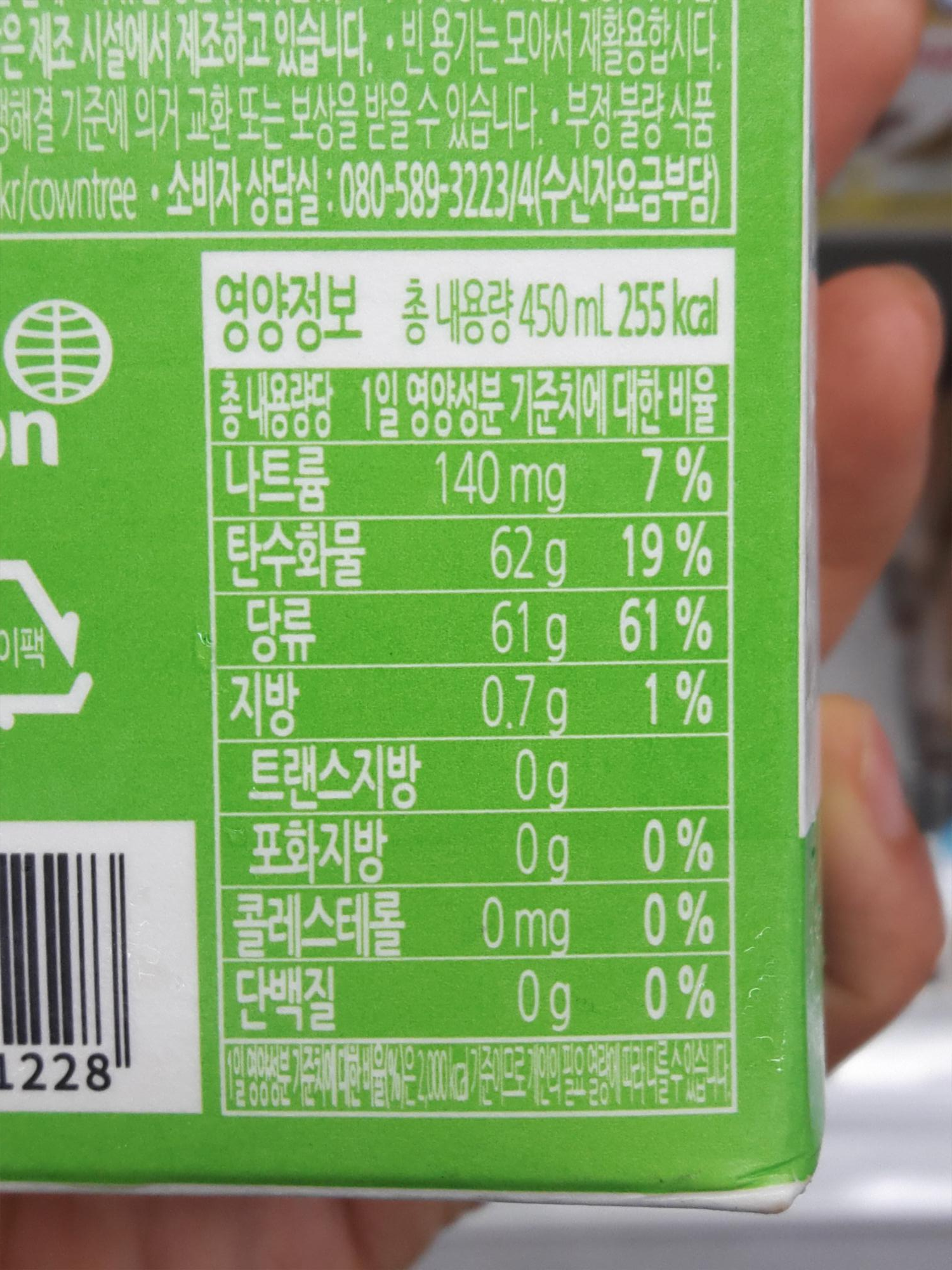 영양정보는 나트륨 140mg, 탄수화물 62g, 당류 61g, 지방 0.7g입니다. 단백질이 아예 없네요 ㅎㅎ;; 그리고 쥬스라 그런지 확실히 당류가 꽤 많이 들어있는 점이 눈에 띄네요.