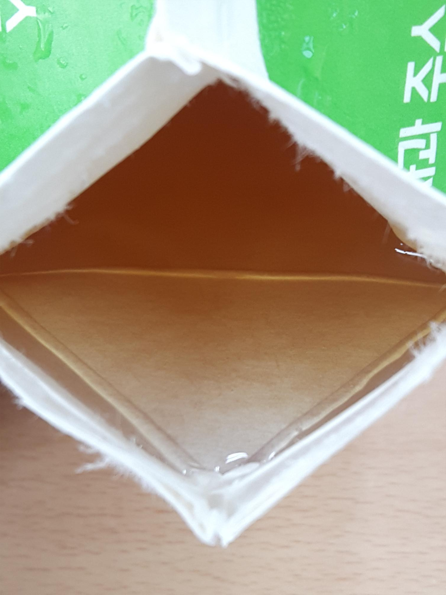 우유 포장패키지를 측면에서 열어보면 음료가 보이는데요. 음료색은 투명한 갈색액체입니다. 맛은 익숙한 사과맛이 납니다. 맛에는 큰 특징은 없고요. 무난한 사과주스맛입니다. 사과주스를 비교적 부담없는 가격에 먹을 수 있는 점이 좋은거 같아요.