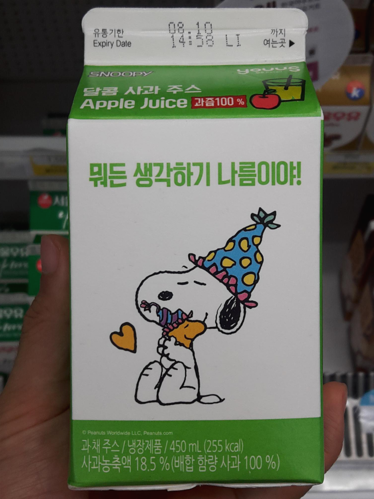 패키지디자인은 전면에 스누피 그림과 함께 좋은 응원글귀가 적혀 있네요. 스누피 우유류랑 동일한 레이아웃이고요. 스누피 그림이 다르고, 전경색이 사과를 연상시키는 연두색이네요.
