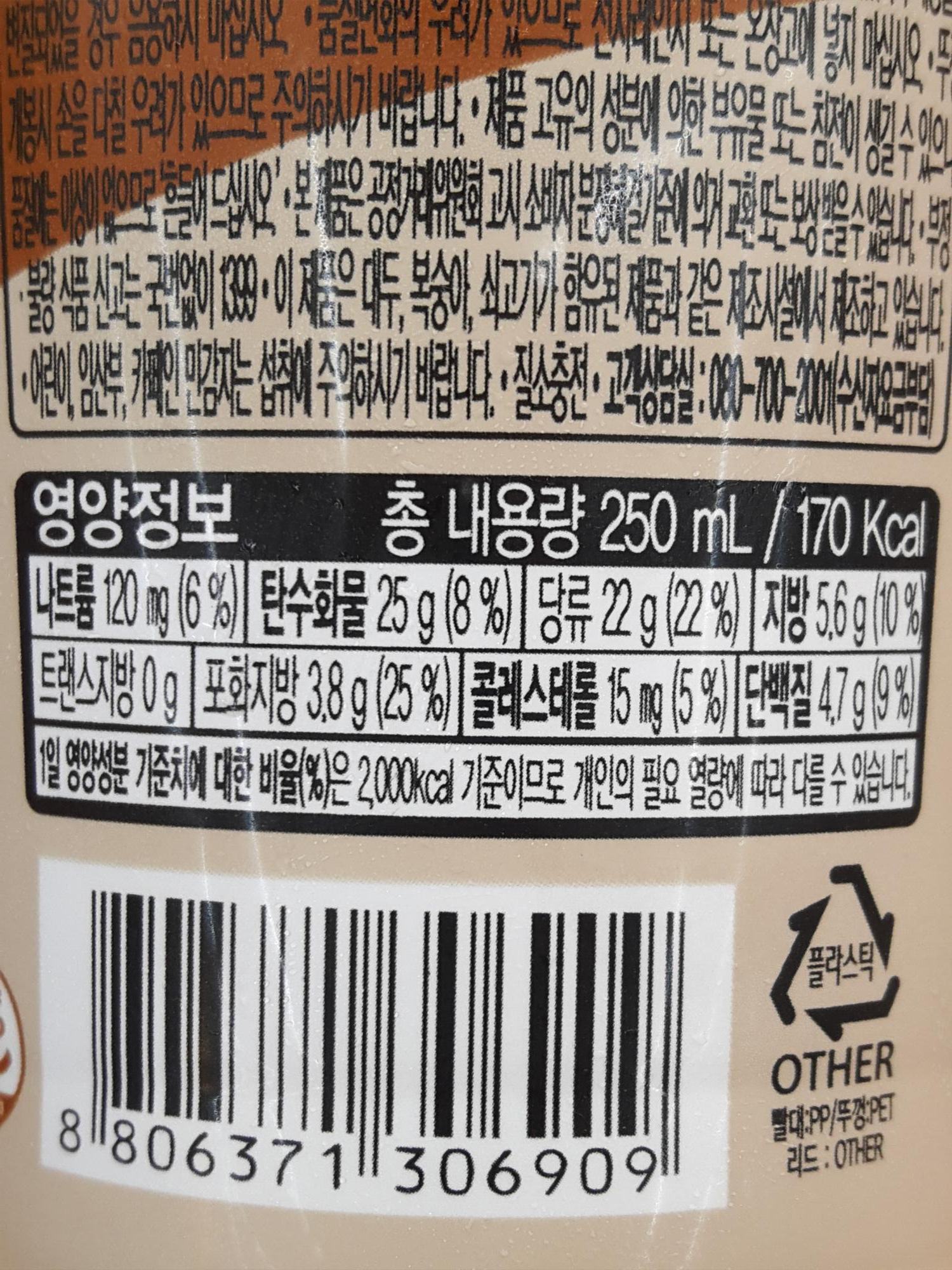 총 용량은 250ml이고, 칼로리는 170kcal 입니다. 이마트24편의점에서 8월 현재 1900원에 판매되고 있어요,