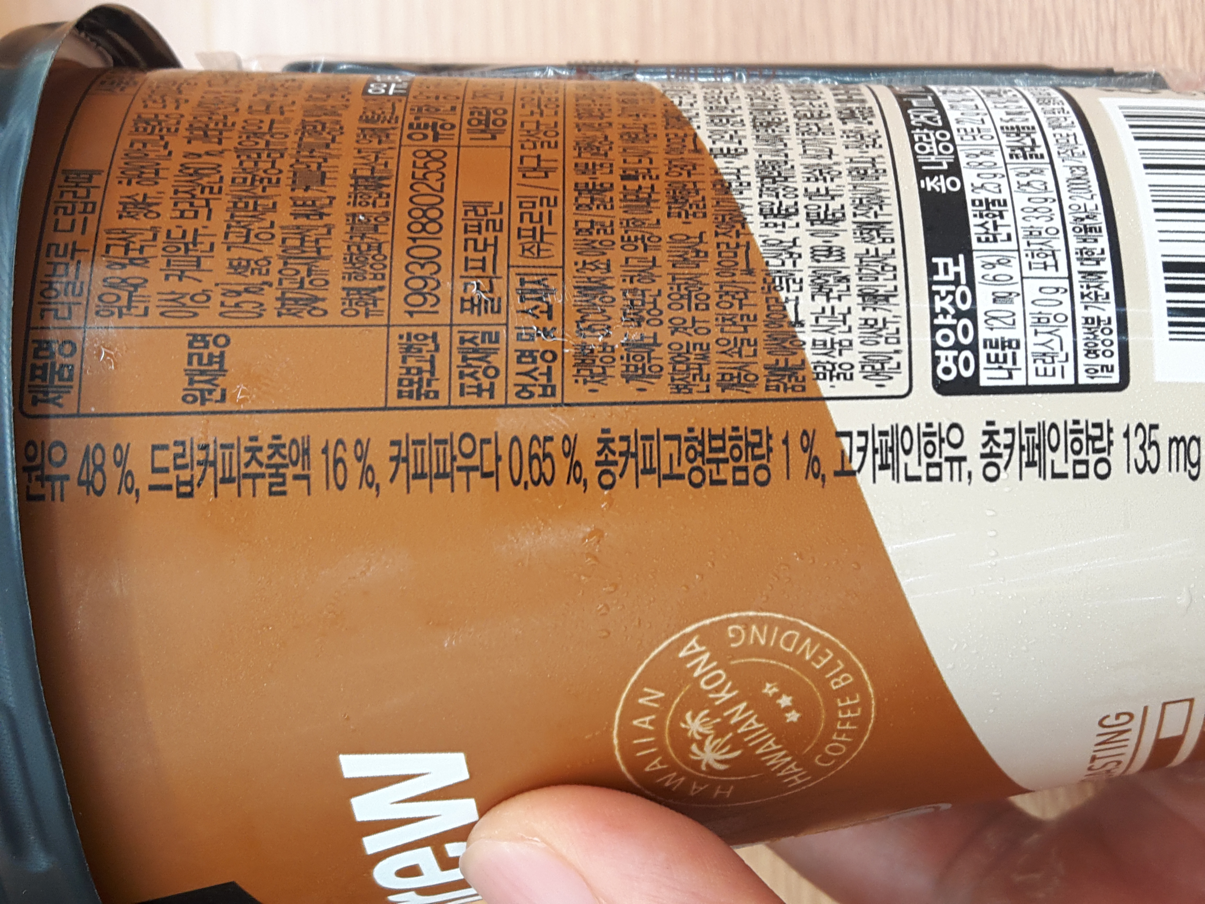 원재료는 원유 48%(국산), 정제수, 하와이안코나블랜딩 드립커피추출액 16%[고형분 2.4%이상, 커피원두: 브라질산 60%, 과테말라산 39.5%, 미국산(하와이안코나) 0.5%], 설탕, 가공전지분1(식물성크림)[유청(우유, 외국산), 정제가공유지(외국산), 레시틴], 커피파우다(커피고형분 95%이상, 인도산) 0.65%, 탈지분유, 탄산수소나트륨, 유화제, 합성향료(커피향), 혼합제제(규소수지, 유화제, 셀룰로스검)입니다.