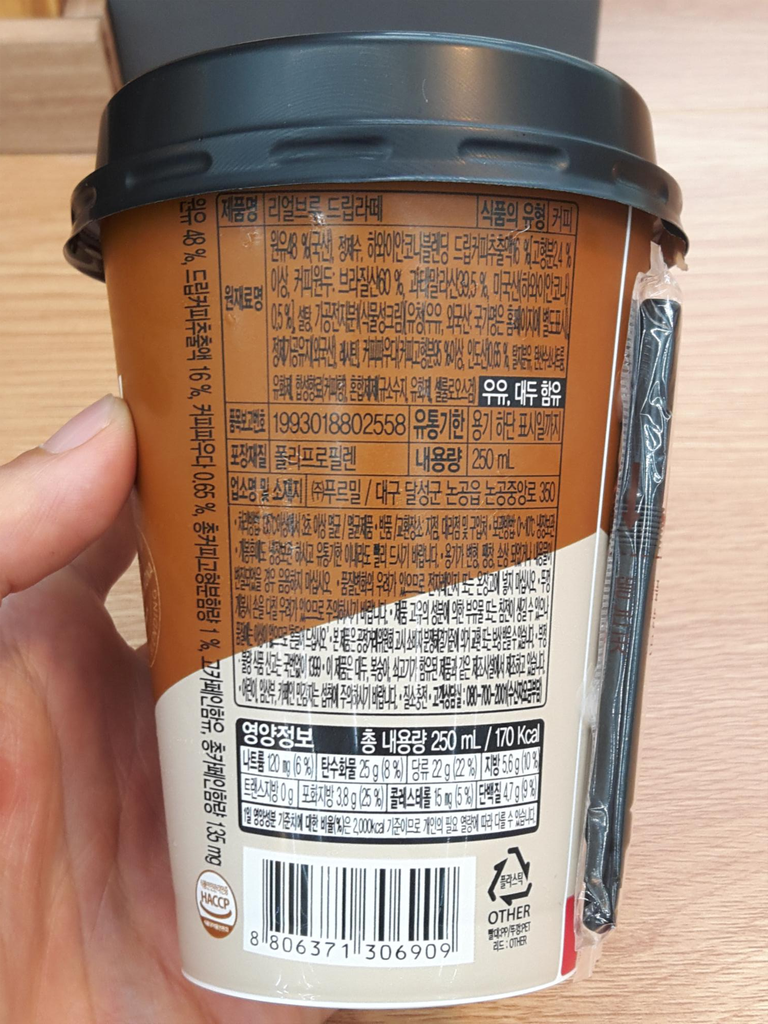 리얼브루 드립라떼도 콜드브루와 같은 푸르밀 대구 공장에서 만듭니다. 영양정보는 나트륨 120mg, 탄수화물 25g, 당류 22g, 지방 5.6g, 포화지방 3.8g, 콜레스테롤 15mg, 단백질 4.7g 입니다.