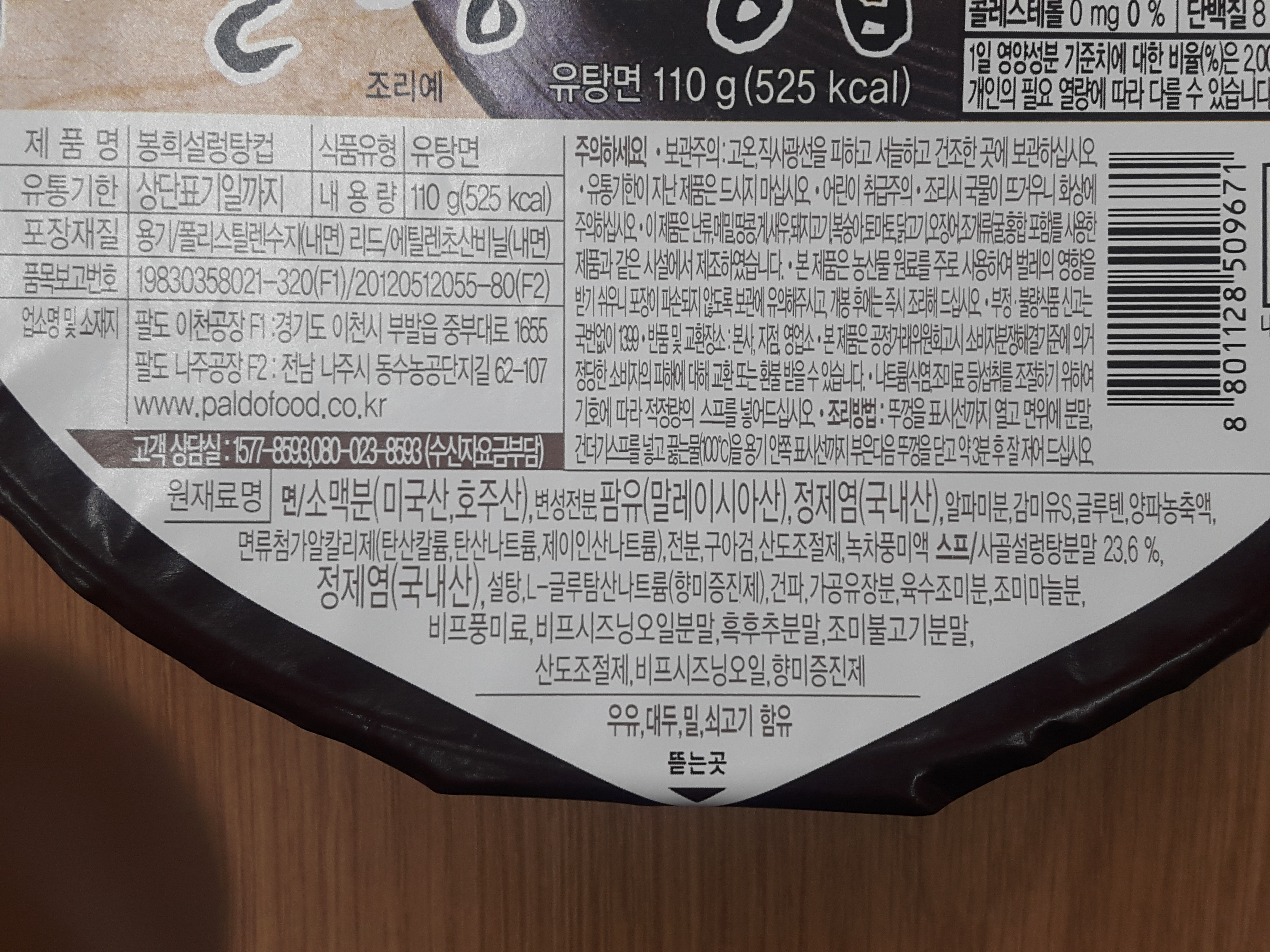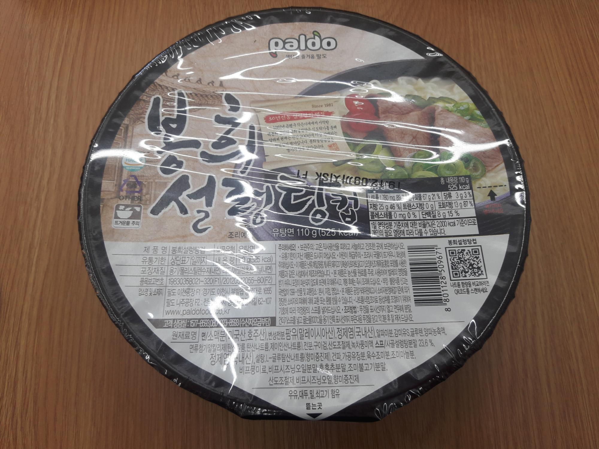 봉희설렁탕컵은 팔도 이천공장 및 나주공장에서 제조되고요. 원재료는 면은 소맥분(미국산, 호주산), 변성전분, 팜유(말레이시아산), 정제염(국내산), 알파미분, 감미유S, 글루텐, 양파농축액, 면류첨가알칼리제(탄산칼륨, 탄산나트륨, 제이인산나트륨), 전분, 구아검, 산도조절제, 녹차풍미액이고요. 스프 원재료는 사골설렁탕분말 23.6%, 정제염(국내산), 설탕, L-글루탐산나트륨(향미증진제), 건파, 가공유장분, 육수조미분, 조미마늘분, 비프풍미료, 비프시즈닝오일분말, 흑후추분말, 조미불고기분말, 산도조절제, 비프시즈닝오일, 향미증진제가 들어갑니다.