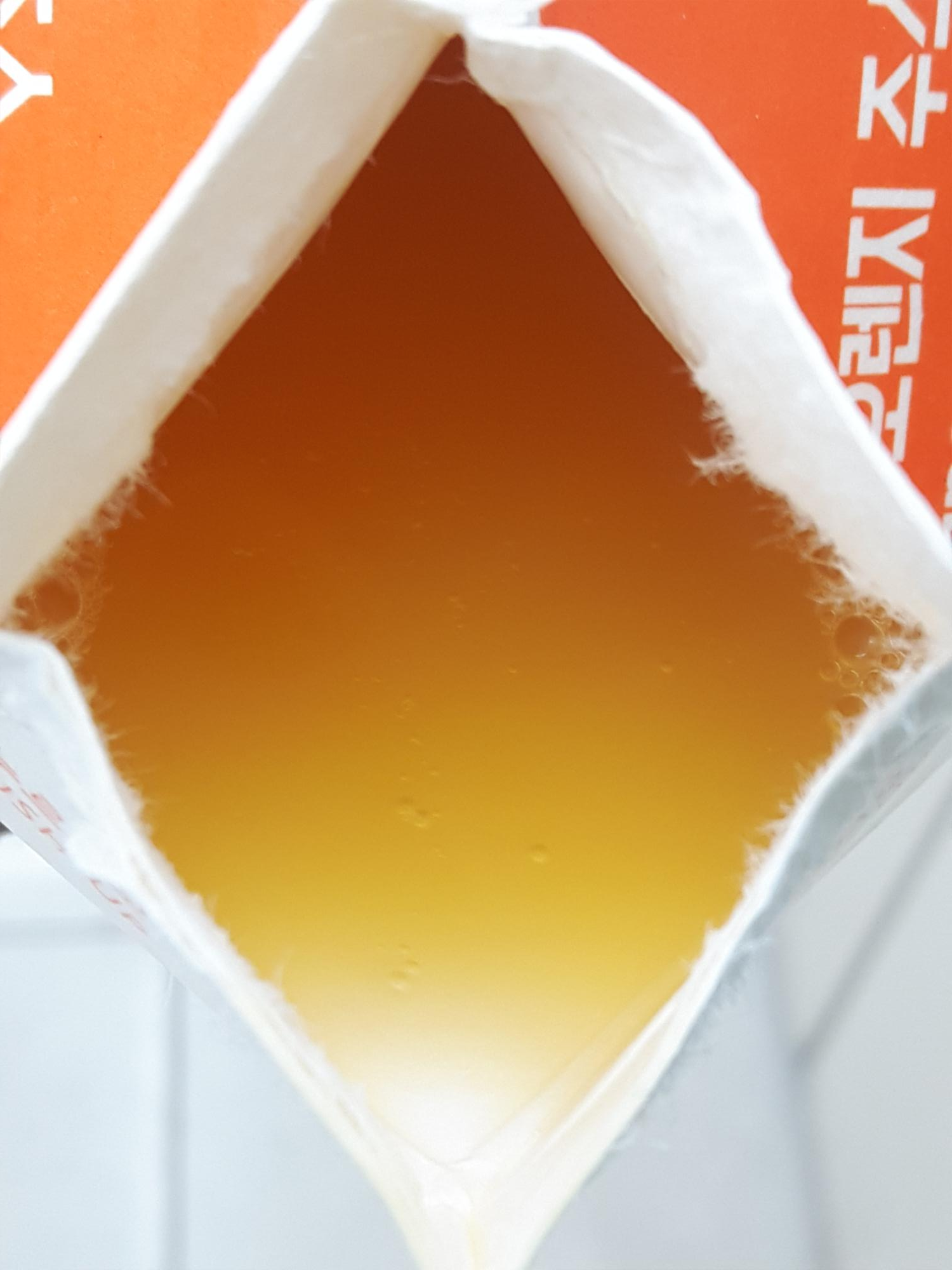 종이팩을 열면 반투명 오렌지색의 오렌지주스가 모습을 드러냅니다. 맛은 기준에 먹던 병에 들어있는 100% 오렌지 주스 맛하고 비교했을때 오렌지의 신맛과 떫은맛이 덜하고 좀 더 산뜻한 맛이 나는거 같아요. 아마 사과과즙을 잘 배합해서 그런가봐요. 일반적인 오렌지주스는 개인적으로 너무 셔서 먹기가 좀 안좋았는데, 유어스 오렌지 주스는 먹기가 좀 더 편해진거 같아서 마음에 드네요.