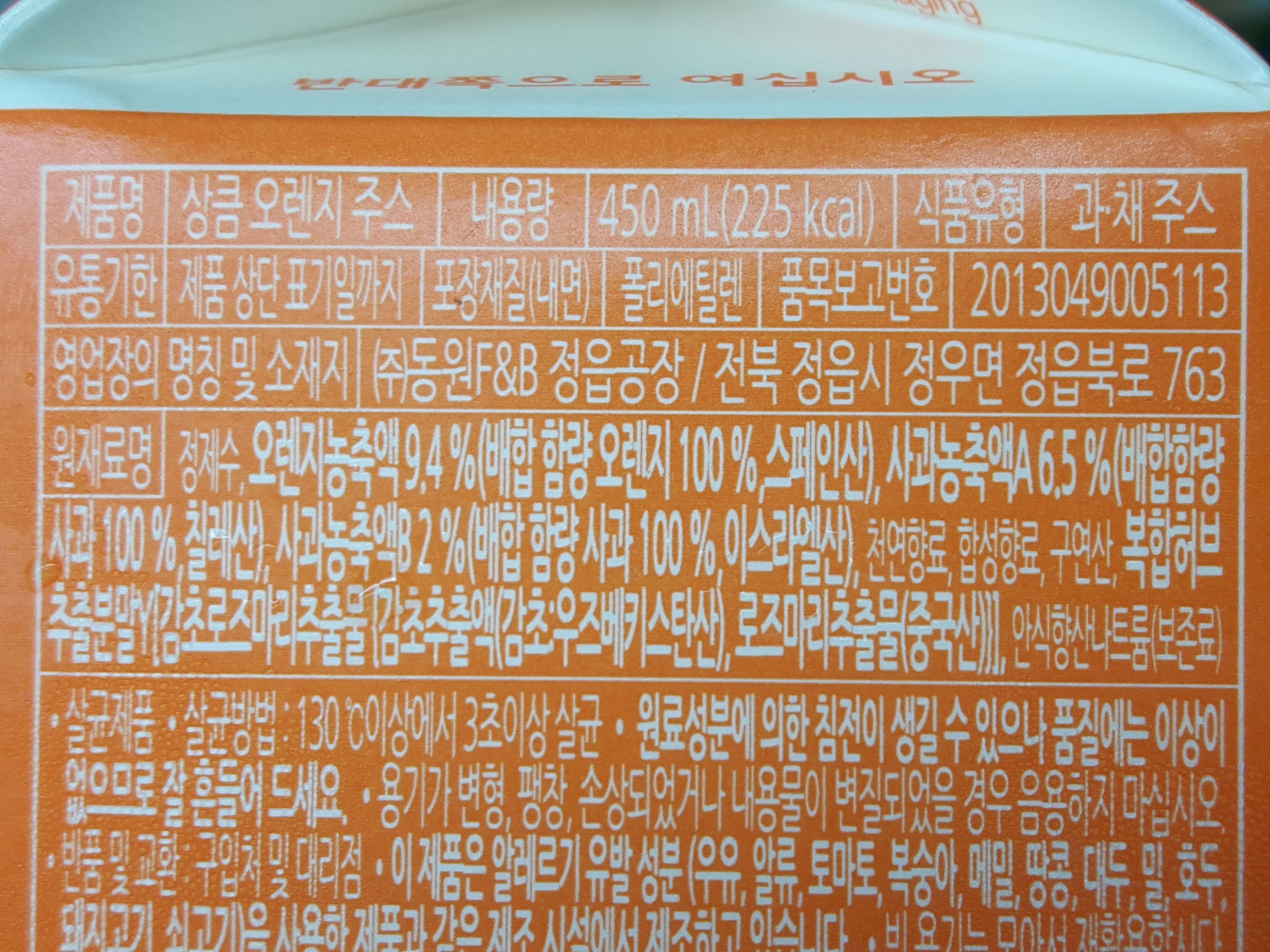 제조원은 동원F&B 정읍공장이고요. 원재료는 정제수, 오렌지농축액 9.4%(배합 함량 오렌지 100%, 스페인산), 사과농축액A 6.5%(배합 함량 사과 100%, 칠레산), 사과농축액B 2%(배합 함량 사과 100%, 이스라엘산), 천연향료, 합성향료, 구연산, 복합허브추출분말Y[감초로즈마리추출물{감초추출액(감초:우즈베키스탄산), 로즈마리추출물(중국산)}], 안식항산나트륨(보존료) 입니다.