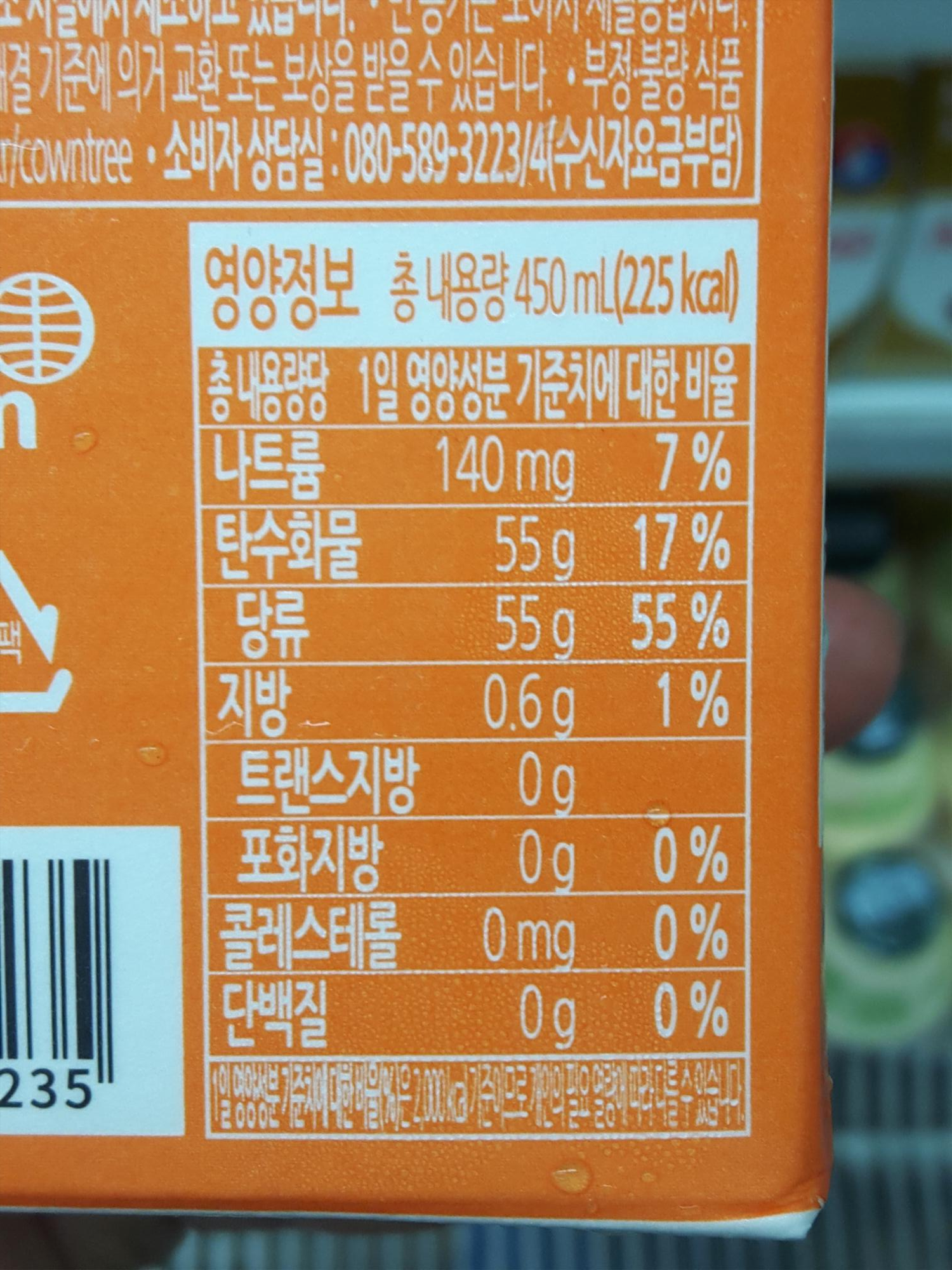 스누피 상큼 오렌지 주스의 영양정보는 나트륨 140mg, 탄수화물 55g, 당류 55g, 지방 0.6g 입니다. 주스라 그런지 당이 꽤 많은 편이네요.