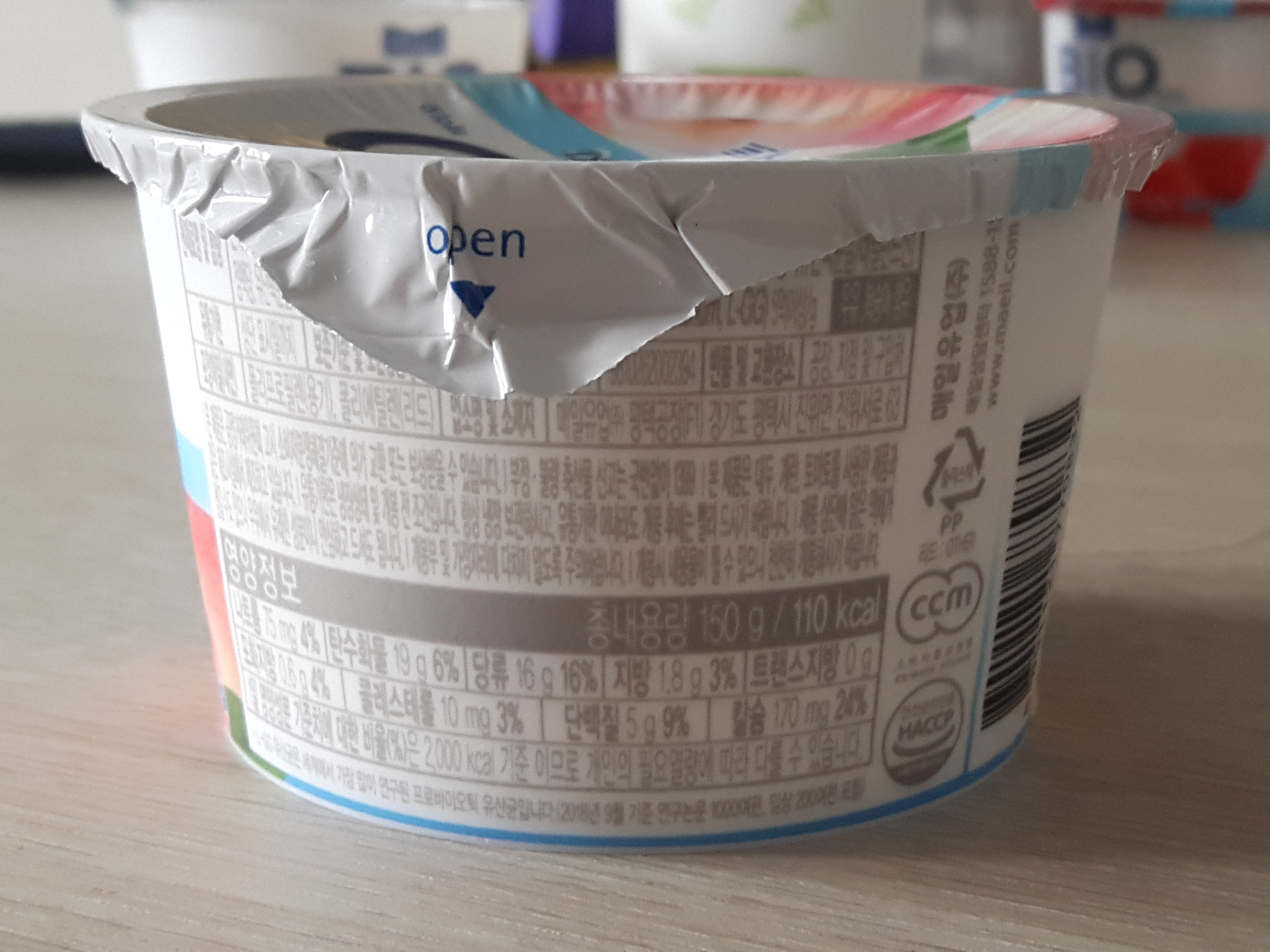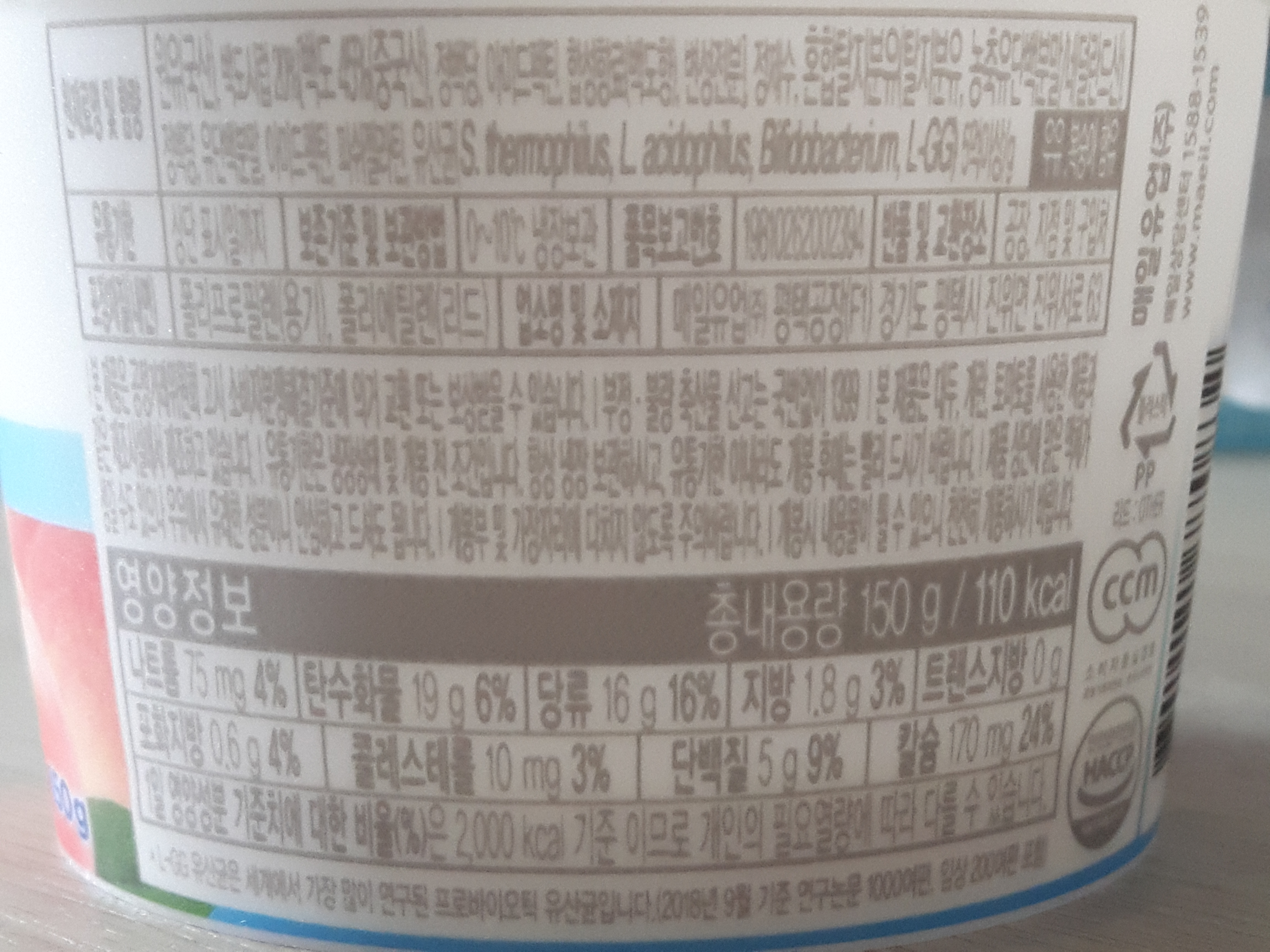 매일 바이오 프로바이오틱 백도요거트의 총 용량은 150g이고 칼로리는 110kcal 입니다. 백도가 9% 들어가 있어요.