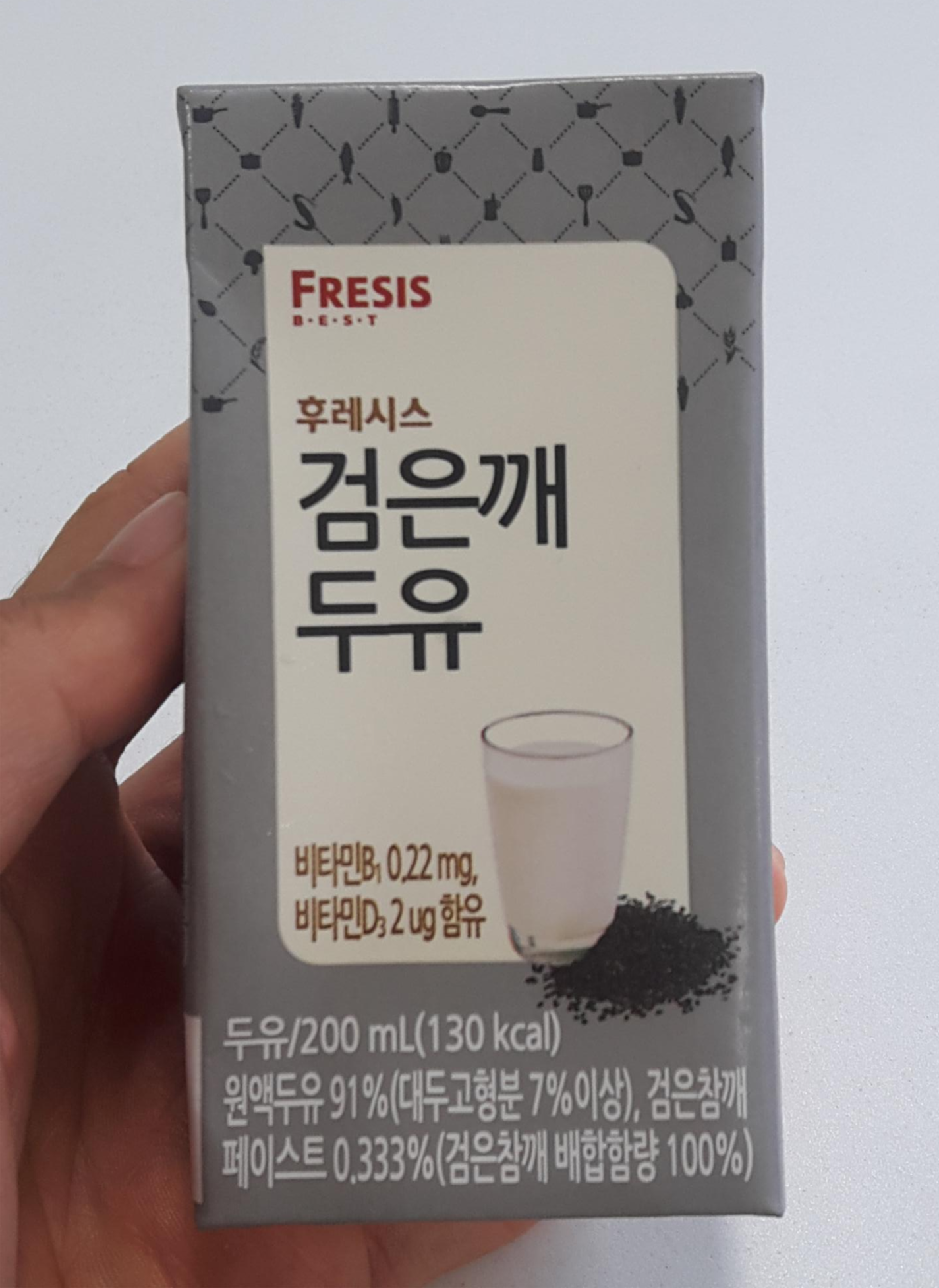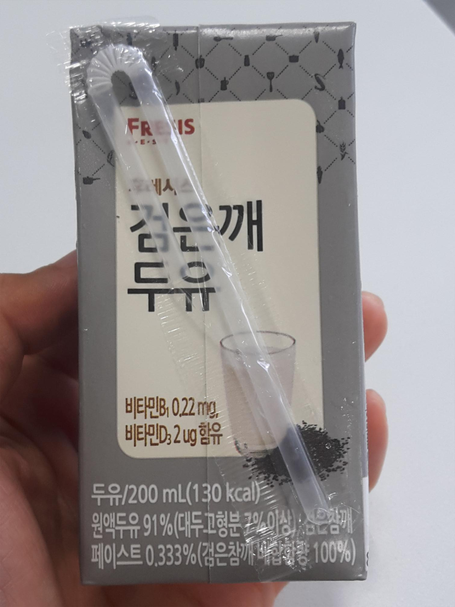 두유의 용량은 200ml이고 칼로리는 130kcal 입니다. 원액두유가 91%(대두고형분 7% 이상), 검은참깨 페이스트 0.333%(검은참깨 배합함량 100%) 입니다. 포장 패키지에도 나와있듯 비타민B1이 0.22mg, 비타민D3가 2ug 함유되어 있어요.