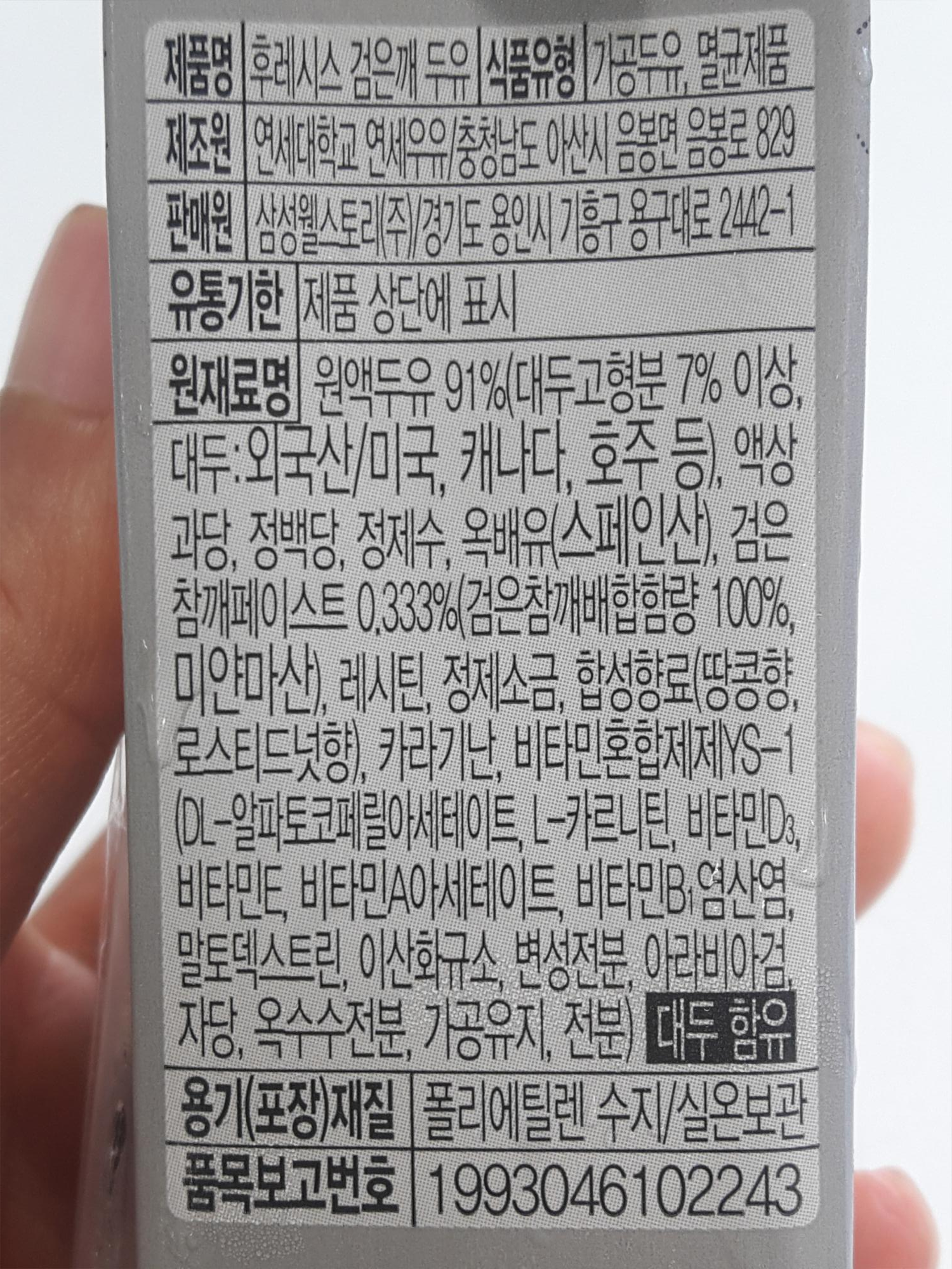 오 후레시스 검은깨 우유는 연세대학교 연세우유에서 제조하고요. 삼성 웰스토리에서 판매했네요. 오 쟁쟁한 회사에서 만들고 판매하는군요. 원재료는 원액두유 91%(대두고형분 7% 이상, 대두:외국산/미국, 캐나다, 호주 등), 액상과당, 정백당, 정제수, 옥배유(스페인산), 검은참깨페이스트 0.333%(검은참깨배합함량 100%, 미얀마산), 레시틴, 정제소금, 합성향료(땅콩향, 로스티드넛향), 카라기난, 비타민혼합제제YS-1(DL-알파토코페릴아세테이트, L-카르니틴, 비타민D3, 비타민E, 비타민A아세테이트, 비타민B1염산염, 말토덱스트린, 이산화규소, 변성전분, 아라비아검, 자당, 옥수수전분, 가공유지, 전분) 입니다.