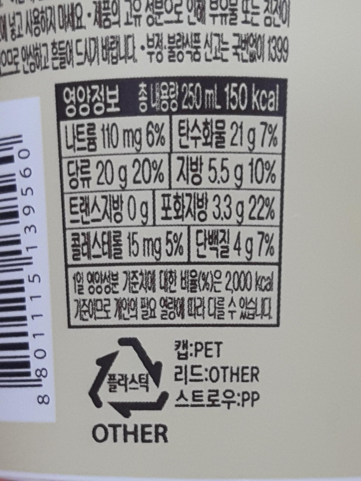 용량은 250ml이고 칼로리는 150kcal 입니다. 총 카페인 함량은 117mg 이고, 원유 54%, 커피추출액(고형분 3% 이상) 26% 들어있습니다.