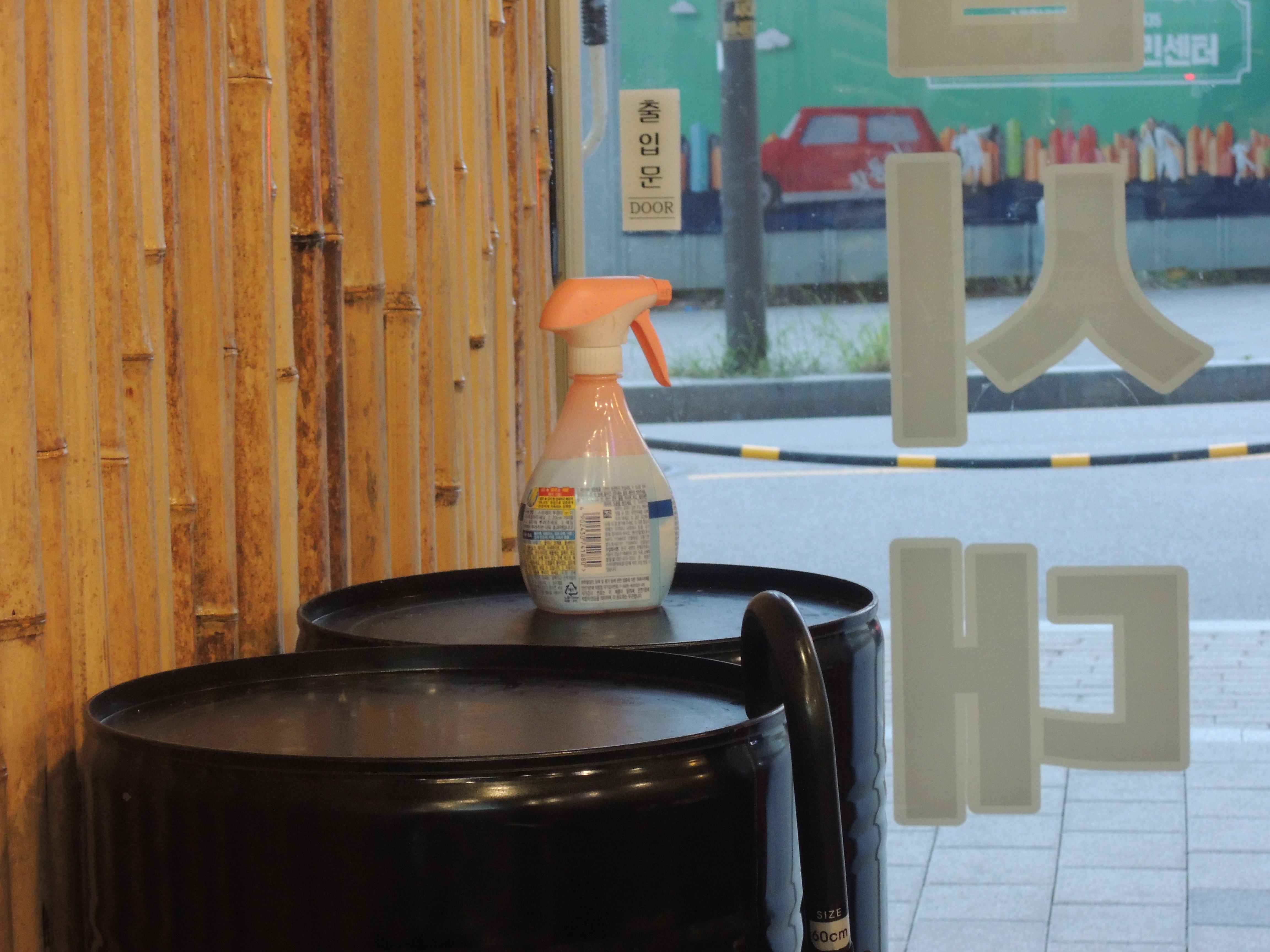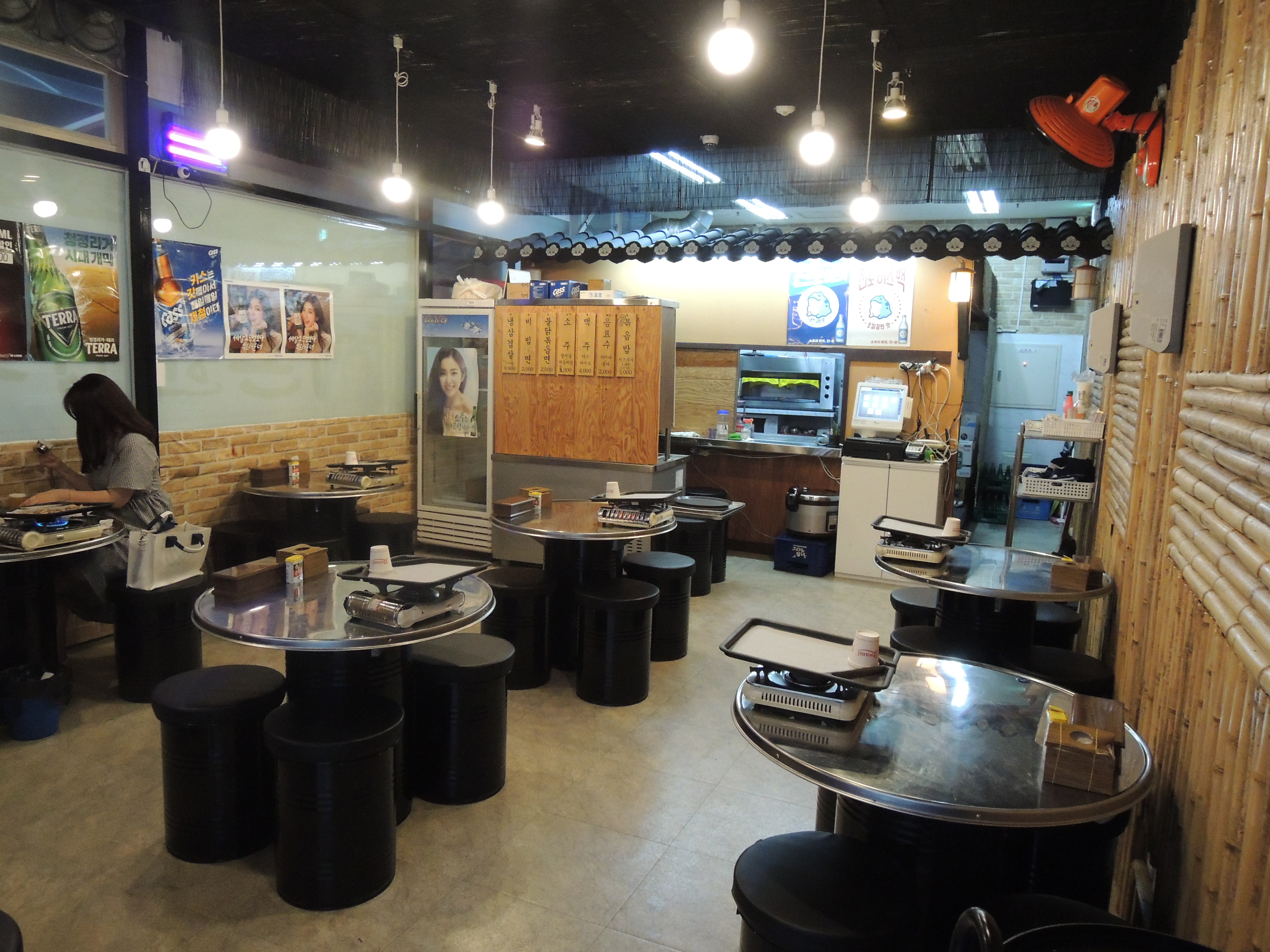 테이블은 사진과 같고요. 의자안쪽에 고기냄새가 옷에 배지않게 따로 보관할수 있게 공간이 있어요. 그리고 나갈때 고기냄새제거용 페브리즈도 마련되어 있고요.