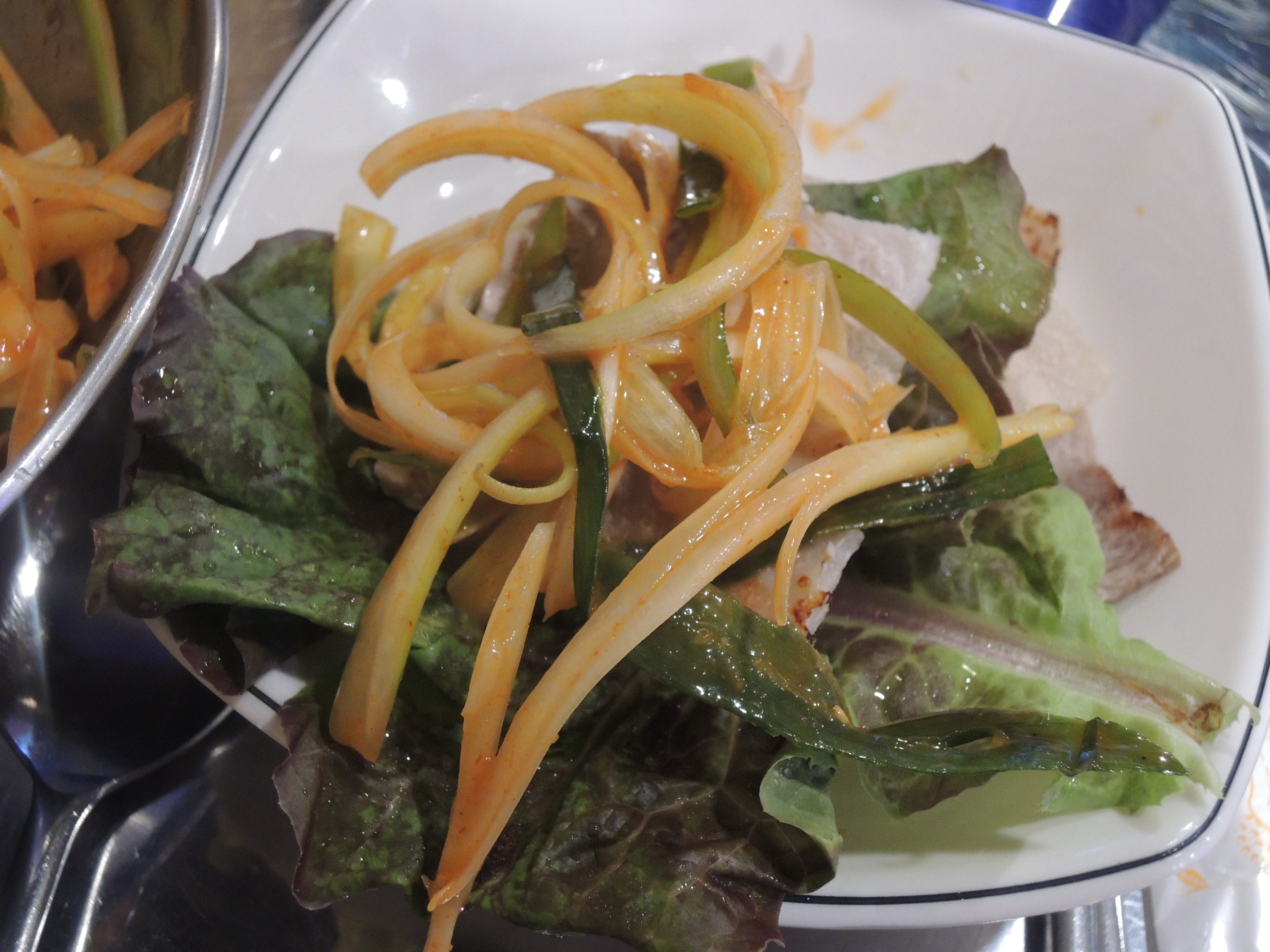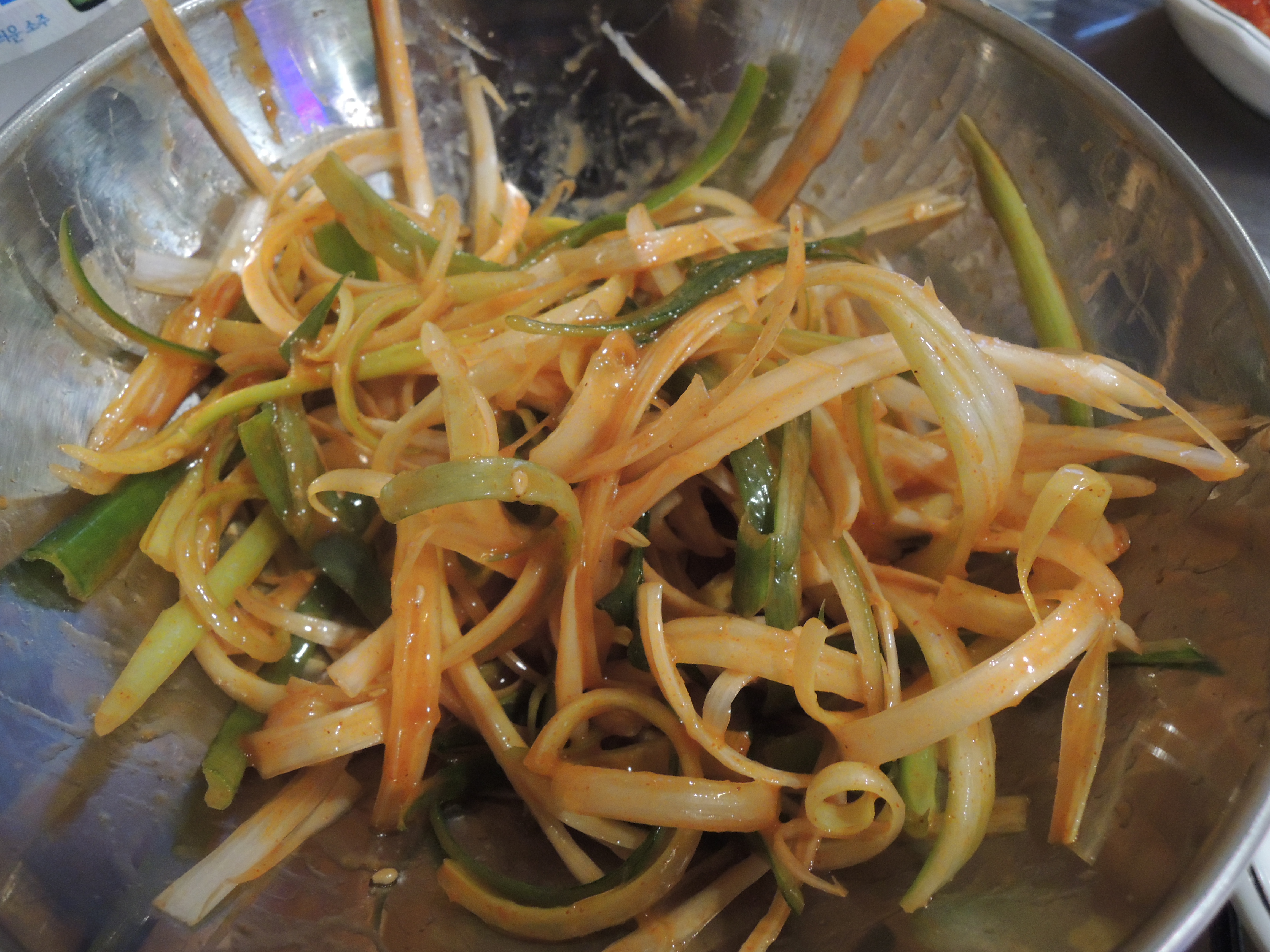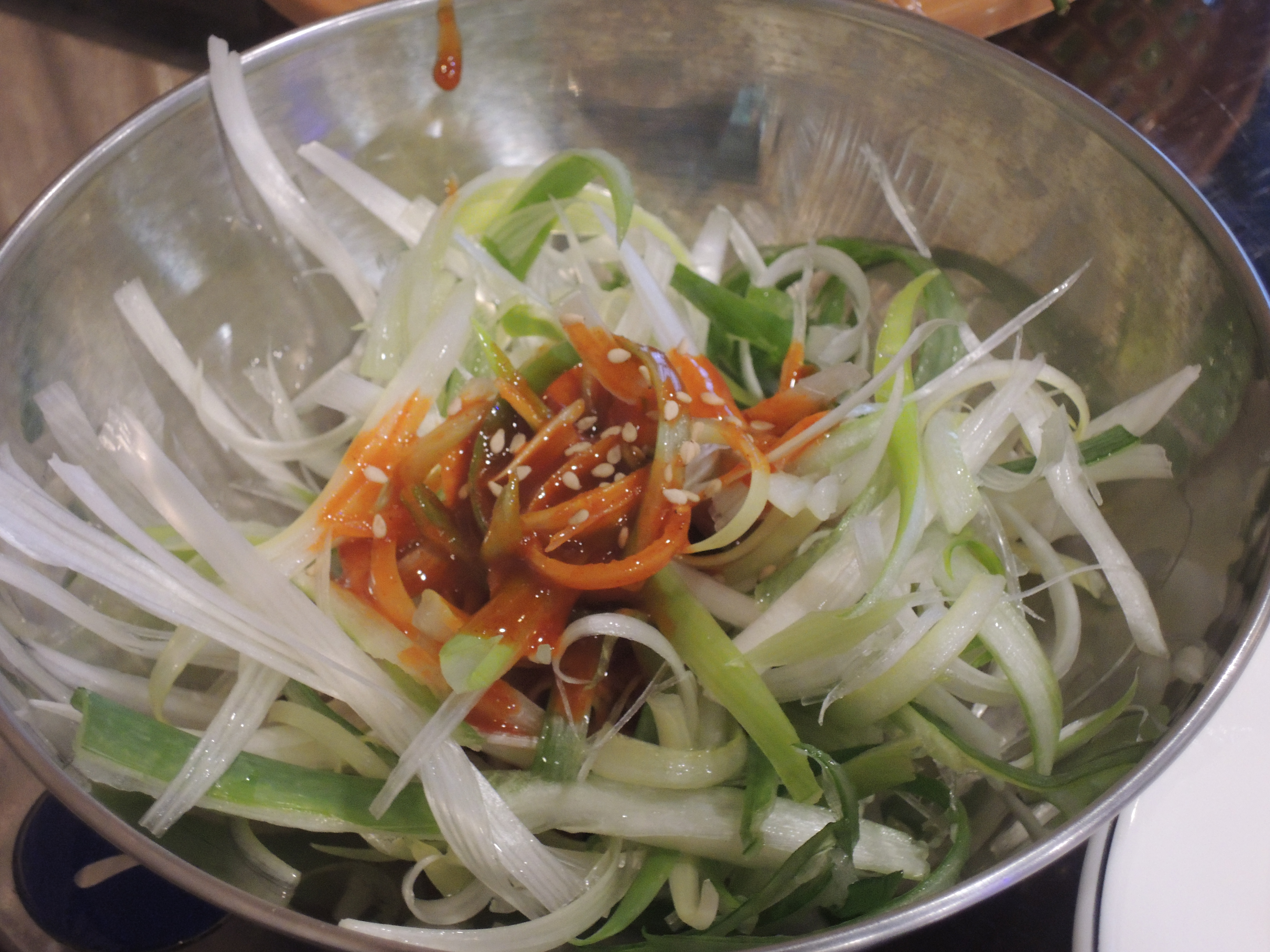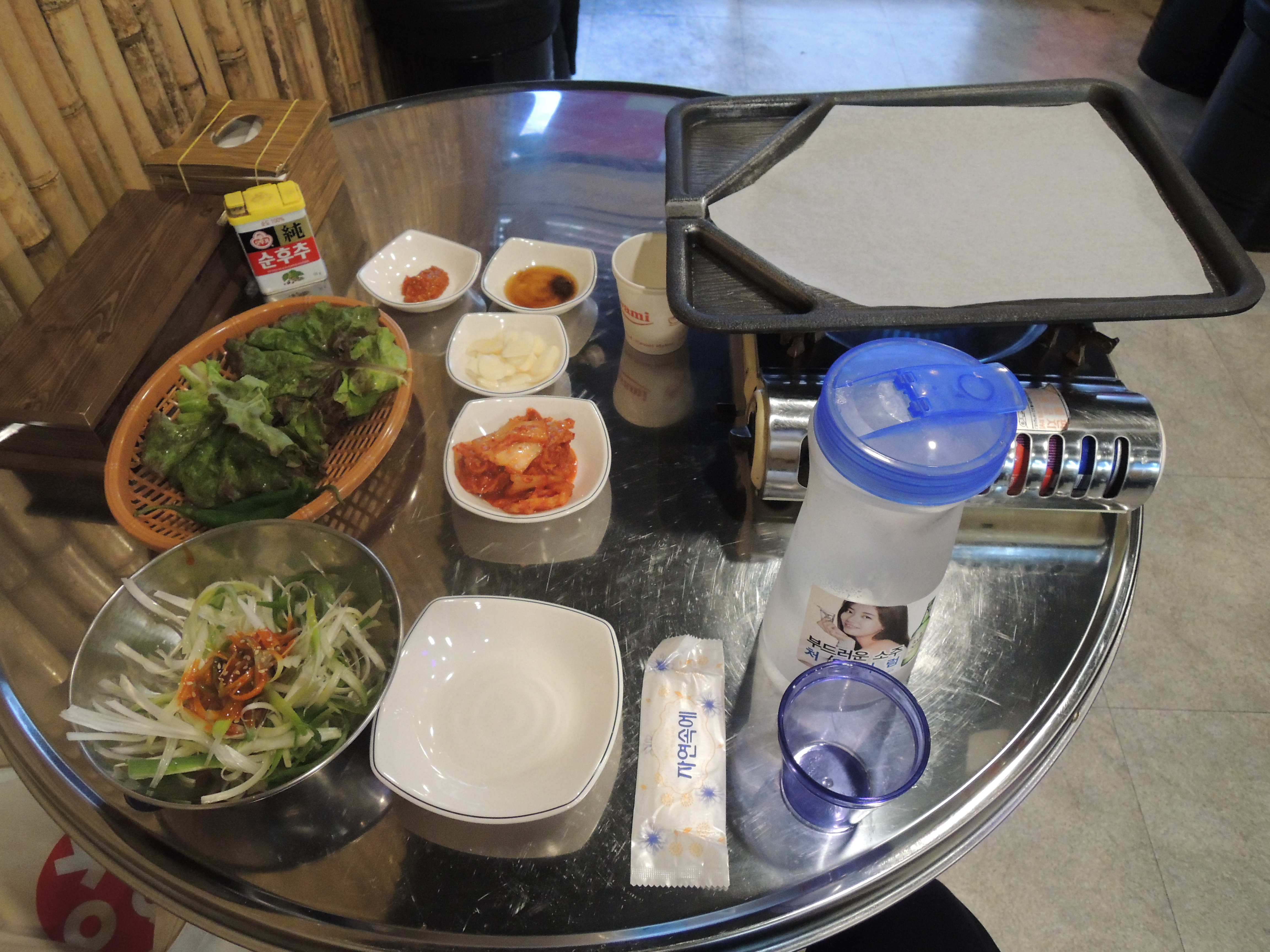파채, 김치, 마늘, 기름장, 쌈장, 상추, 매운고추가 세팅됩니다.