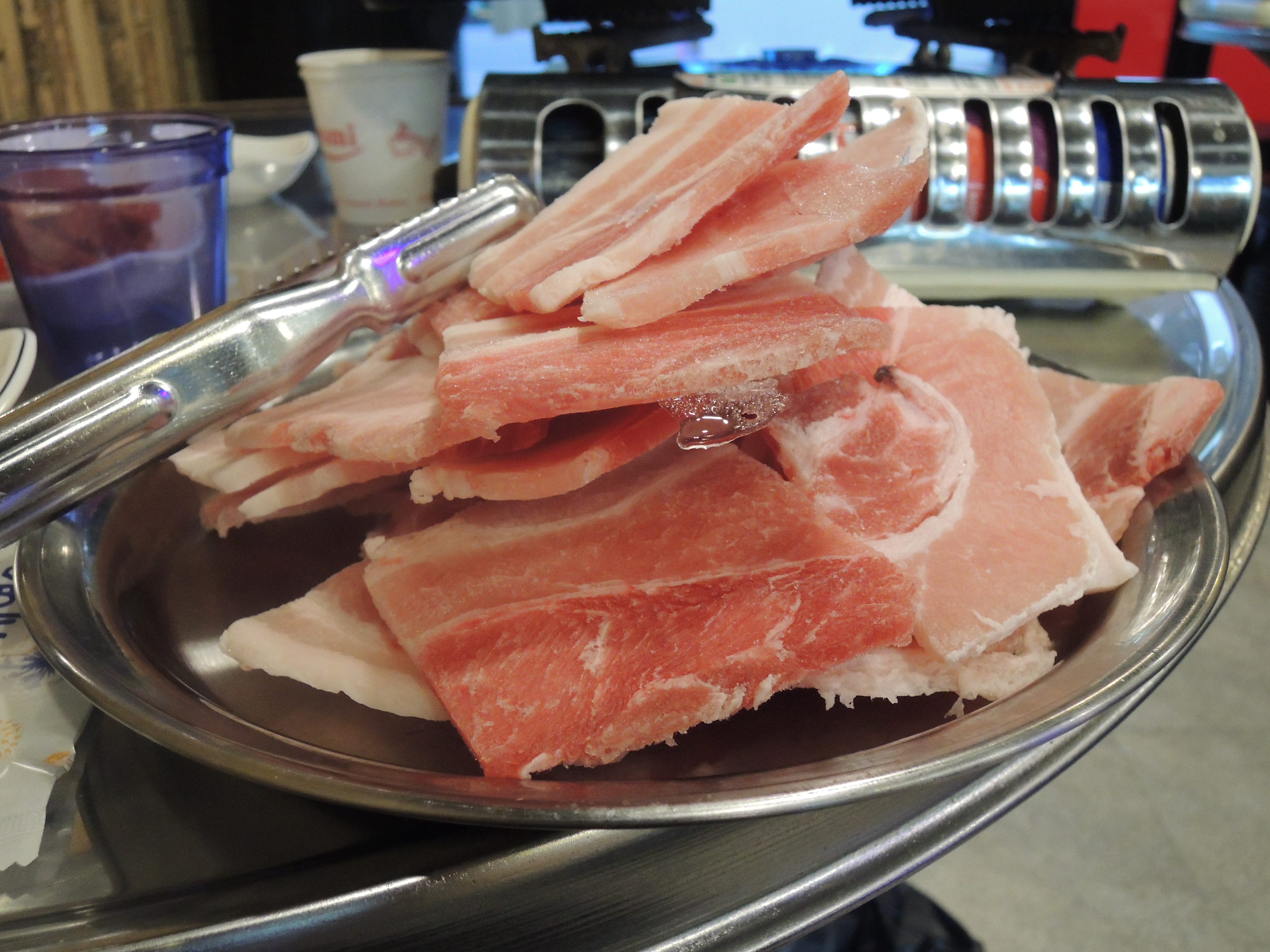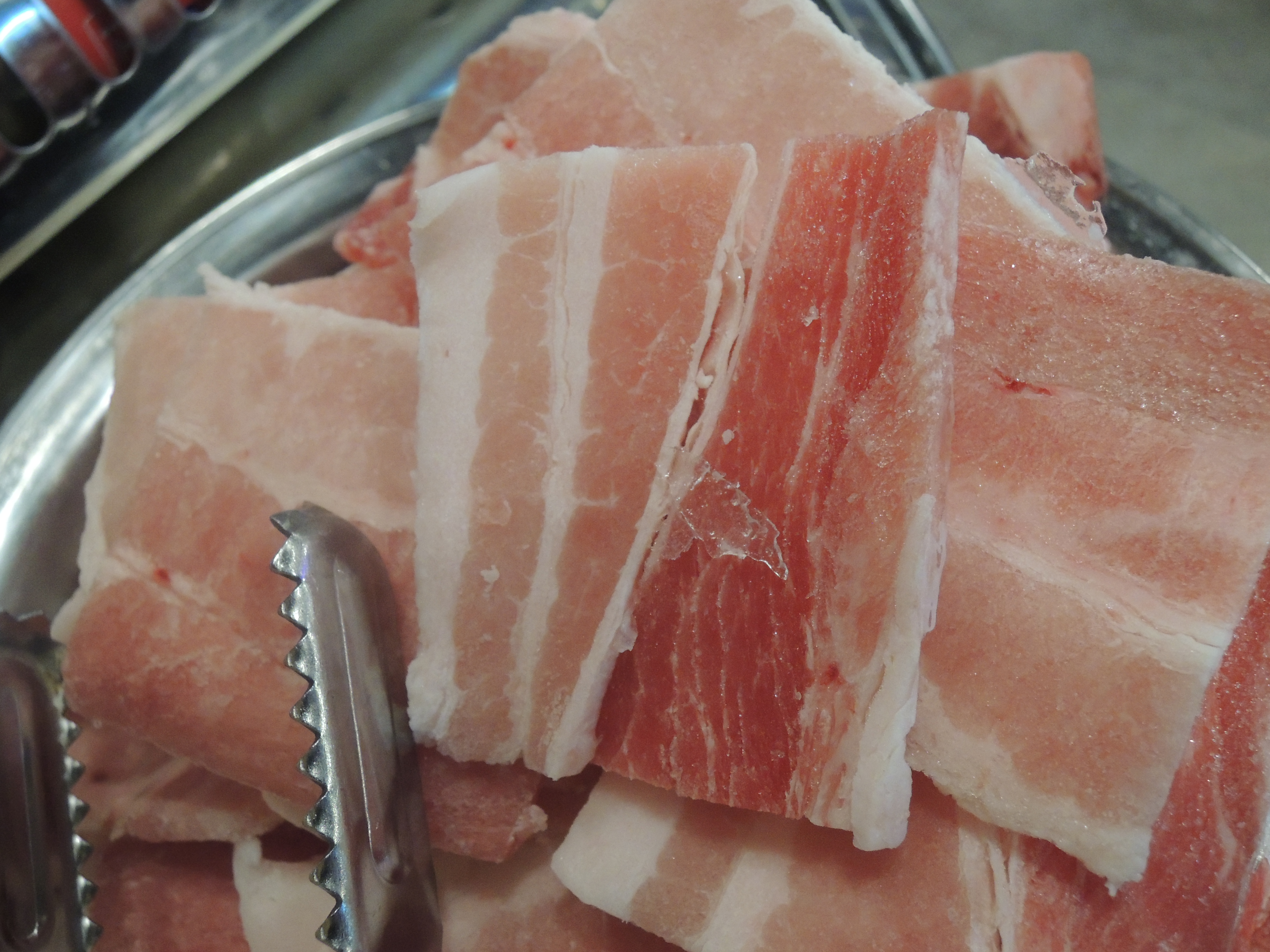 이후에 이렇게 고기를 가져다주세요. 냉동삼겹살이라 살짝 얼어있는게 보입니다. 근데 막 많이 얼진않고 딱 적당히 얼어있는거 같아요. 냉동삼겹살은 메뉴판에 독일산 쓴다고 나와있고요.