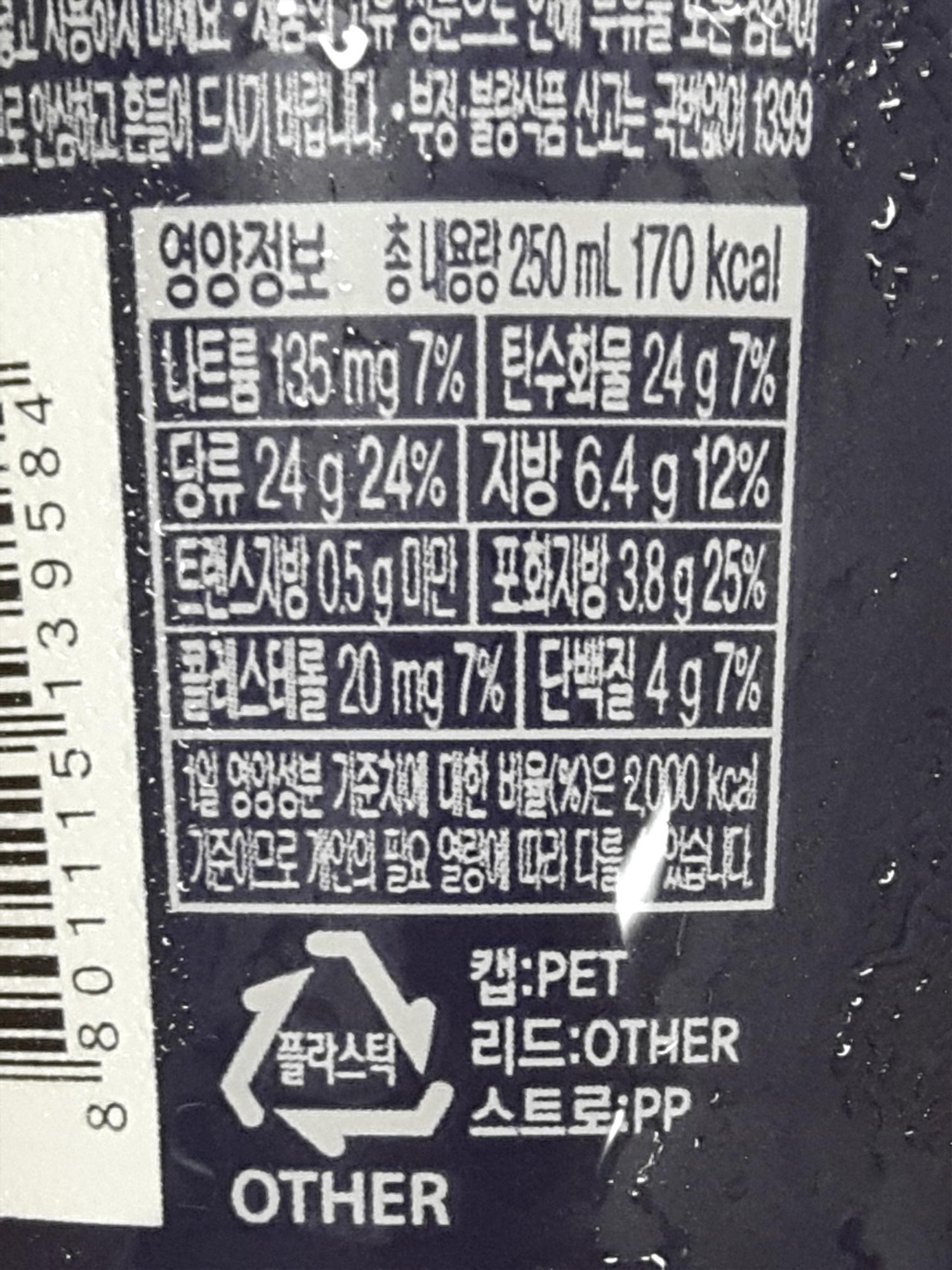 용량은 마일드와 같은 250ml이고, 칼로리는 170kcal 입니다. 카페인함량은 110mg이고요. 원유 50%, 커피고형분(함량 0.8%이상, 초콜렛류) 1% 들어갑니다.