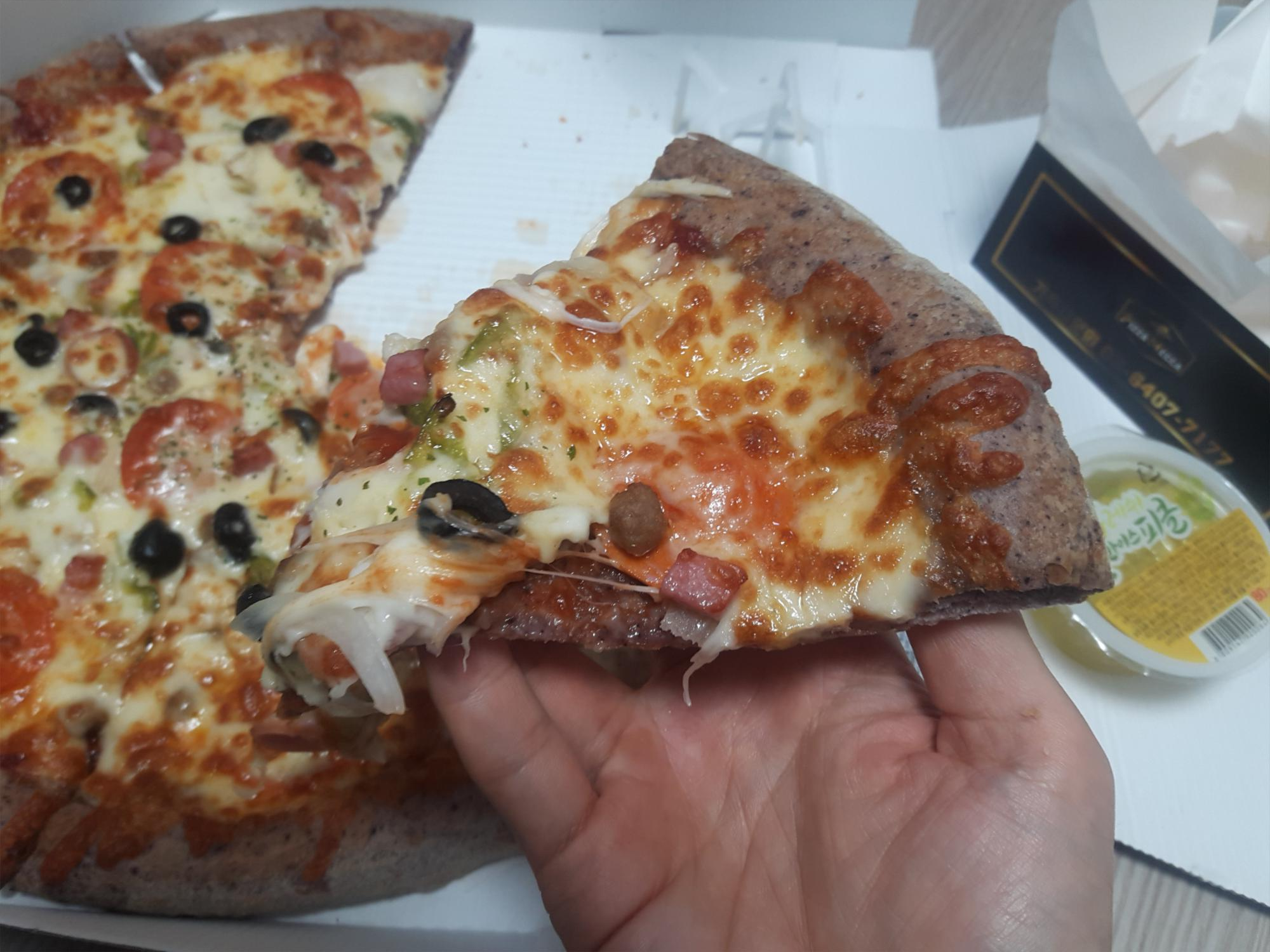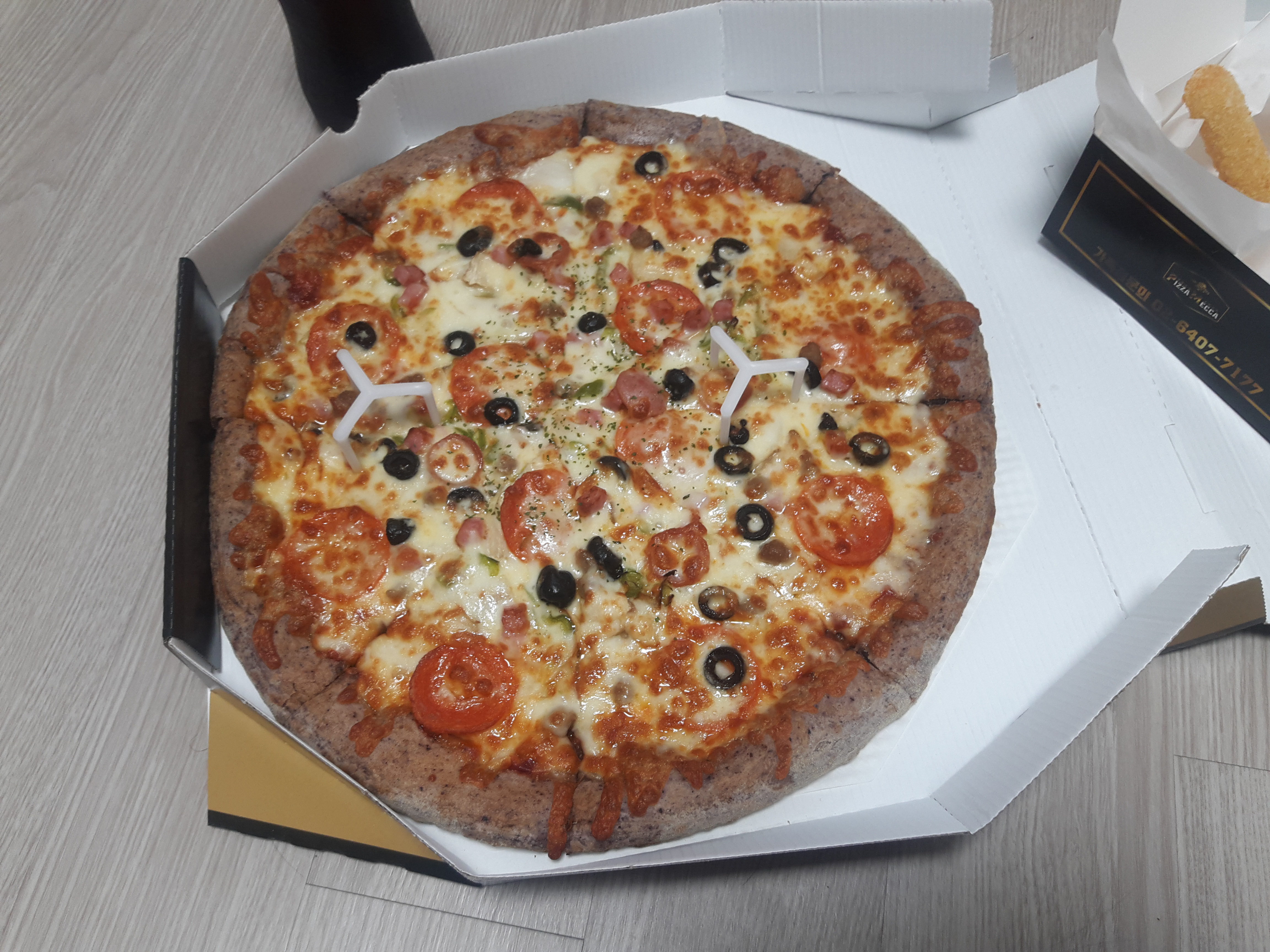 도우가 검은쌀로 만들었는지 쫄깃하니 맛있더라고요. 일반적인 밀가루도우는 저 끝부분이 퍽퍽한데, 메카에서 주문한 피자는 쫄깃하고 고소해서 씹는맛이있었어요. 거기다 위에 치즈스틱까지 얹어먹으니 존맛탱 ㅎㅎ
