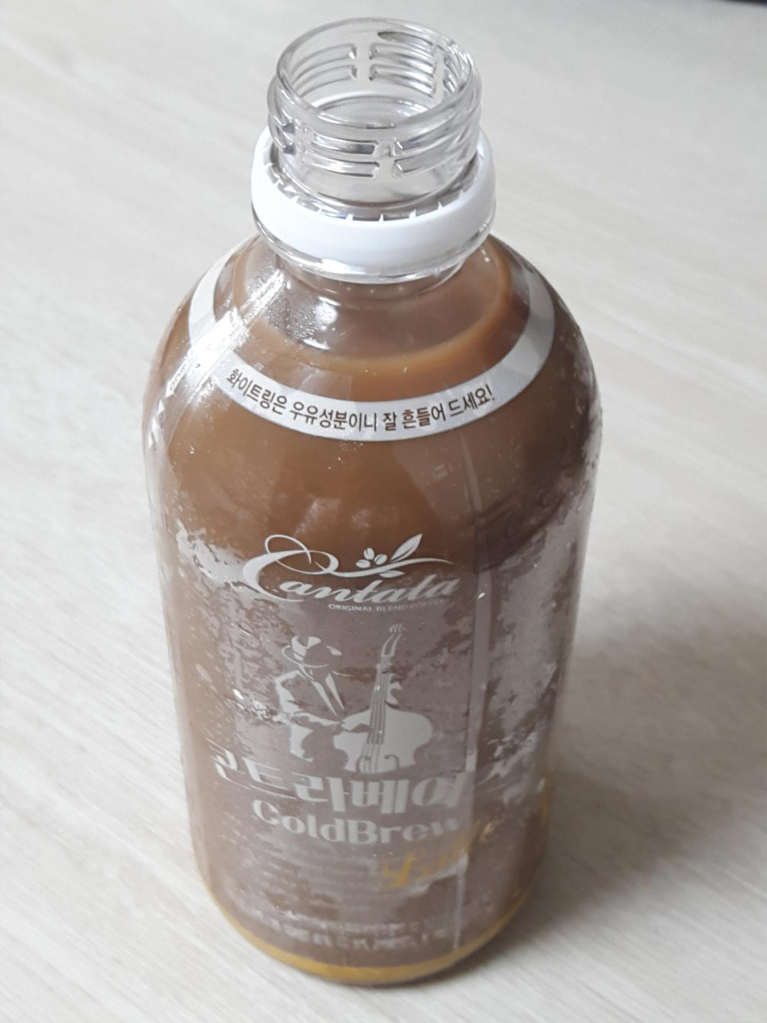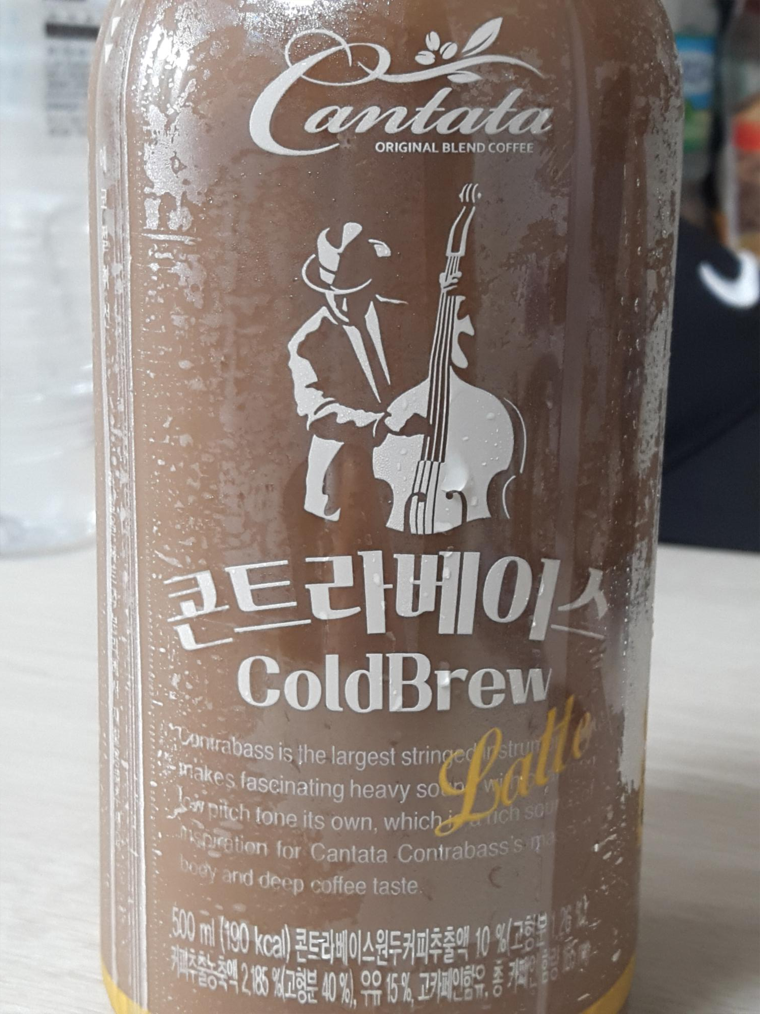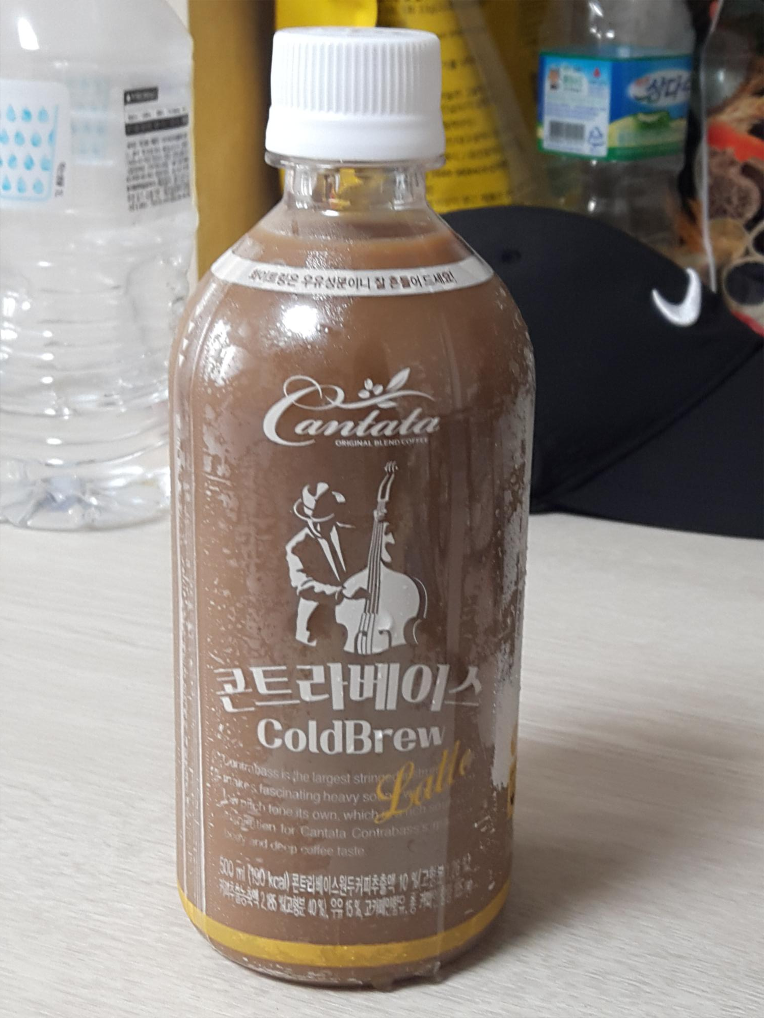 칸타타 콘트라베이스 콜드브루 라떼는 플라스틱 병에 담겨 있고요. 병이 투명해서 안에 음료가 보입니다. 용량은 500ml 대용량이고 칼로리는 190kcal입니다. 콘트라베이스 원두커피 추출액 10%(고형분 1.26%), 커피추출농축액 2.185%(고형분 40%), 우유 15%, 카페인함량은 165mg 입니다.