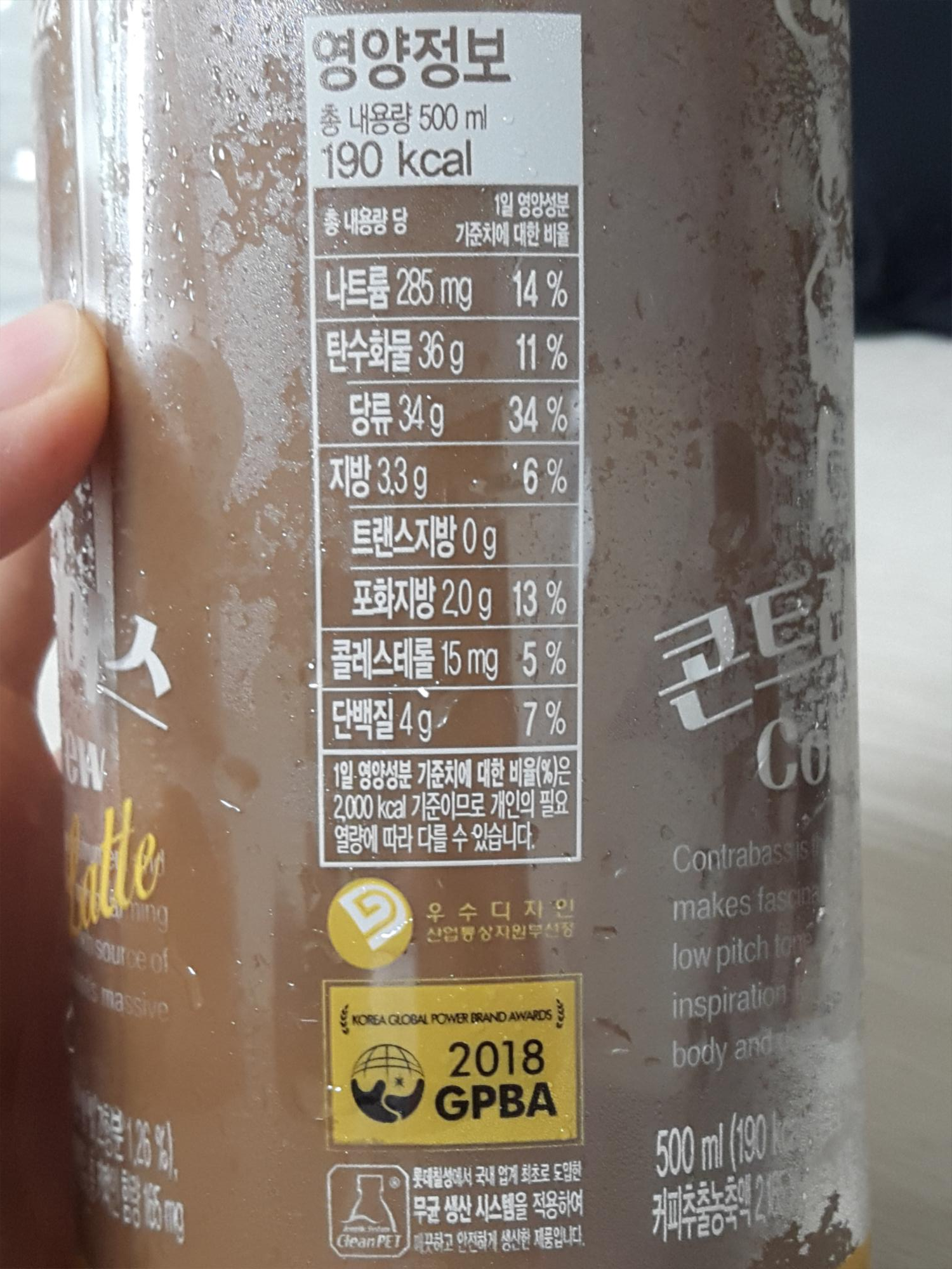 영양성분은 나트륨 285mg, 탄수화물 36g, 당류 34g, 지방 3.3g, 포화지방 2g, 콜레스테롤 15mg, 단백질 4g입니다. 산업통상자원부선정 우수디자인으로 뽑혔고, 2018 GPBA에서 뽑혔대요. 그리고 무균생산시스템을 적용, 깨끗하게 생산한 제품이라는 점을 강조하였습니다.