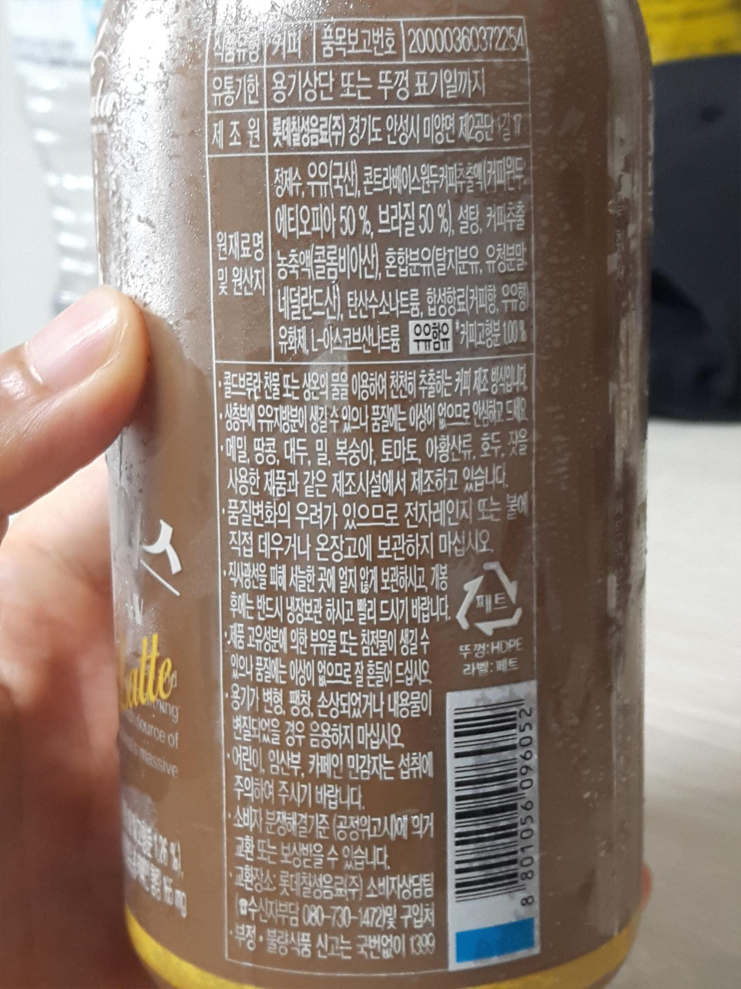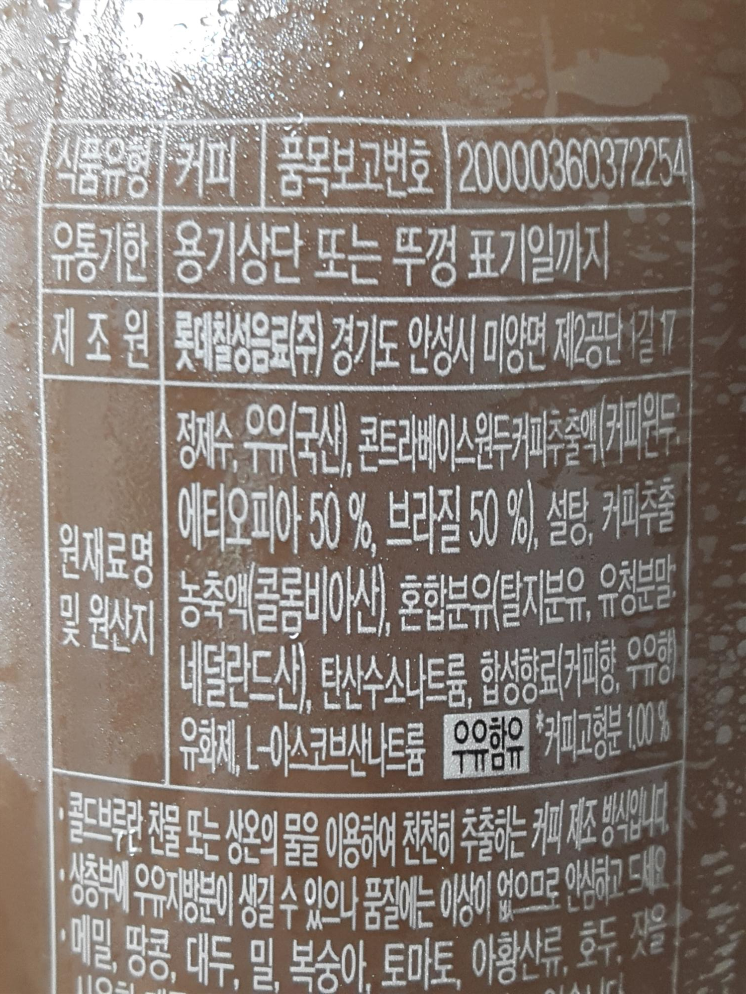 경기도 안성에 있는 롯데칠성음료에서 만들었고, 원재료는 정제수, 우유(국산), 콘트라베이스원두커피추출액(커피원두: 에티오피아 50%, 브라질 50%), 설탕, 커피추출농축액(콜롬비아산), 혼합분유(탈지분유, 유청분말: 네덜란드산), 탄산수소나트륨, 합성향료(커피향, 우유향, 유화제, L-아스코브산나트륨) 입니다.