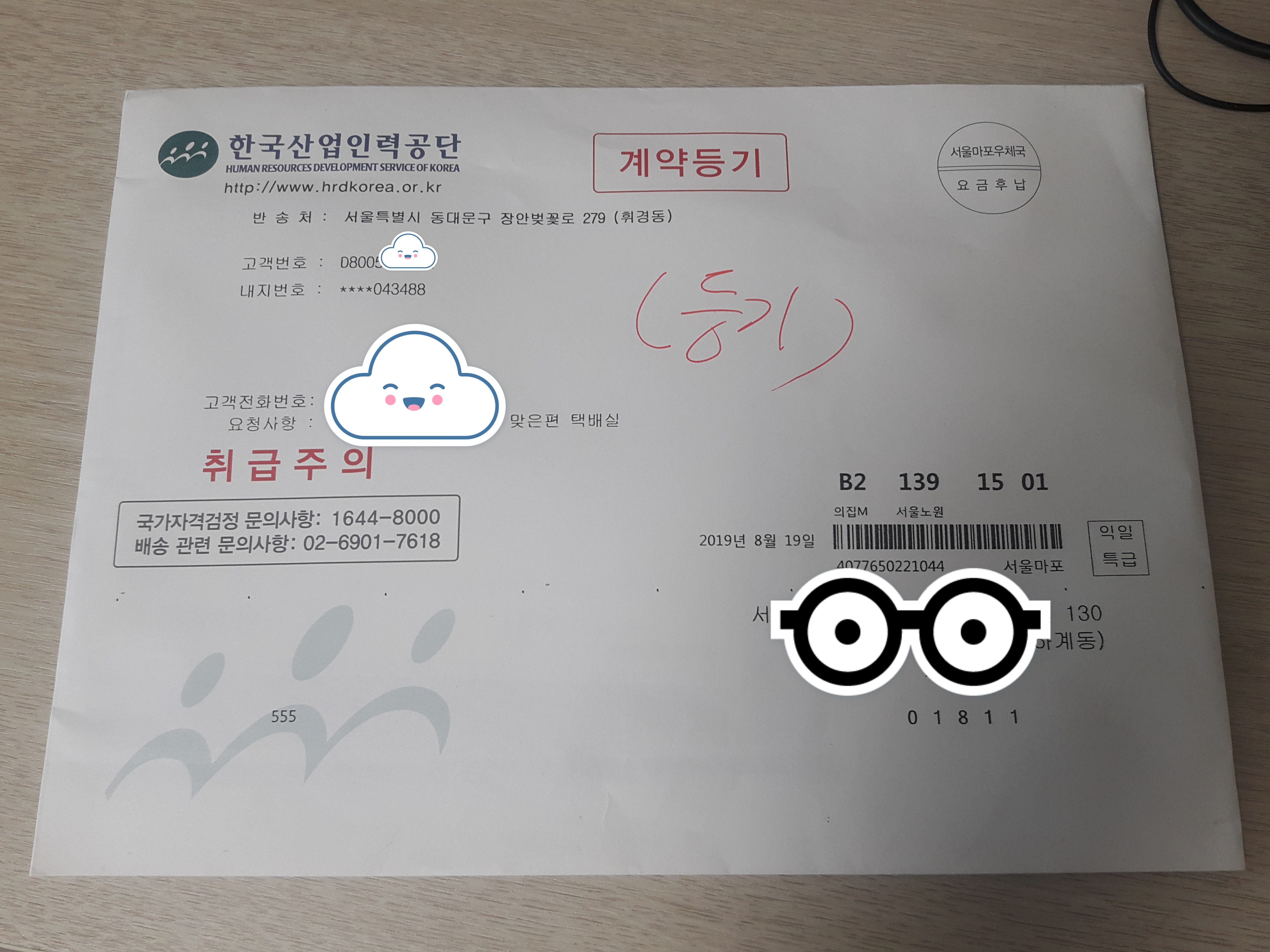 이렇게 등기로 도착 ㅎㅎ 계약등기고 취급주의라고 적어져 있네요. 한국산업인력공단에서 온 것, 받자마자 자격증이 왔구나 딱 생각이 들었어요.
