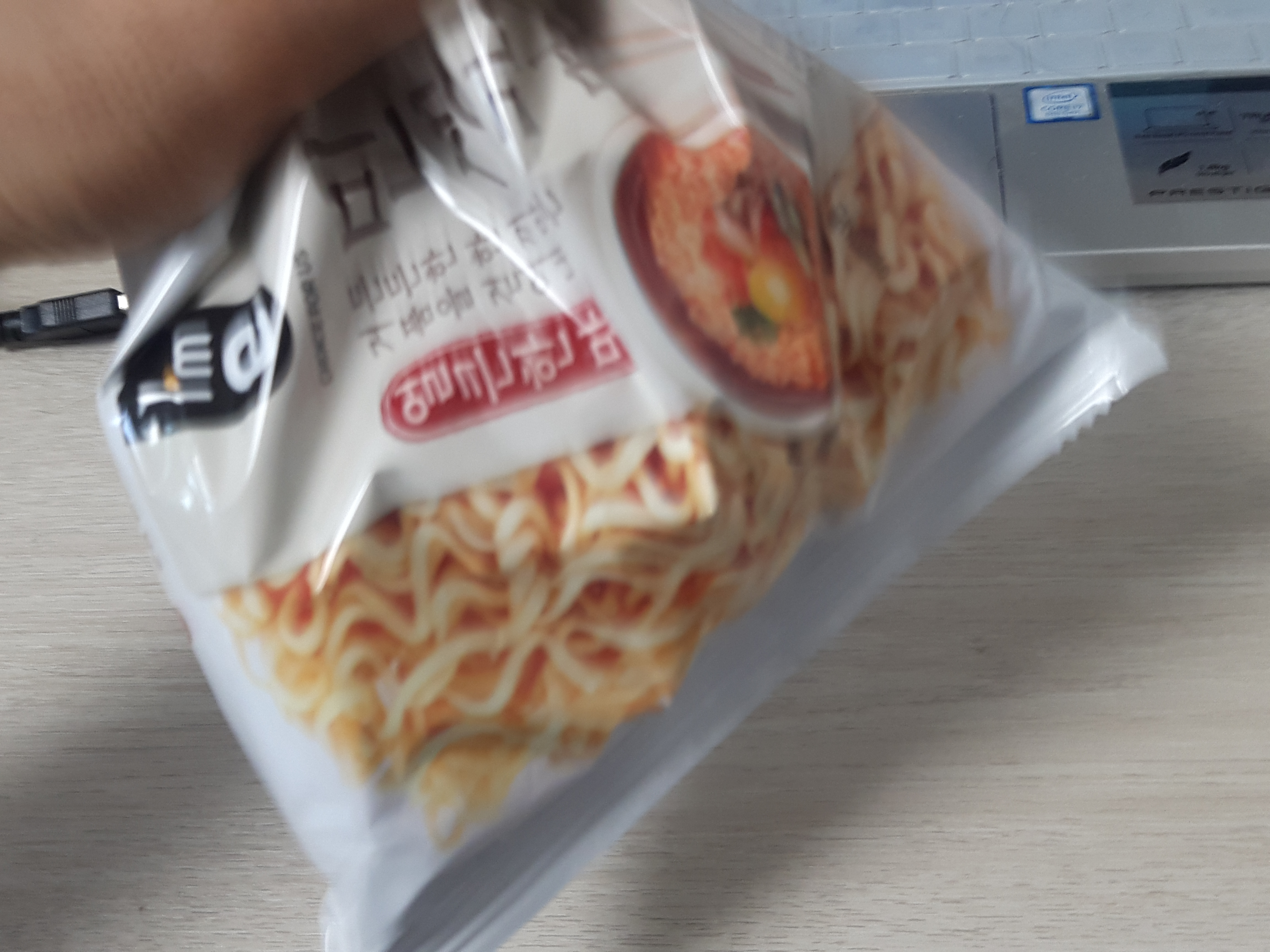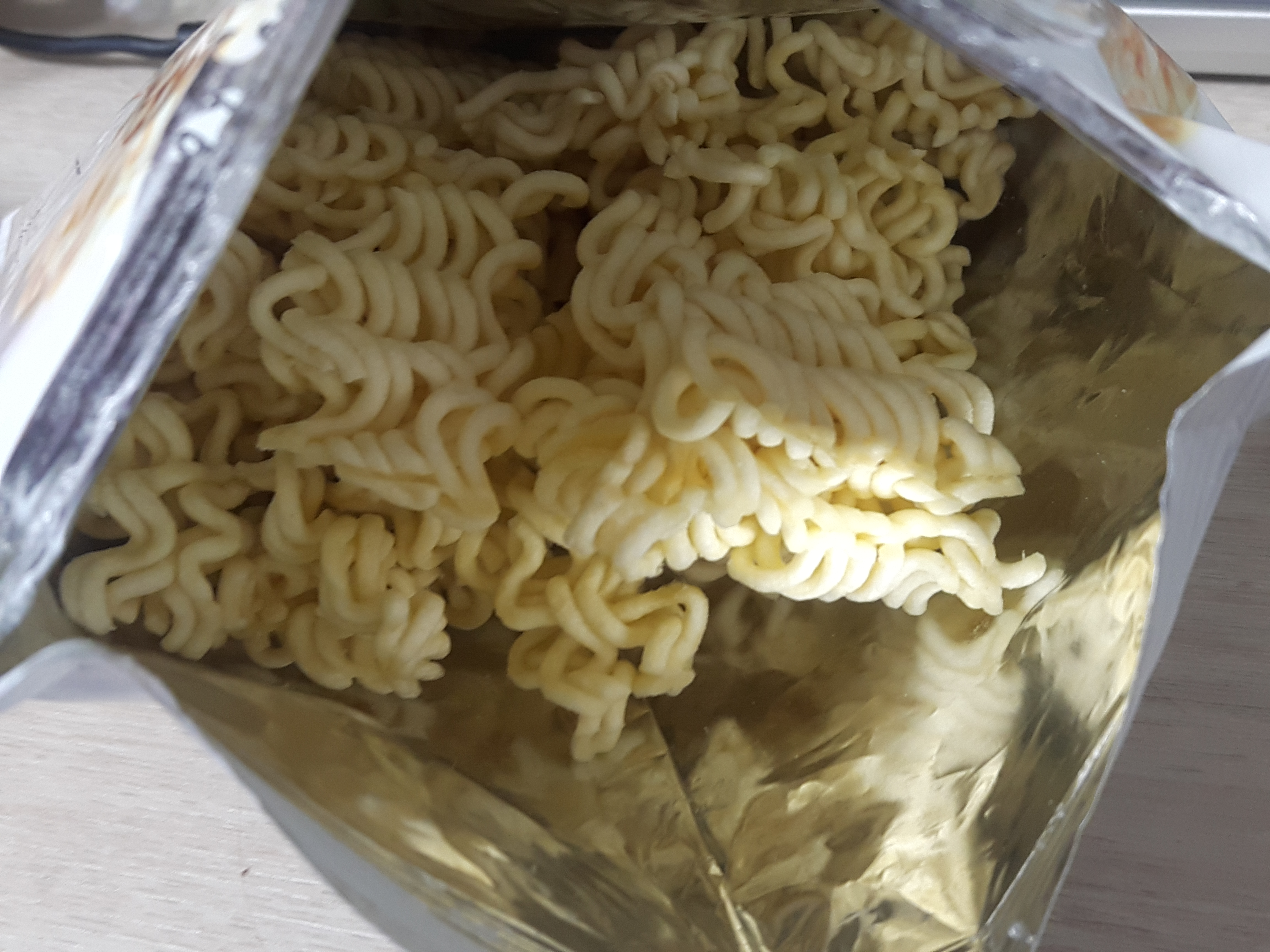 먼저 봉지를 뜯지않은채로 라면을 조각냅니다.