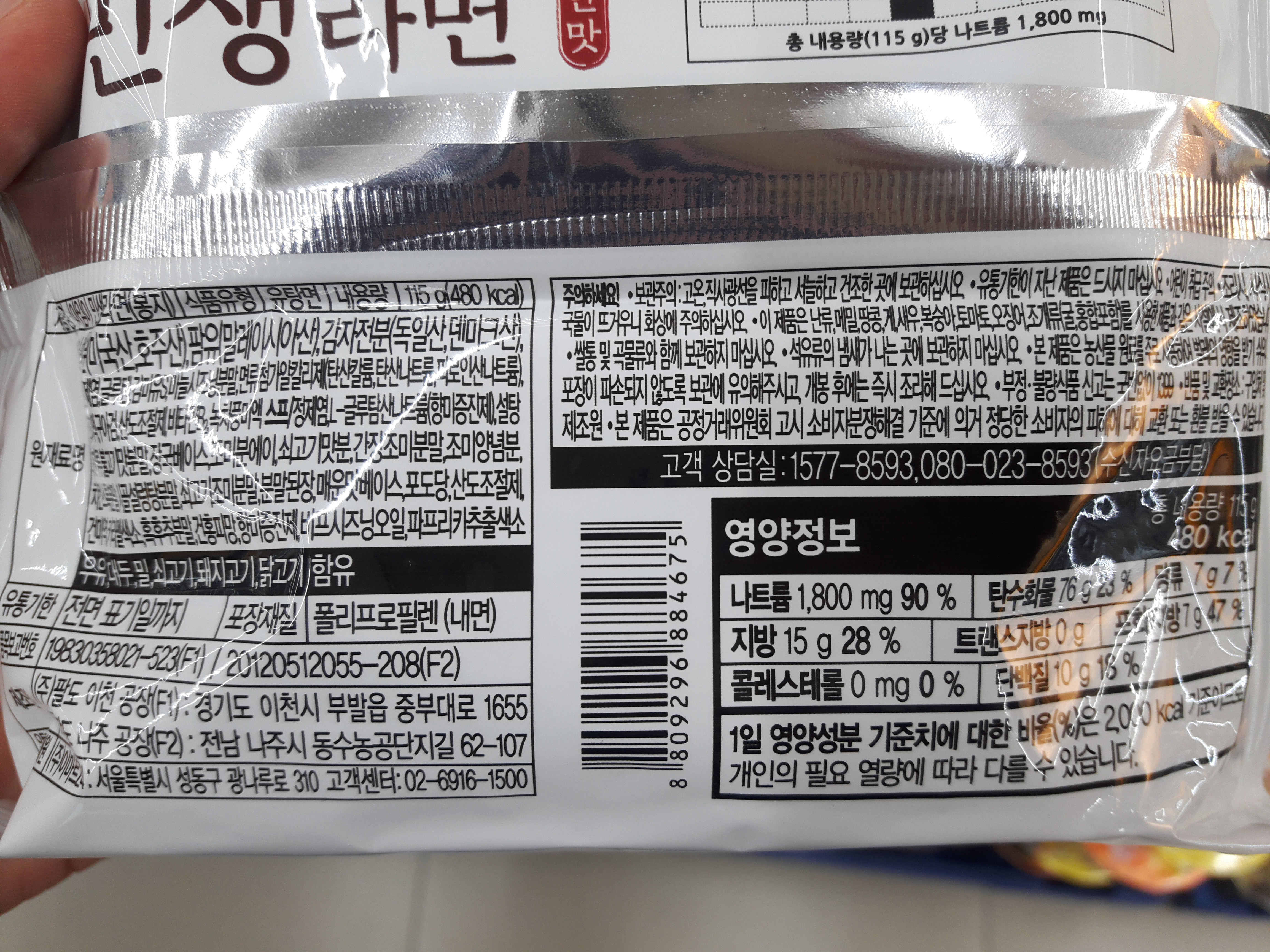 민생라면의 내용량은 115g이고, 칼로리는 480kcal 입니다.