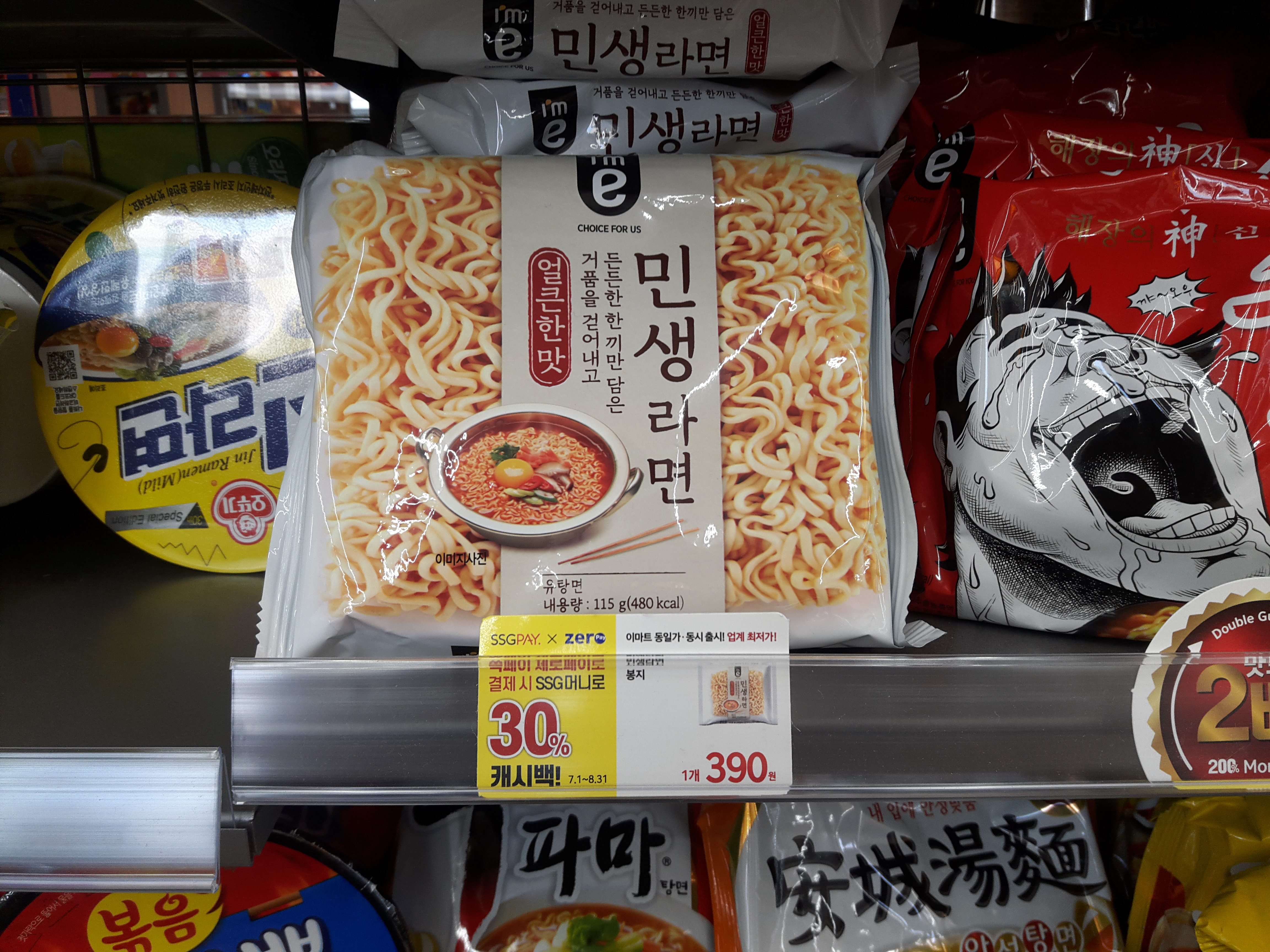 민생라면은 컵라면과 봉지라면 2종류로 판매되고 있으며, 봉지라면의 경우 8월 현재 무려 1개당 390원의 어마어마하게 민생스러운 부담없는 가격에 판매되고 있습니다. 넘 좋습니다.