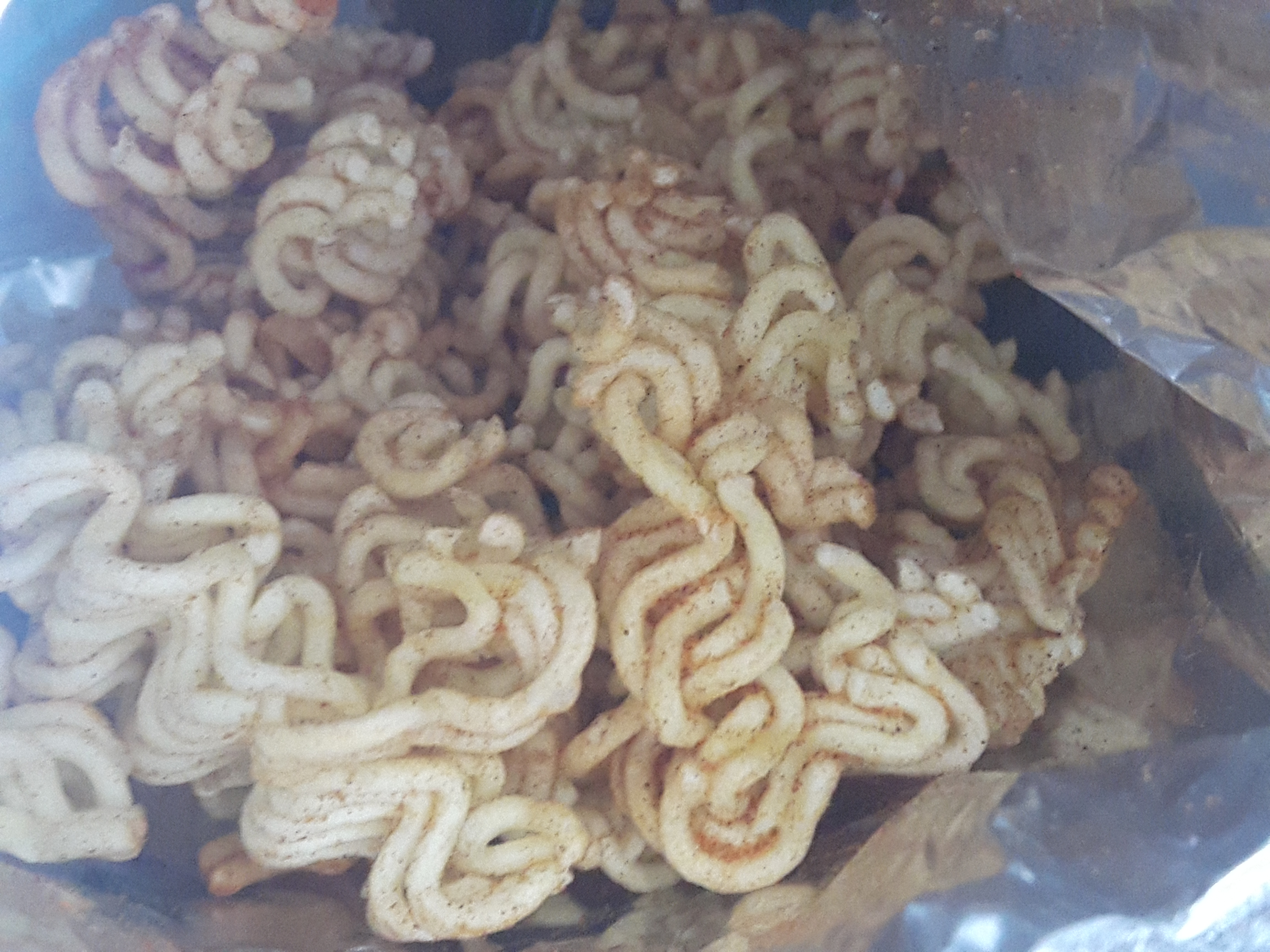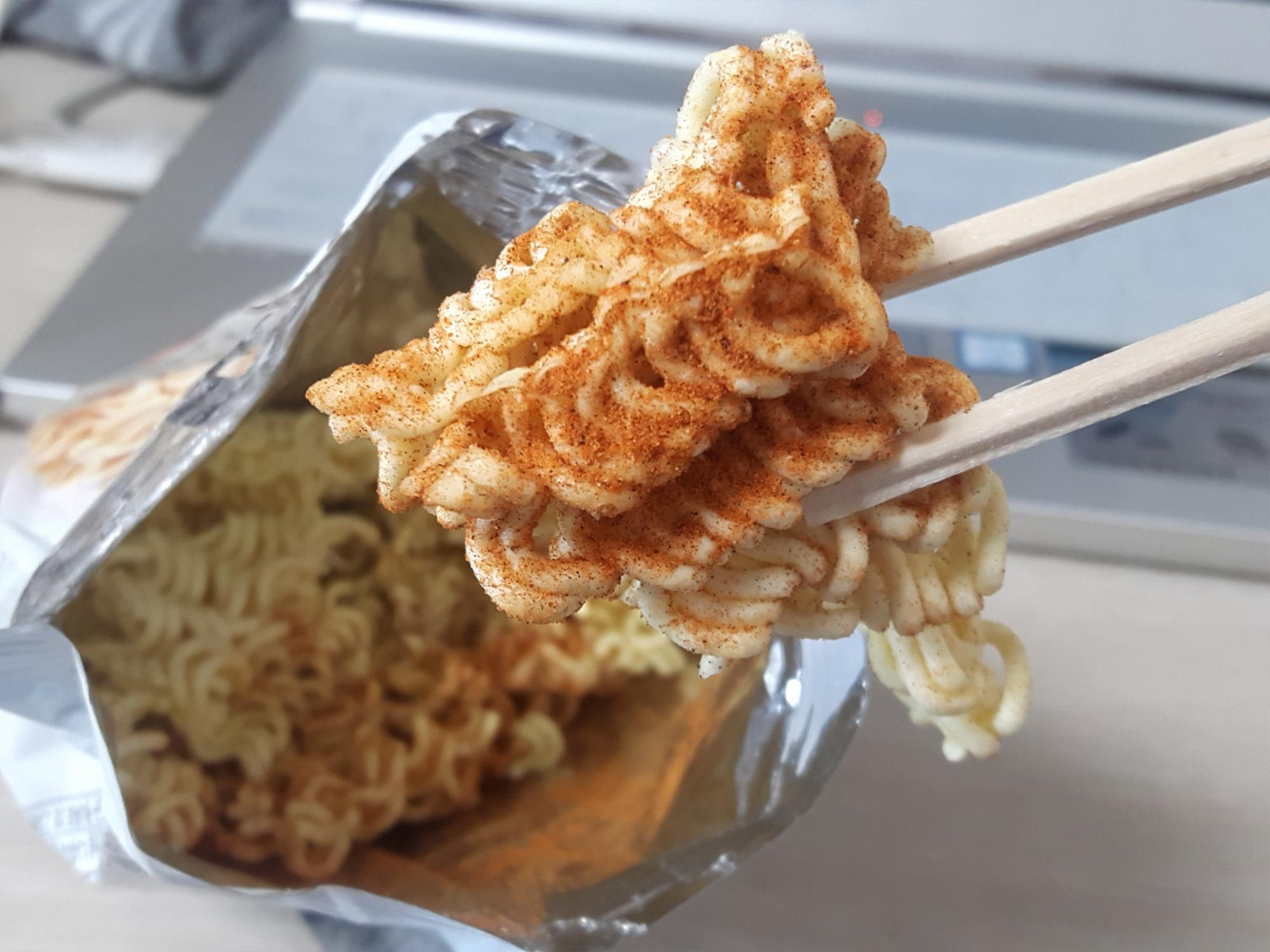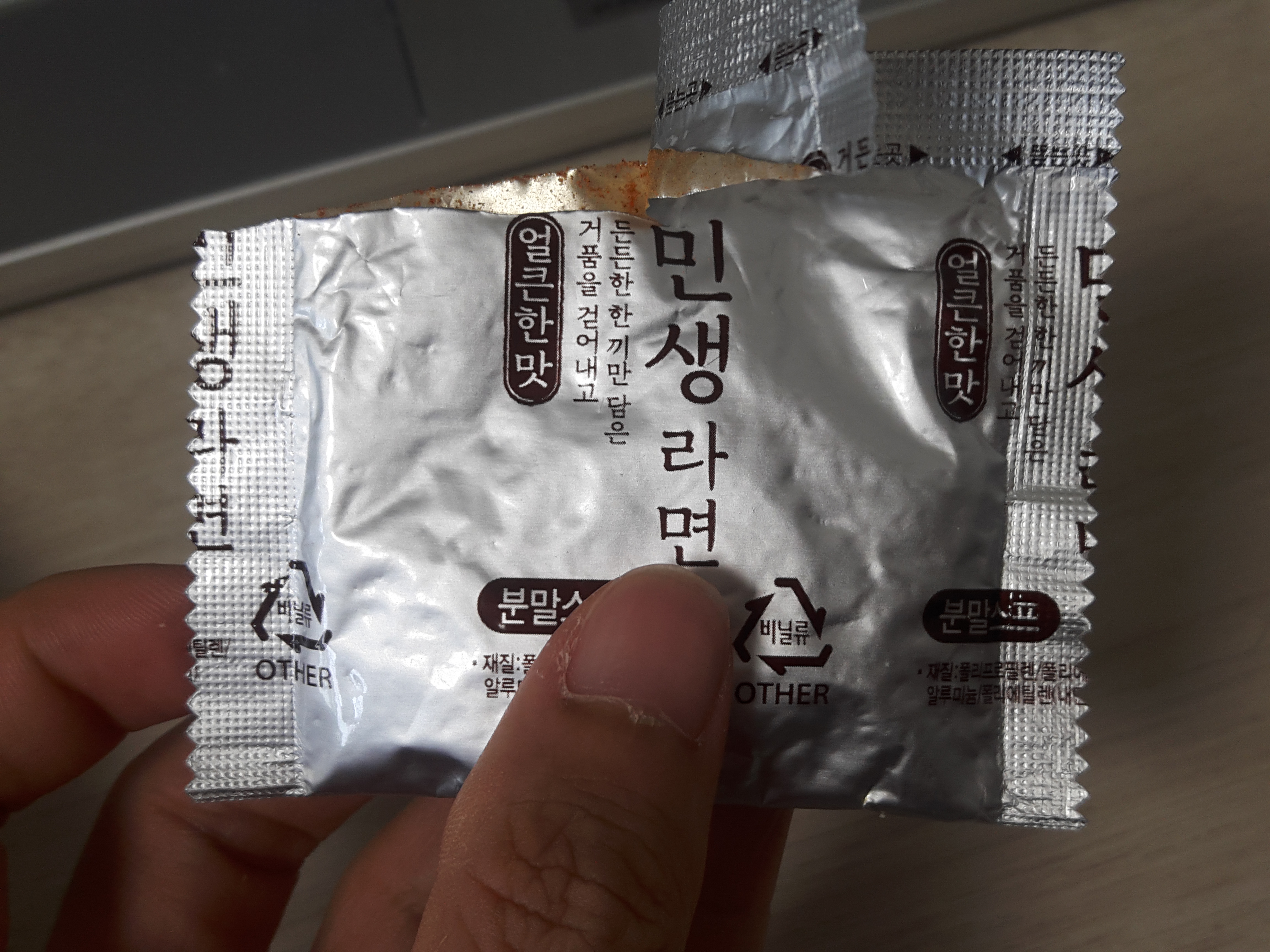 요렇게 라면에 틈사이로 분말소스가 들어가 짭쪼름하고 매콤한 생라면이 완성! 처음에는 잘 안섞이는데요. 좀 더 잘게부숴서 흔들어주면
