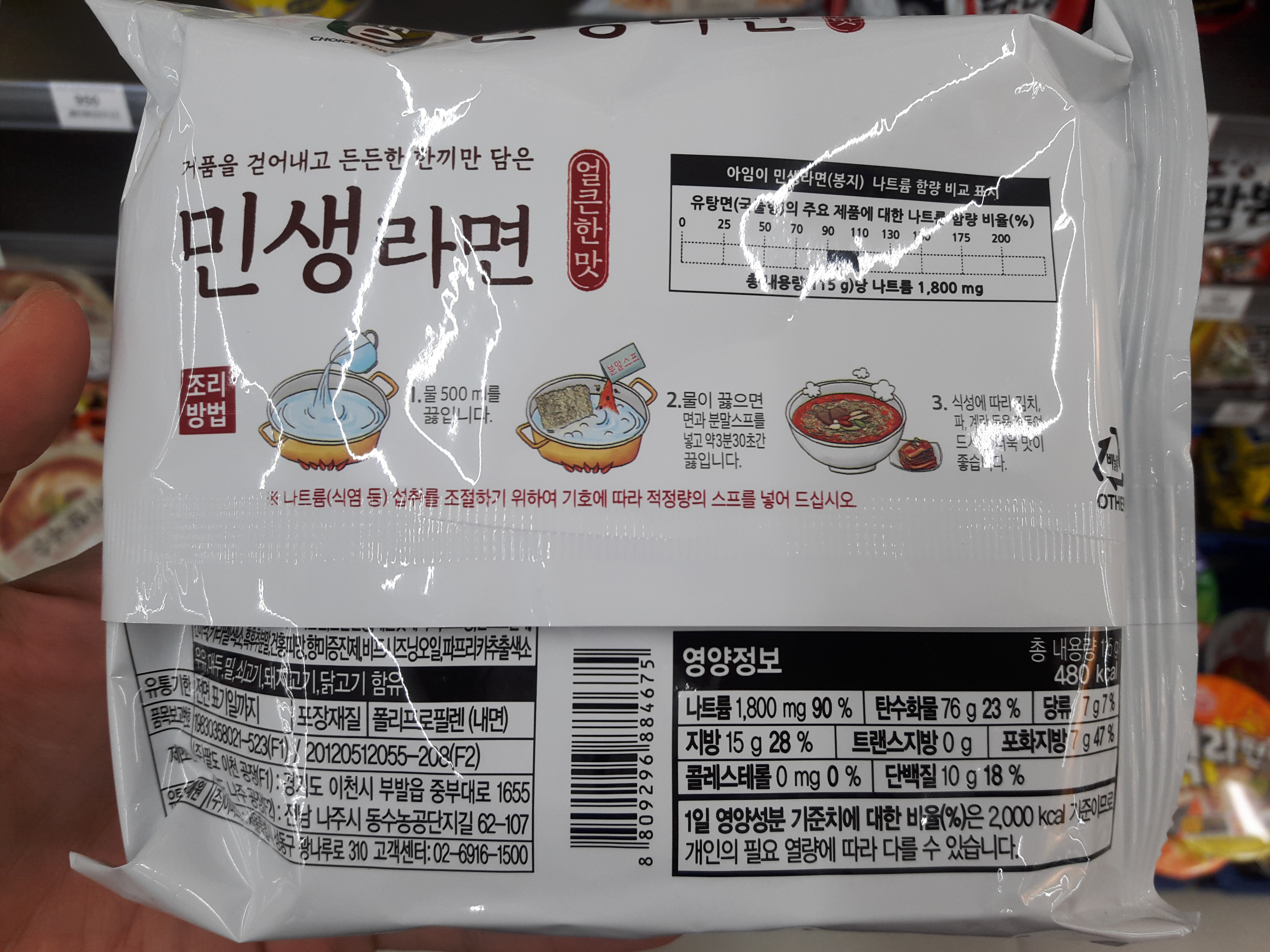 영양정보는 나트륨 1,800mg, 탄수화물 76g, 당류 7g, 지방 15g, 포화지방 7g, 단백질 10g 입니다. 라면류가 다 그렇지만 나트륨이 정말 많이 들어가요. 한개를 국물까지 다 먹으면 일일나트륨권장량의 90%를 먹는거네요. 헐..