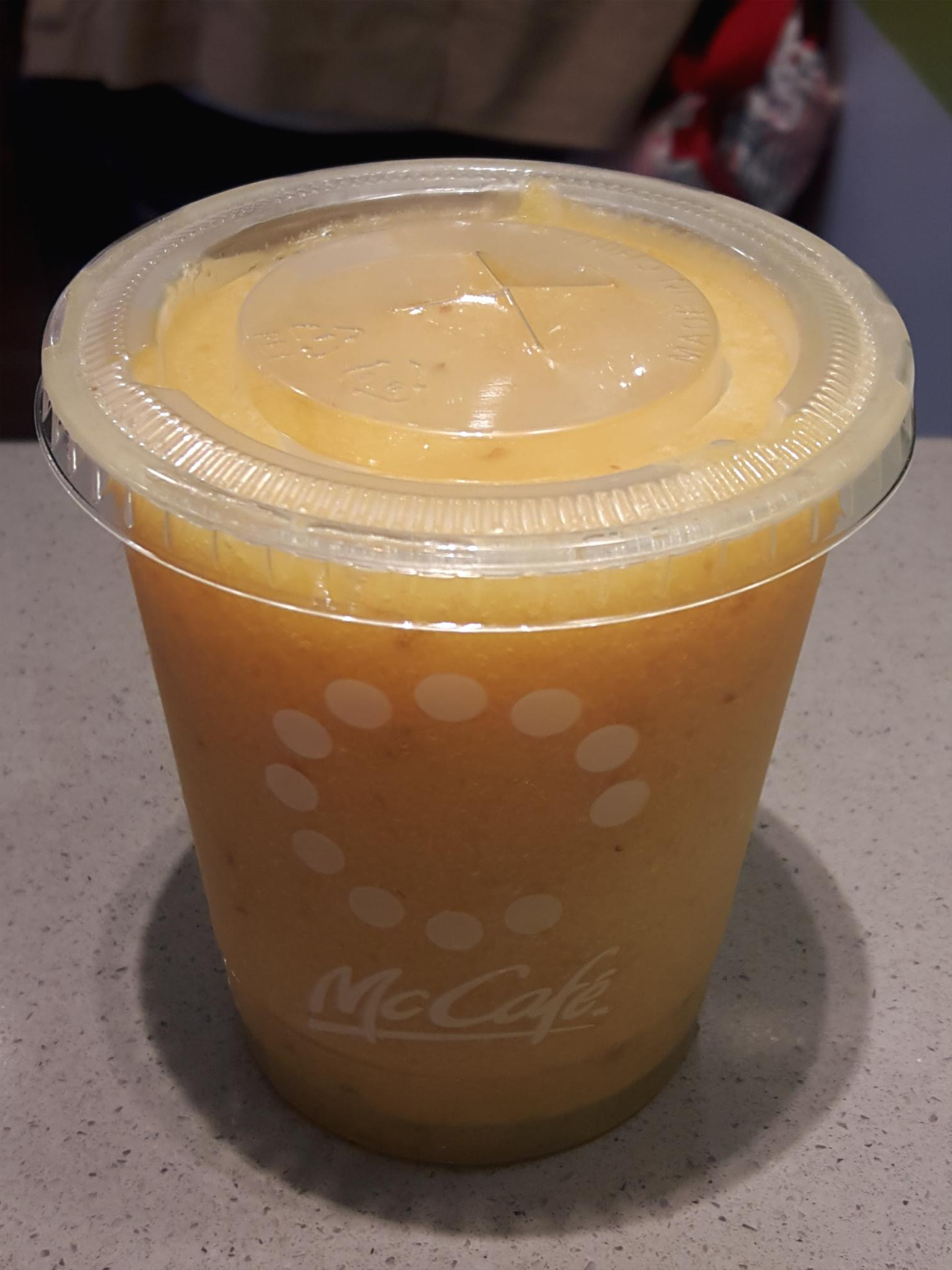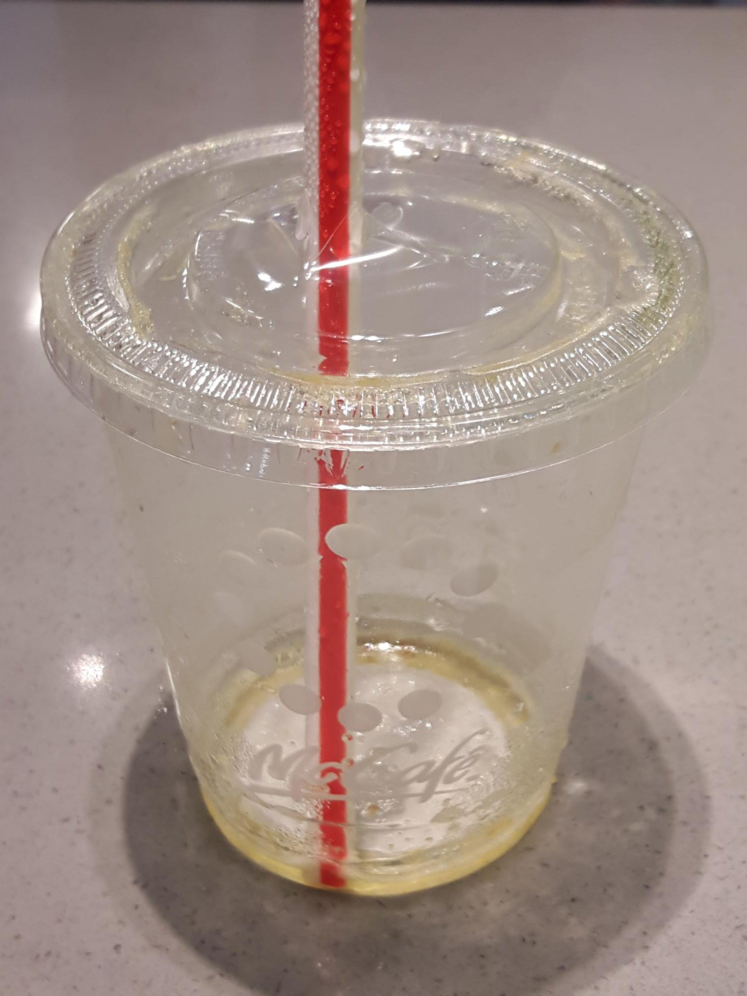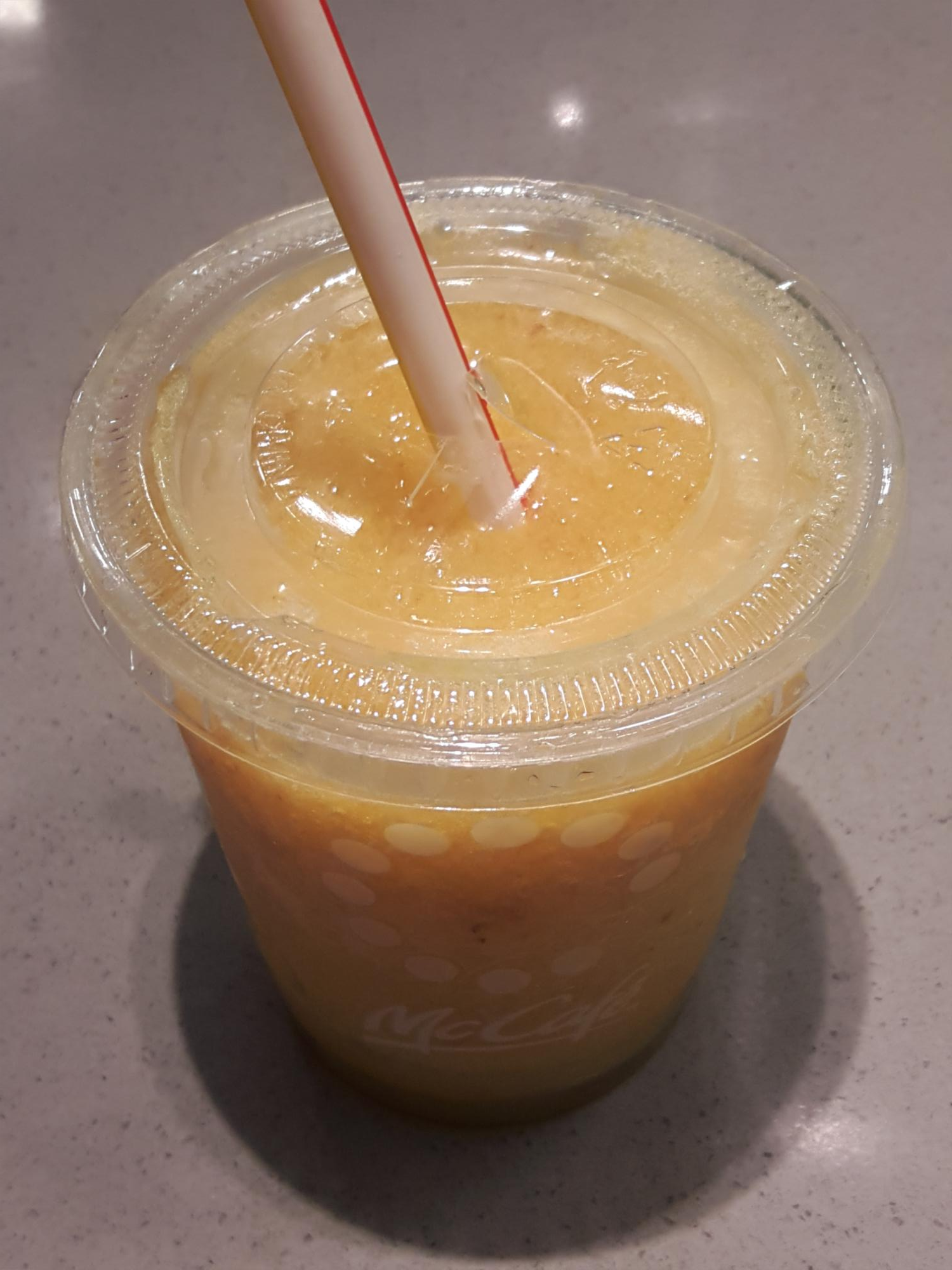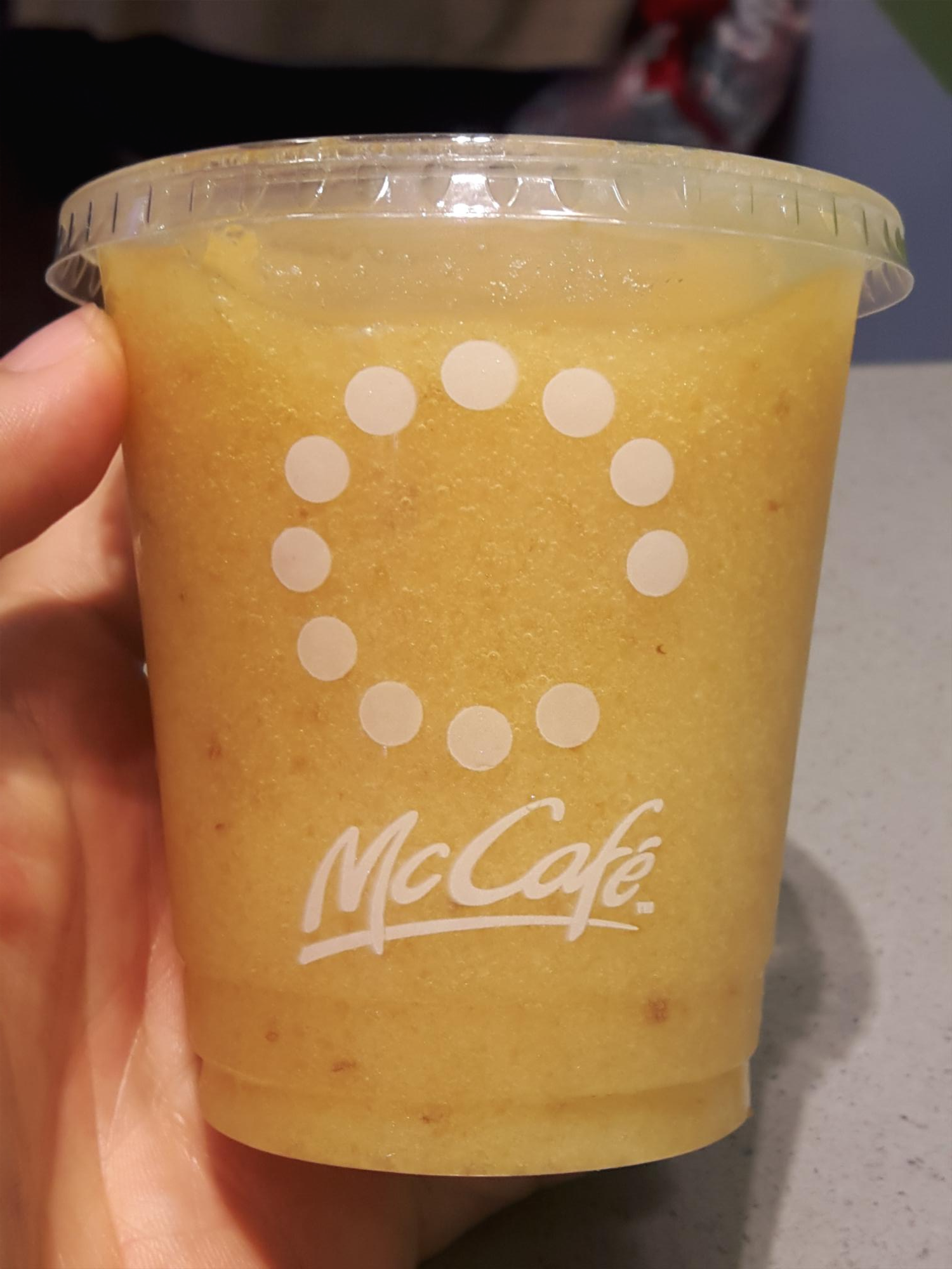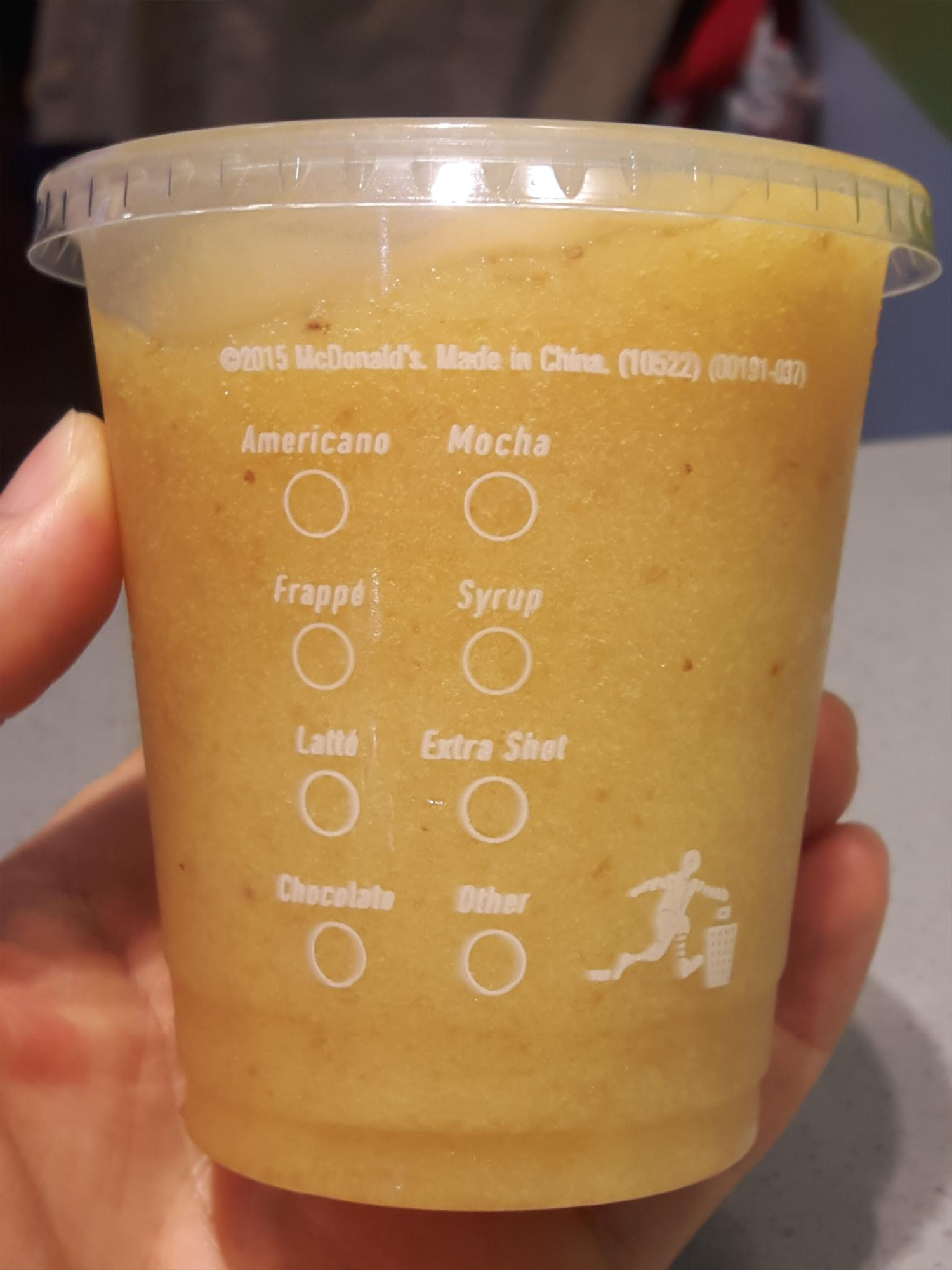 칠러 가격은 2000원이고요. 저는 테이크아웃잔에 받았습니다. 위 사진처럼 투명 플라스틱컵에 받았습니다. 뚜껑에는 빨대를 꽂을 수 있게 십자표시가 되어 있고, 전면에 맥카페라고 흰색으로 적혀 있네요.