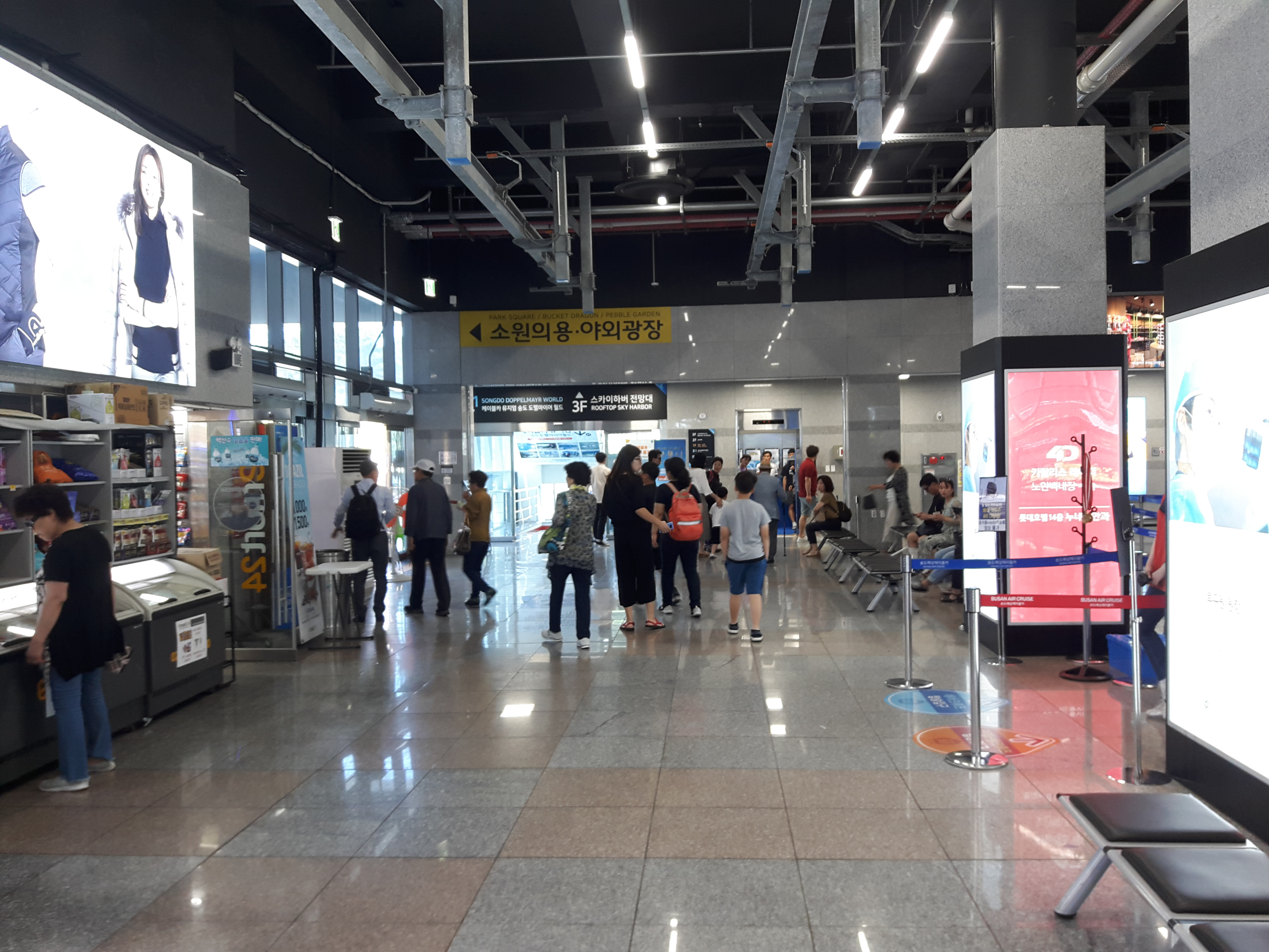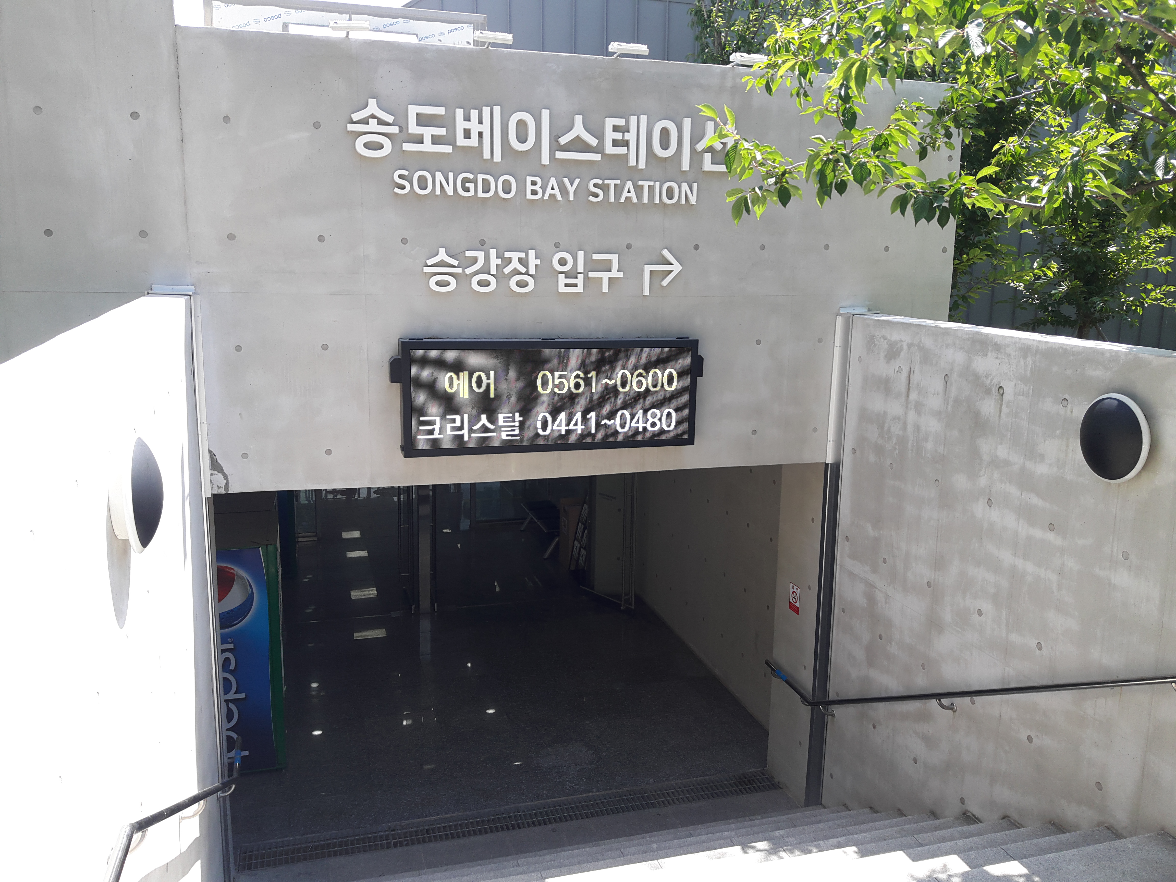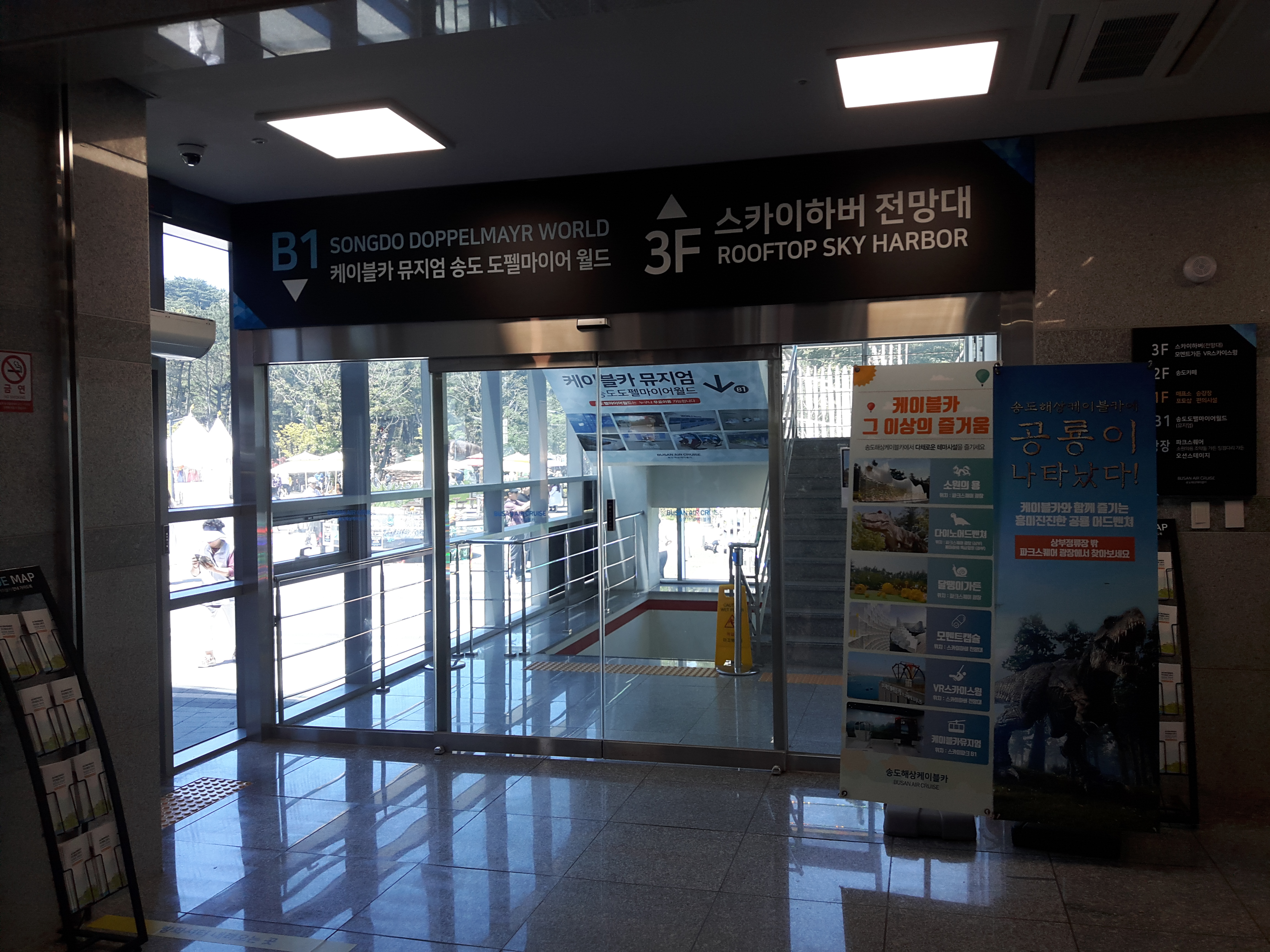 송도 해상 케이블카 탑승장 입구 입니다. 두번째사진 보시면 기둥에 파란색배경에 흰색화살표로 들어가는곳이 표시가 되어 있습니다.