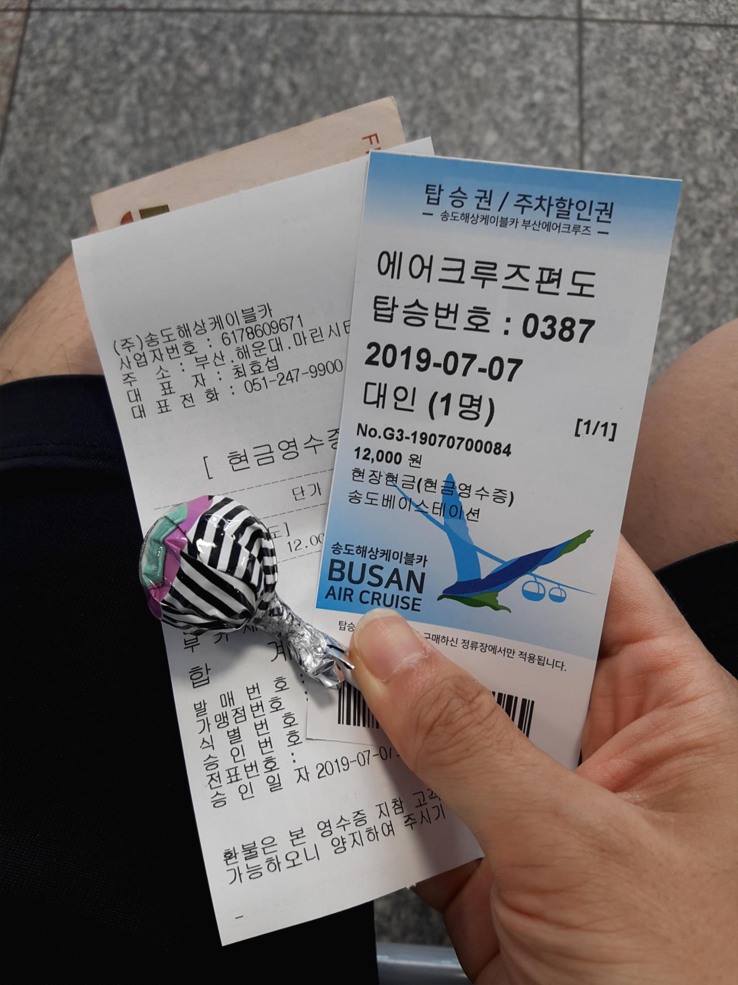 에어크루즈 편도로 발권했습니다. 사탕을 같이 주네요. ㅎㅎ