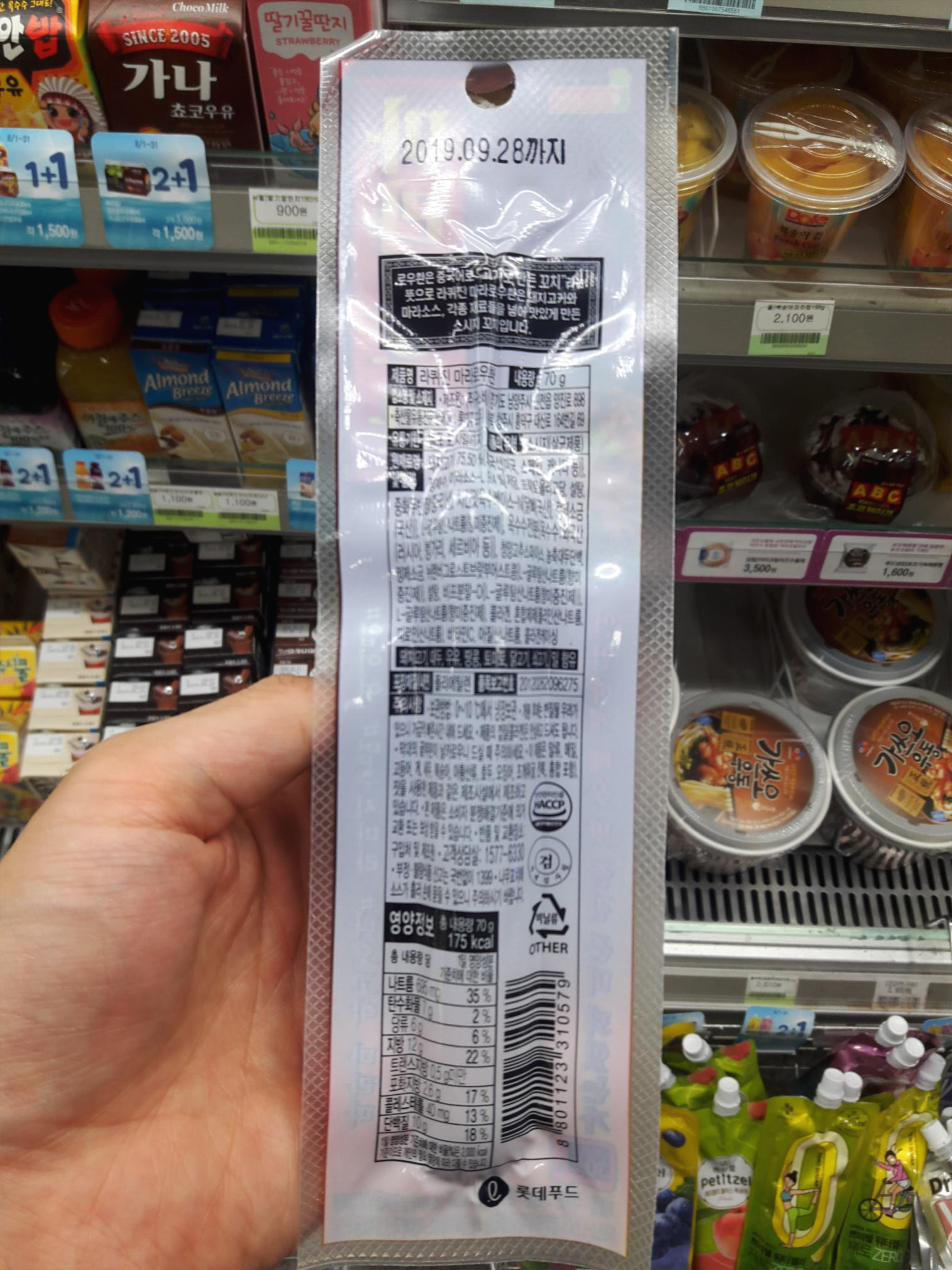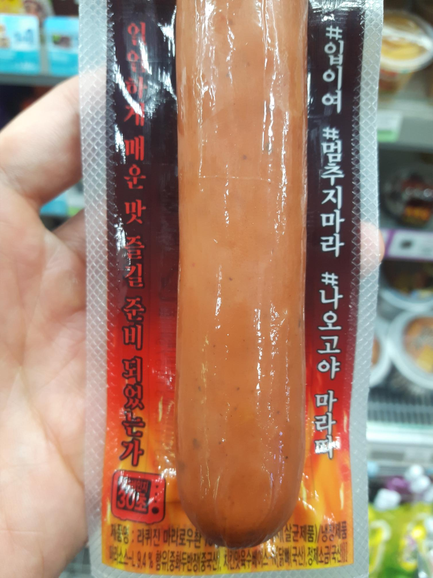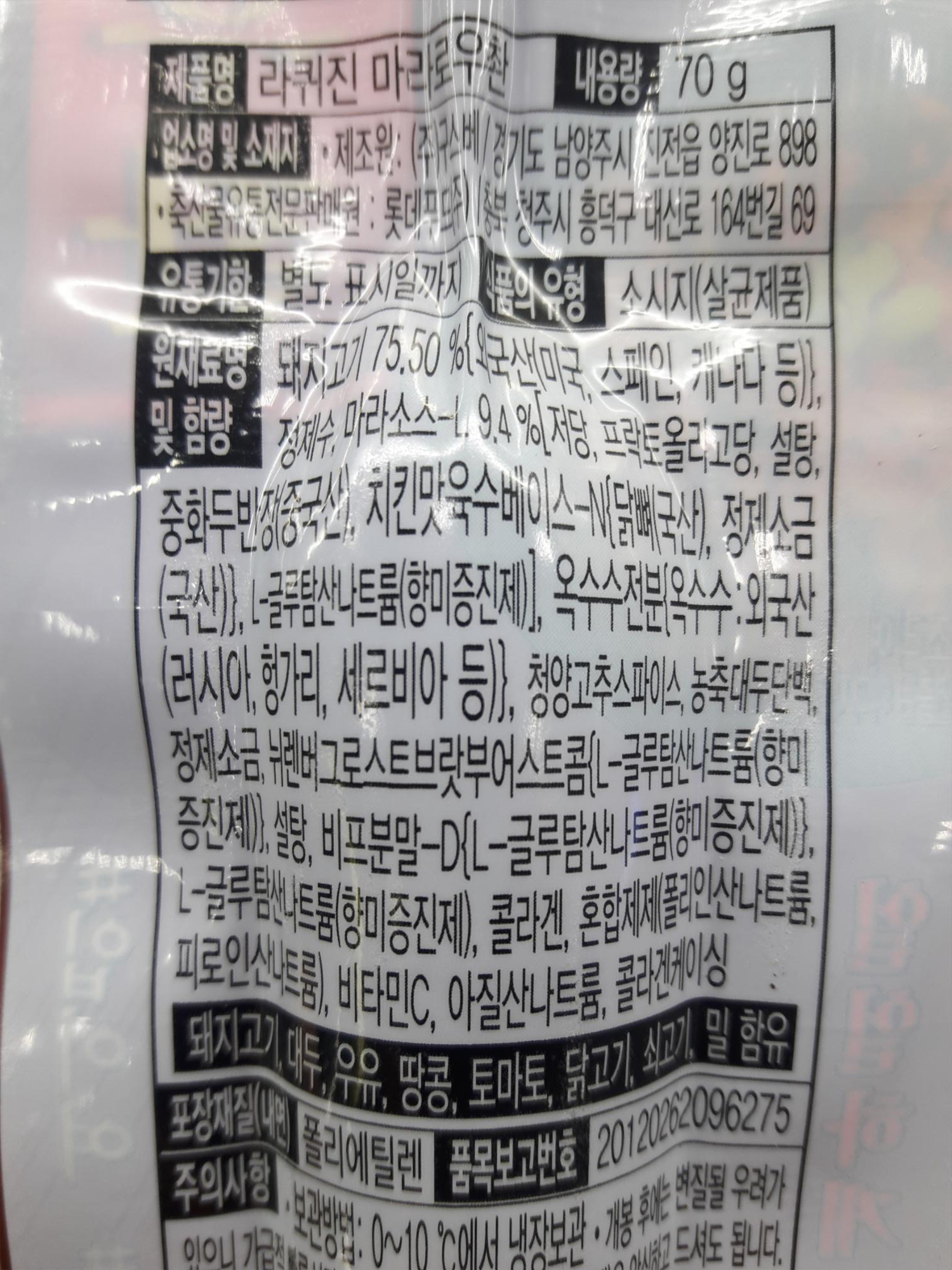 제조원은 경기도 남양주시에 위치한 (주)구스비이고 판매원은 롯데푸드네요. 원재료는 돼지고기 75.5%[외국산(미국, 스페인, 캐나다 등)], 정제수, 마라소스-L 9.4%[저당, 프락토올리고당, 설탕, 중화두반장(중국산), 치킨맛육수베이스-N{닭뼈(국산), 정제소금(국산)}, L-글루탐산나트륨(향미증진제)], 옥수수전분{옥수수:외국산(러시아, 헝가리, 세르비아 등)}, 청양고추스파이스, 농축대두단백, 정제소금, 뉘렌버그로스트브랏부어스트콤{L-글루탐산나트륨(향미증진제)}, 설탕, 비프분말-D{L-글루탐산나트륨(향미증진제)}, L-글루탐산나트륨(향미증진제), 콜라겐, 혼합제제(폴리인산나트륨, 피로인산나트륨), 비타민C, 아질산나트륨, 콜라겐케이싱 입니다.