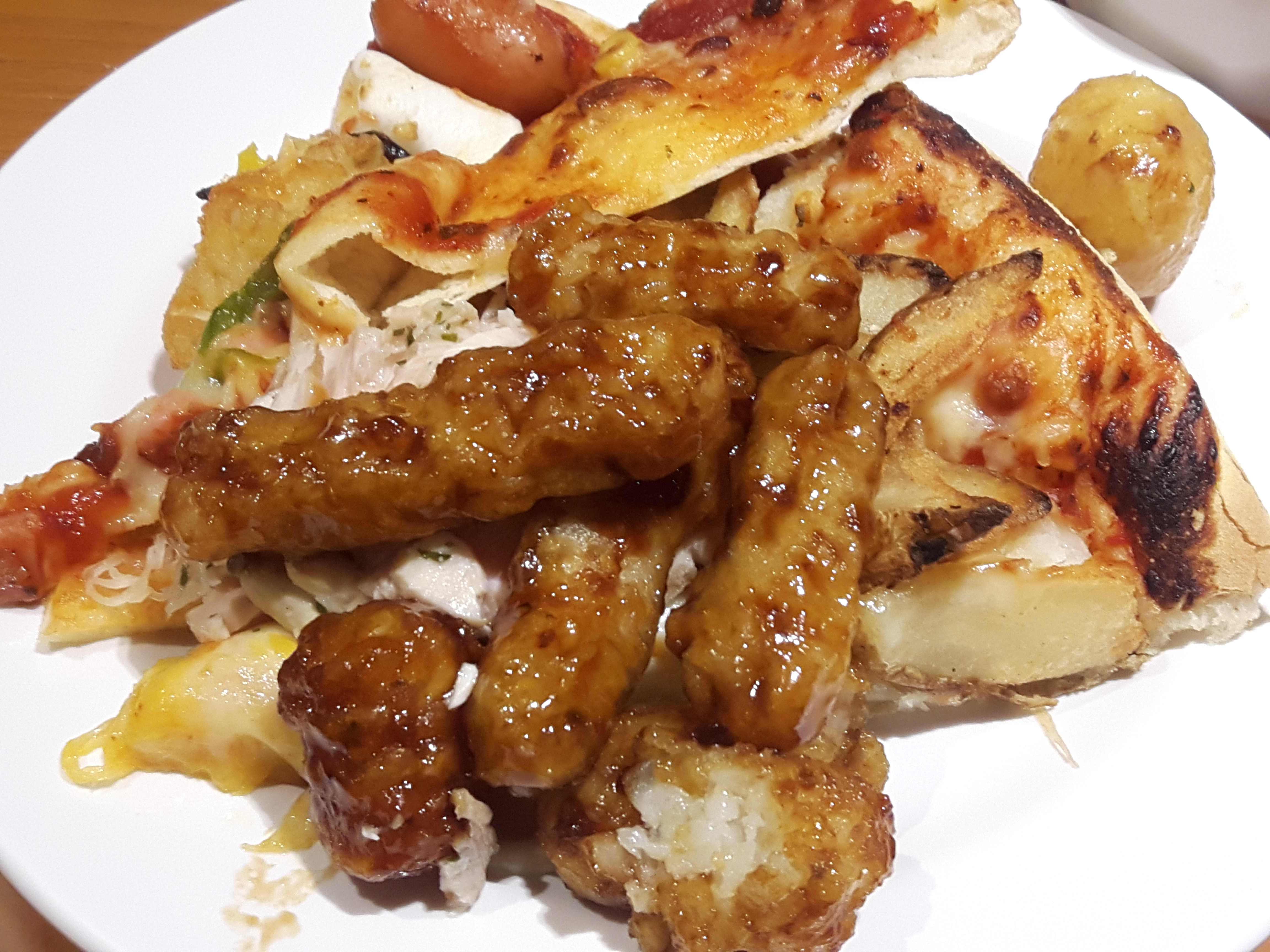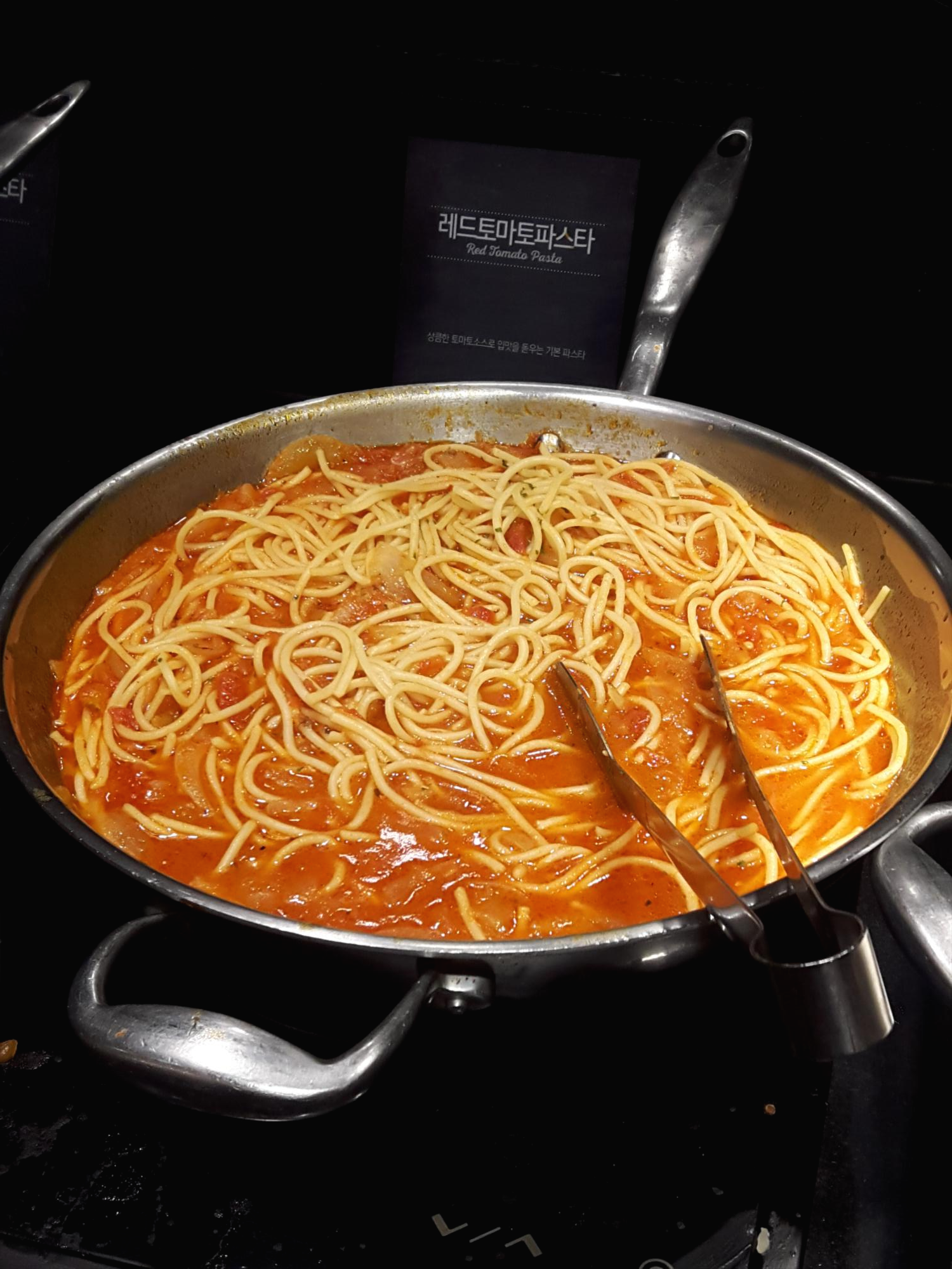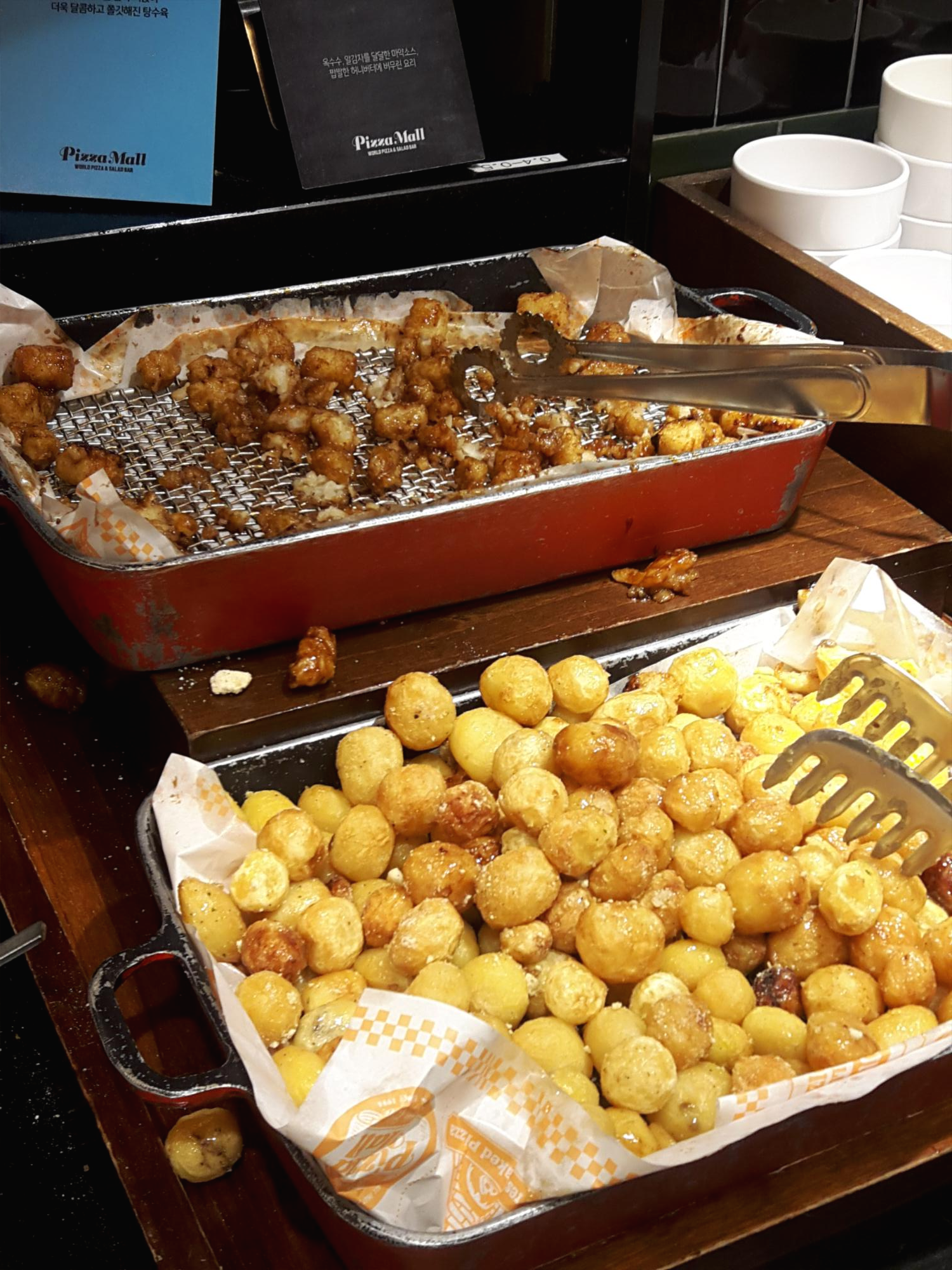 첫번째 접시에요. 탕수육하고 신메뉴 마늘쫑쫑파스타, 그리고 코코몽피자등등을 가져왔어요. 코코몽피자가 독특했는데, 소세지야 원래 맛있고, 조랭이떡과 밀가루도우의 식감이 겹치지않을까 걱정했는데, 쫄깃함의 강도가 달라서 더 조화를 이뤄서 맛있게 먹은거 같고, 마늘쫑쫑파스타는 봉골레느낌나는 파스탄데 마늘향이 나고, 고기도 들어있고 마늘쫑도 있어서 맛있었어요.