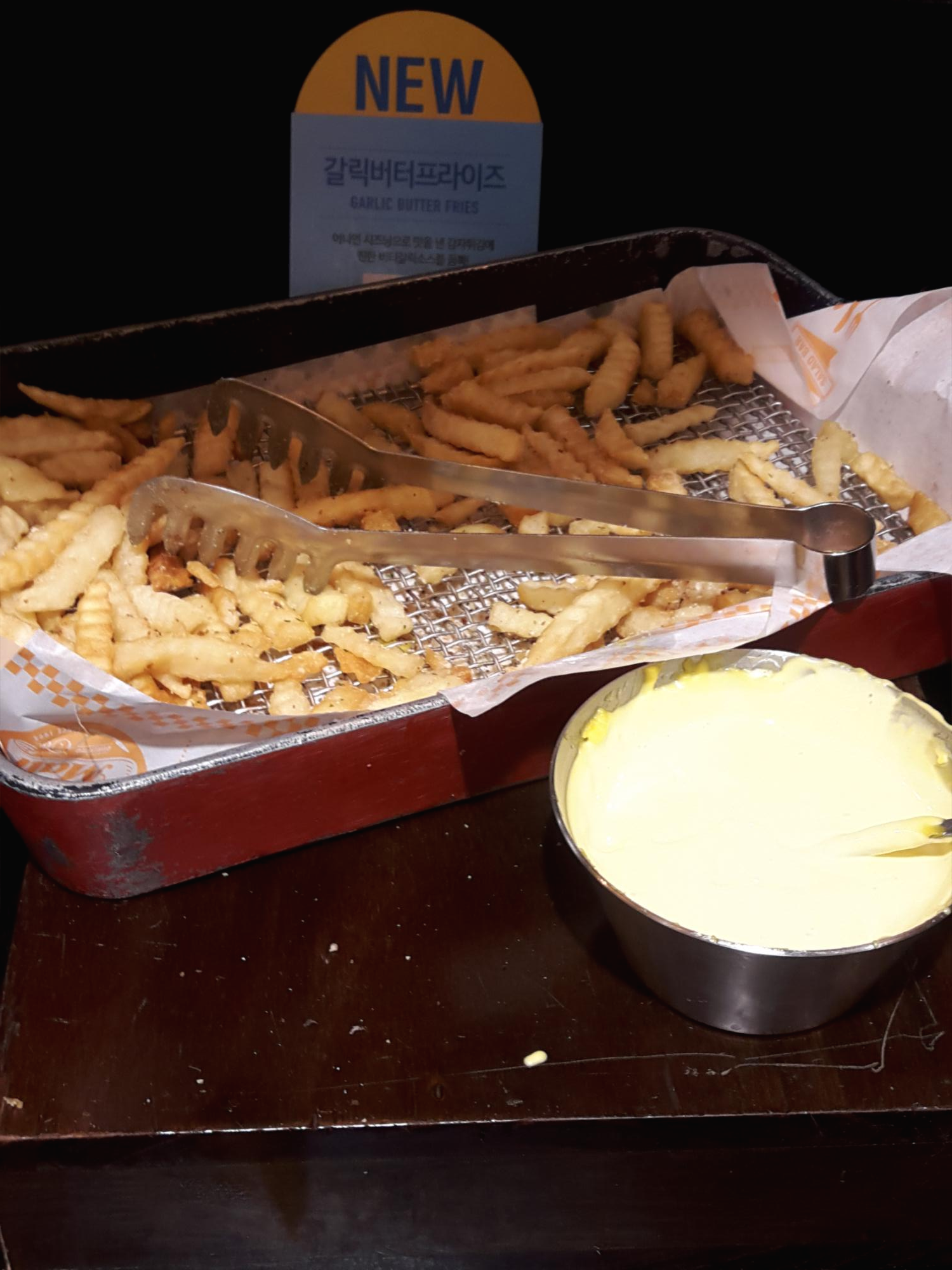 탕수육, 알감자, 그리고 신메뉴 갈릭버터프라이즈에요. 갈릭디핑소스에 감자튀김을 곁들여 먹을 수 있게 되어 있어요.