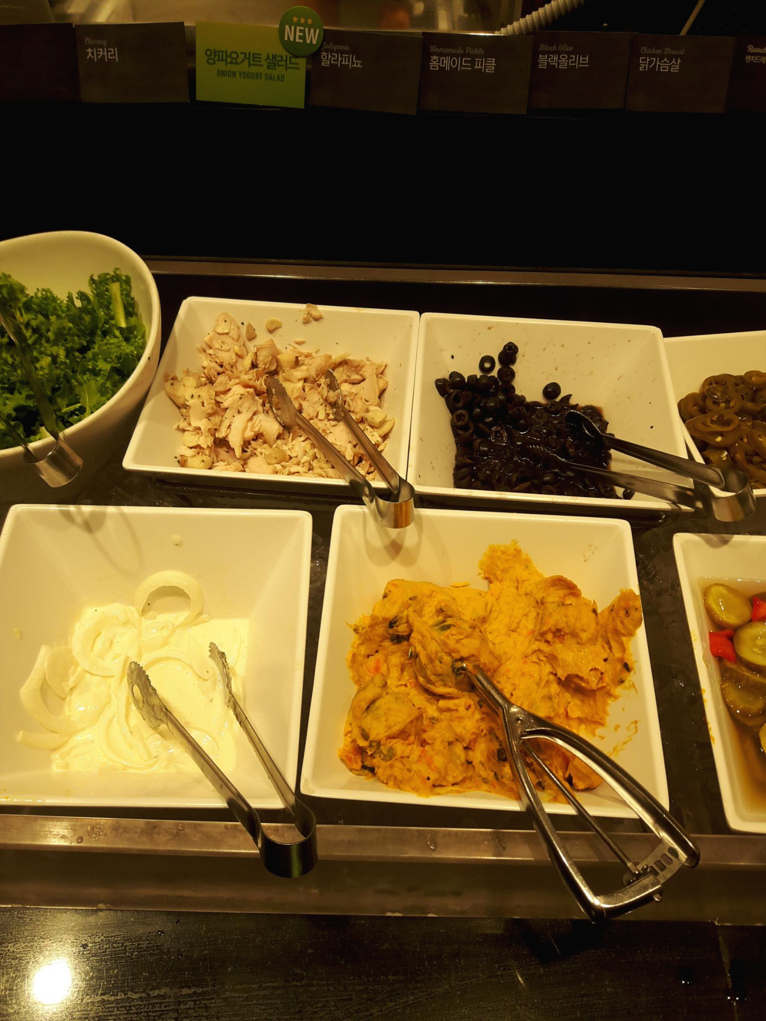 여기는 샐러드바에요. 고구마샐러드, 닭가슴살, 할라피뇨 등등 다양한 샐러드 및 피자와 곁들여먹을 수 있는 피클이 있어요. 그 옆에는 오른쪽사진처럼 다양한 과일류가 있고요. 신메뉴 양파요거트샐러드도 보이네요. 저는 주로 닭가슴살하고 블랙올리브 많이 먹어요. 고기고기하고 단백질 많은 닭가슴살을 맘껏먹을 수 있어서 참 좋습니다.