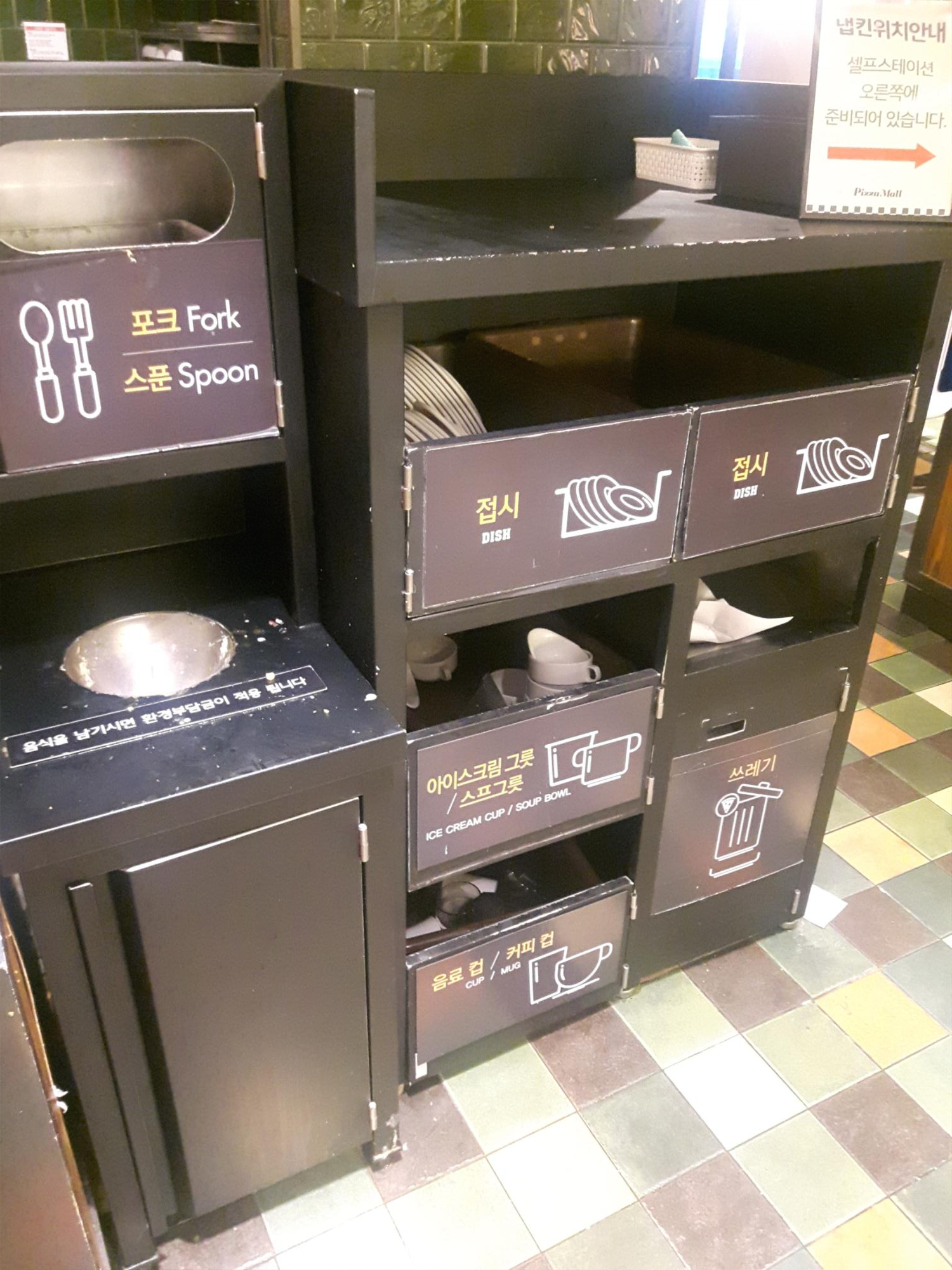 전에는 이 자리가 다 먹은 그릇 놓는 자리였는데, 새접시 가져가는 자리로 바뀌었네요. 여기서 접시와 수저 등 식기를 가져갈 수 있어요,