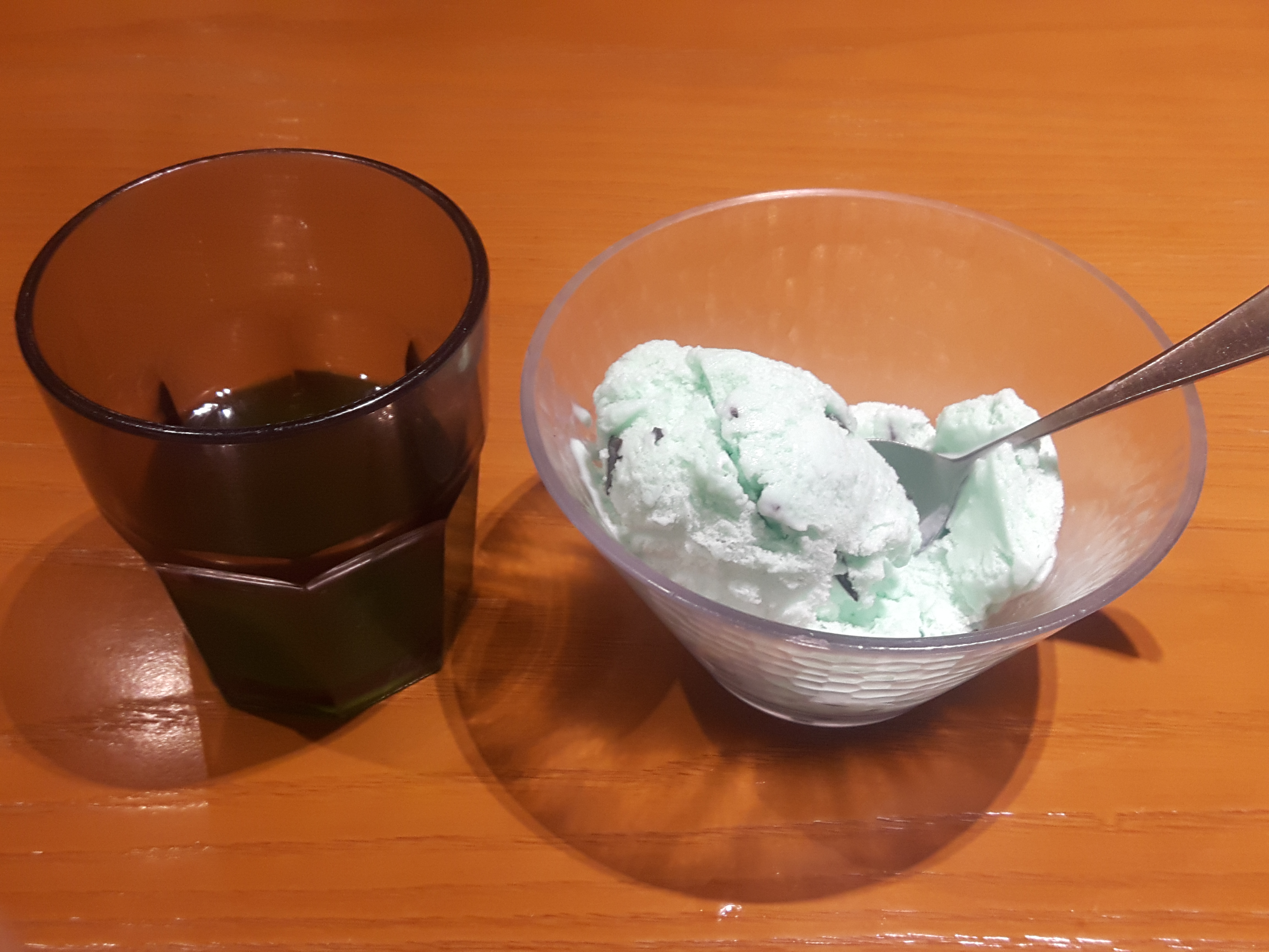 아후 3접시 먹었더니 배부르네요. 다음은 신메뉴 메론소다와 민트초코아이스크림을 가져왔어요. 민트초코아이스크림은 시원하게 입안을 청소해줘요. 처음드시는분들은 약간 치약맛비슷하게 느껴지실수도 있어요. ㅎㅎ 옛날에 풍선껌 스피아민트맛이네요. 메론소다는 사이다에 메로나가 섞인듯한 맛입니다. ㅎㅎ 달달해요.