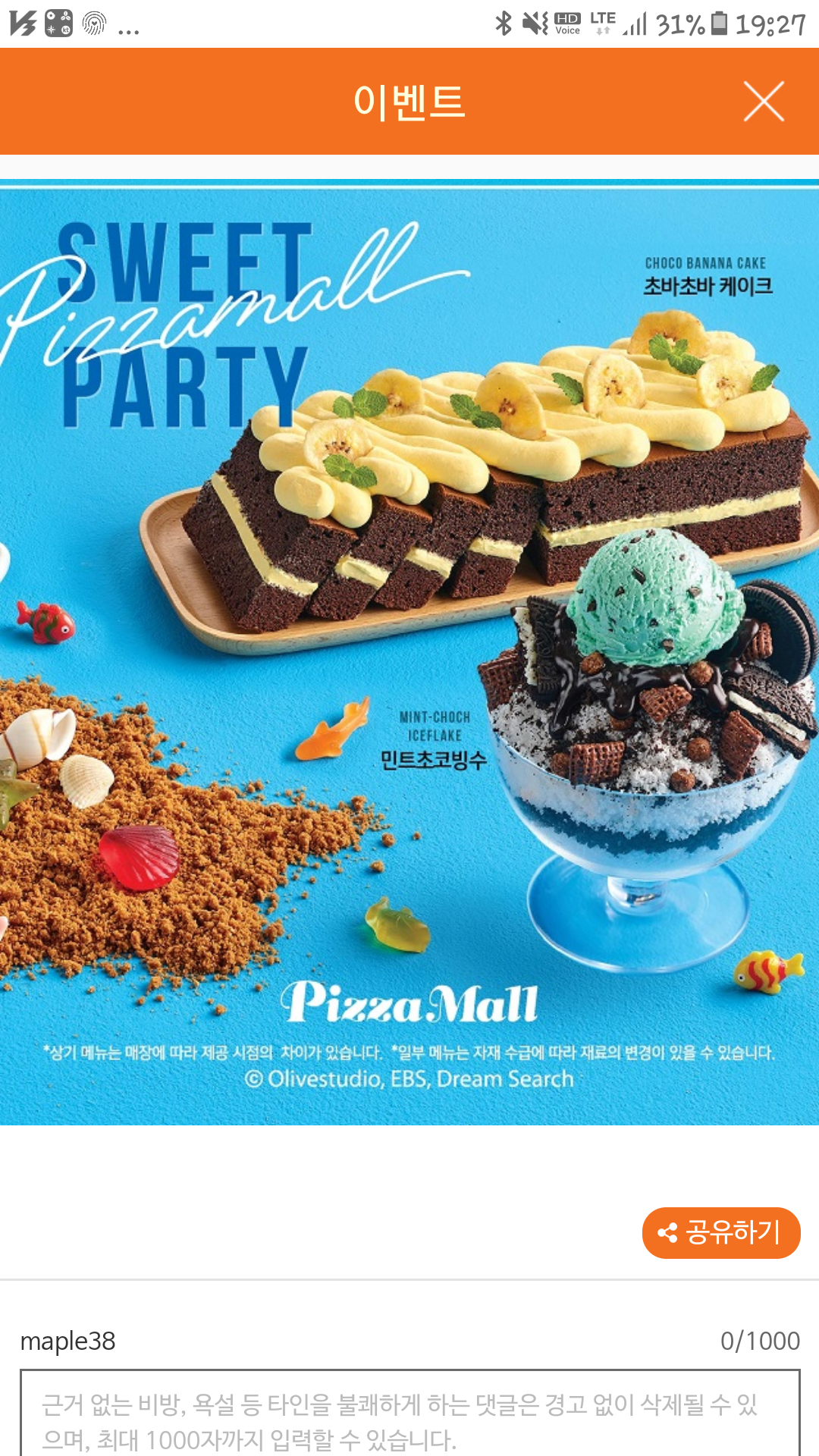 요즘 썸머 풀 파티 시즌이라고 해서 시즌 신메뉴가 들어왔나봐요. 이랜드 앱으로 들어가니 피자몰이벤트가 뜨네요.