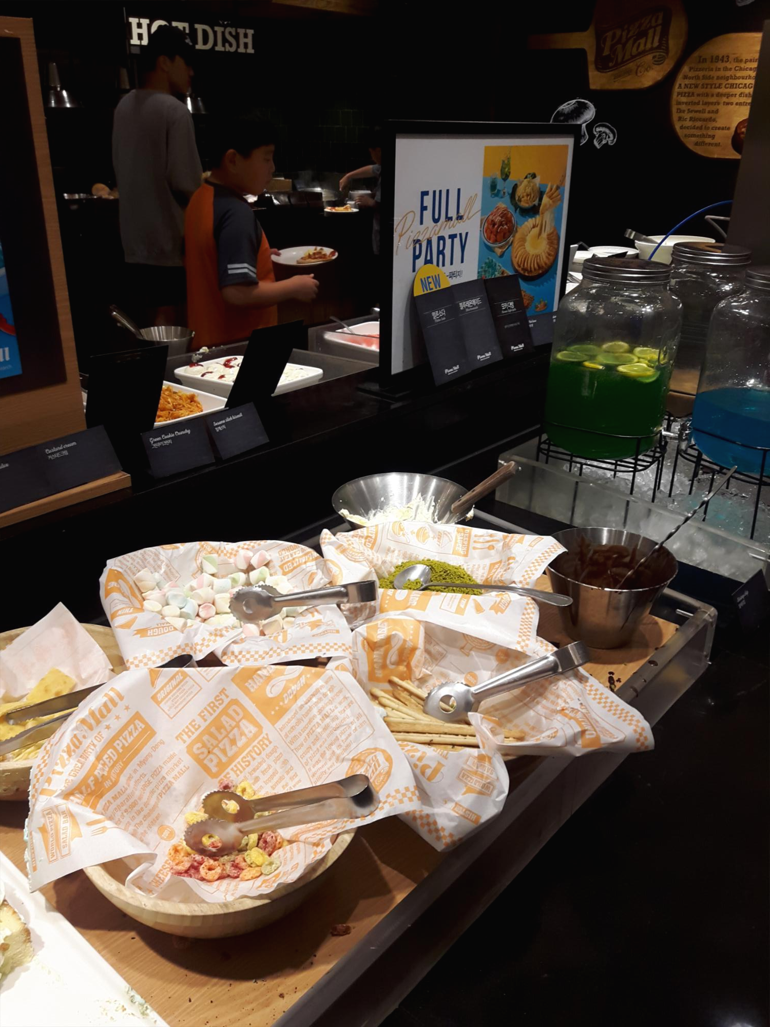 셀러드바 전경이에요. 왼쪽라인은, 피자 및 요리라인이고 그 뒤에서 직원분들이 피자 등 모자라는 음식을 바로 조리해서 채워주세요. 가운데는 샐러드, 디저트가 있어요. 닭가슴살샐러드, 파인애플, 아이스크림, 신선한채소, 케이크 등이 있어요.