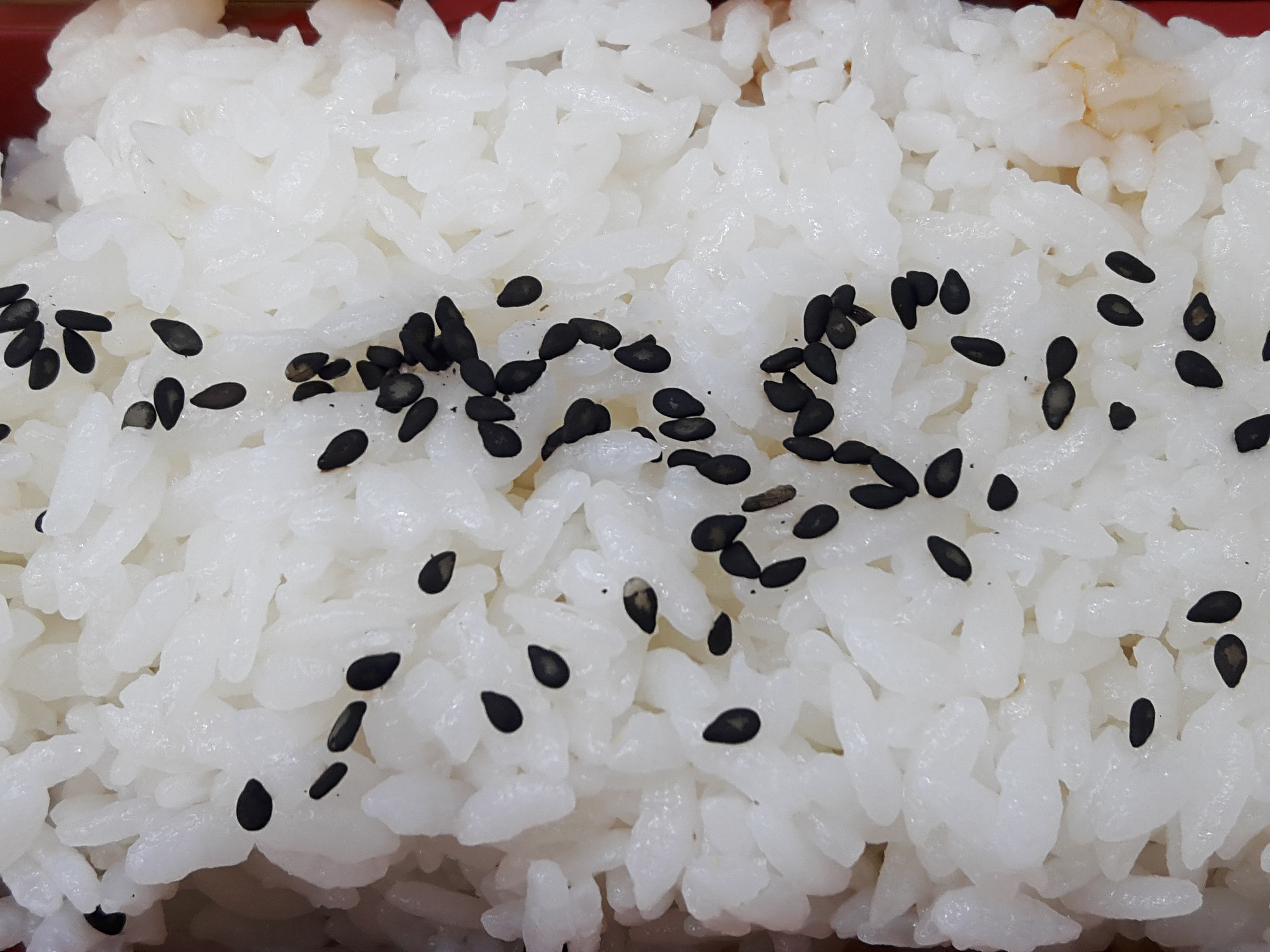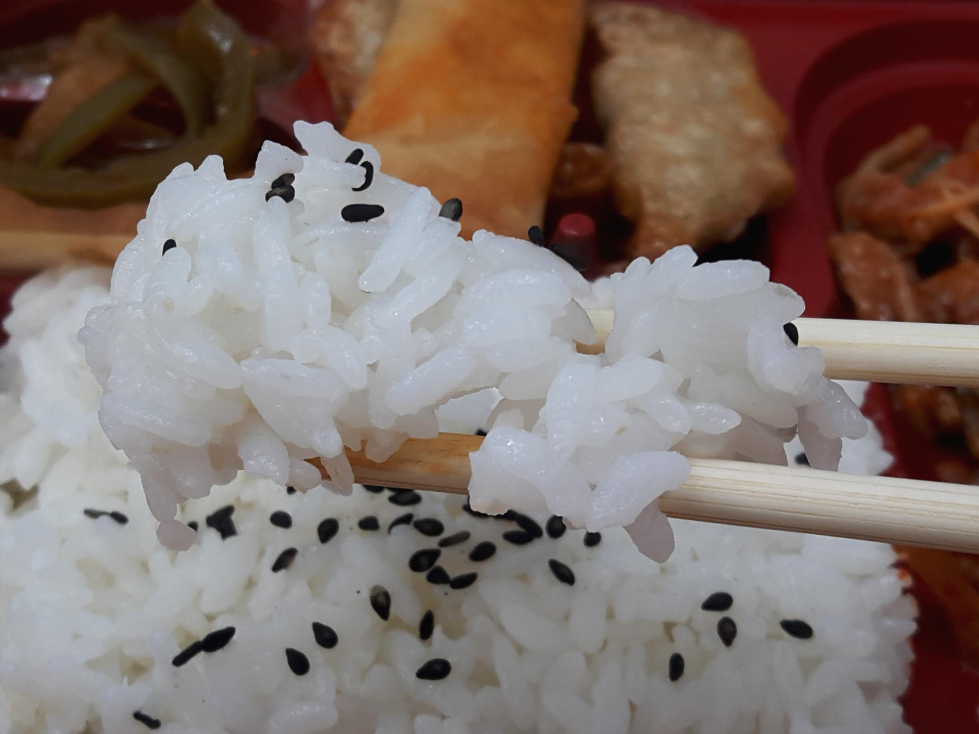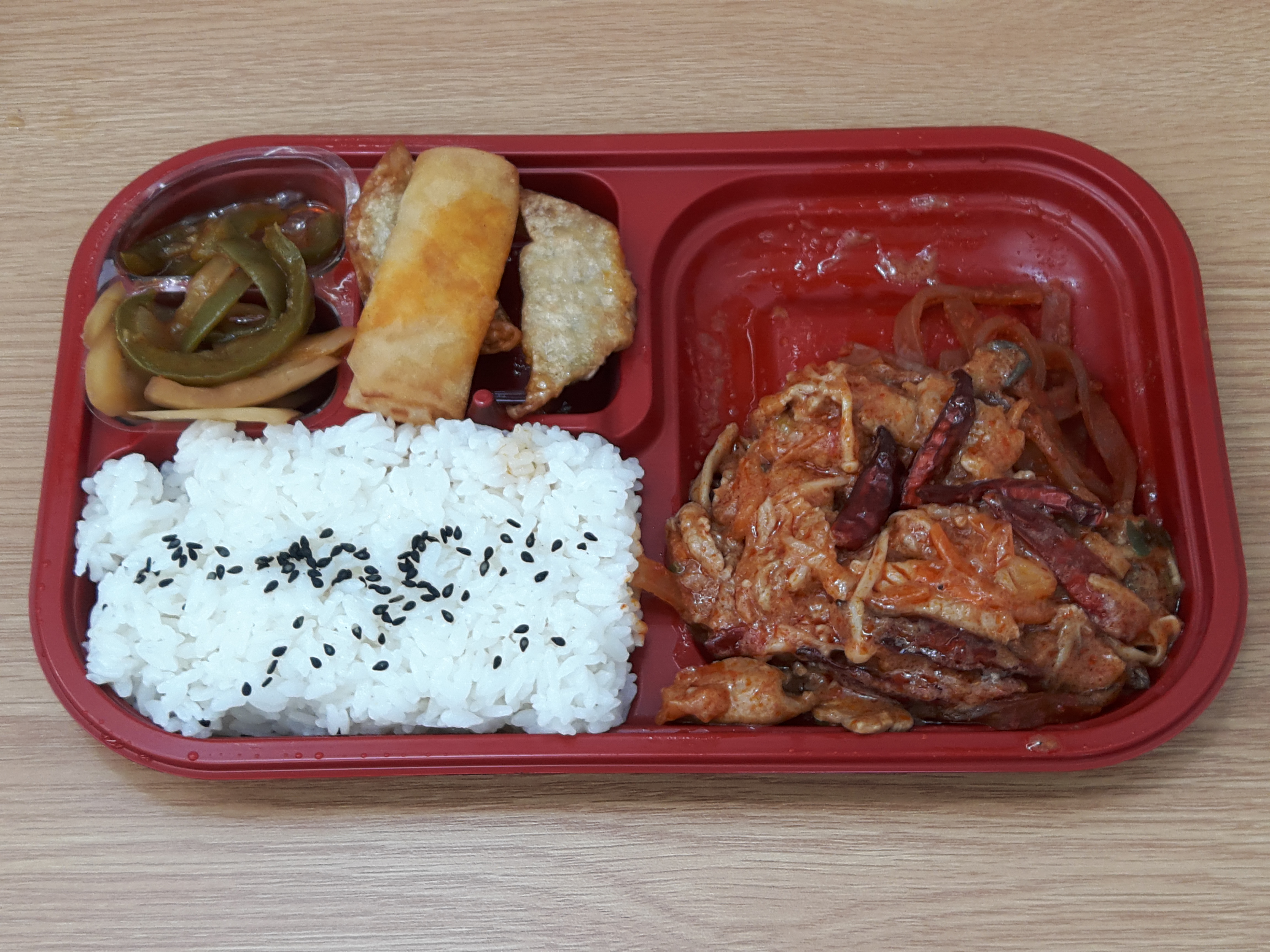 밥에 검은깨가 올라가 있네요. 그 옆에 양파랑 피망무침이 있고요. 그 아래에 춘권하고 만두튀김, 그리고 메인인 짬뽕불고기가 있어요. 전자렌지에에 돌려봅니다.