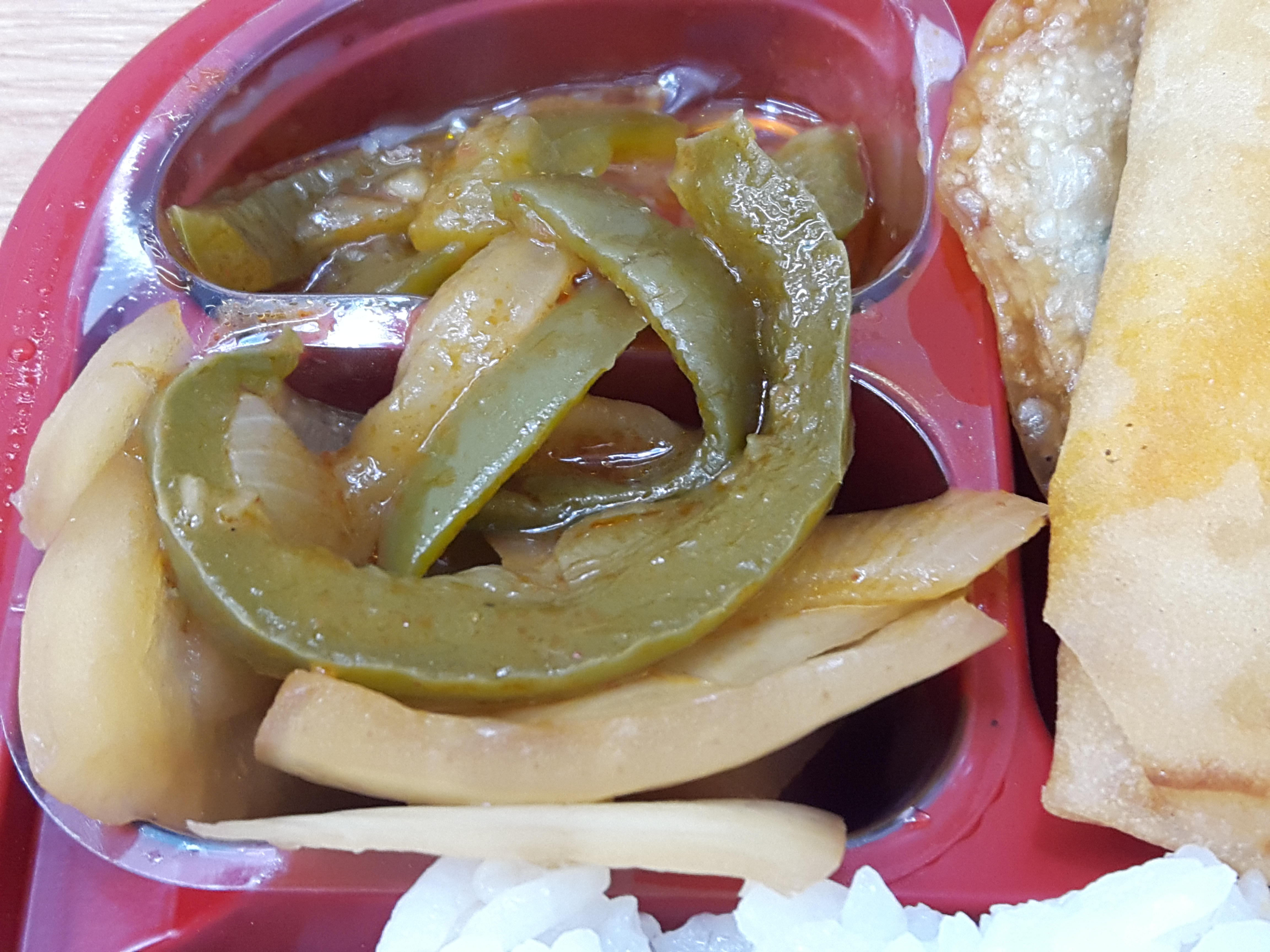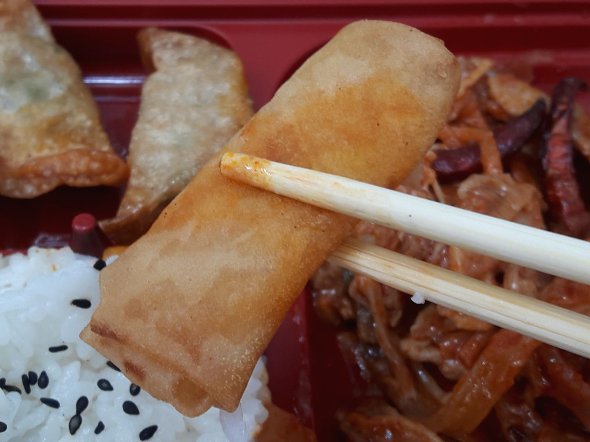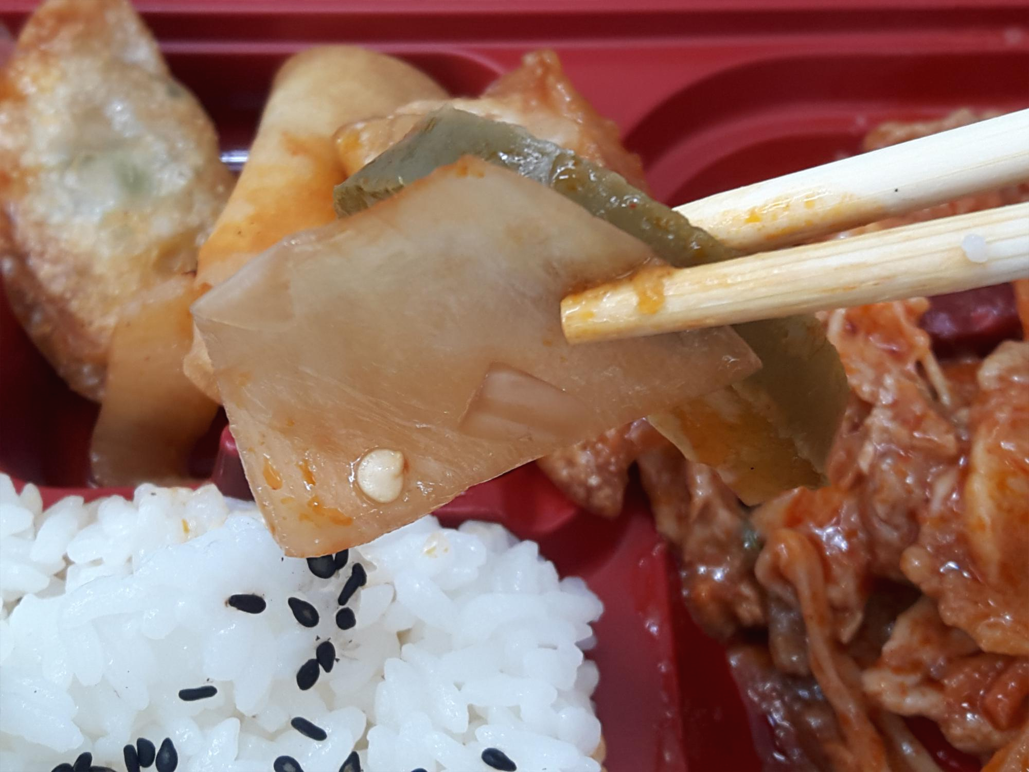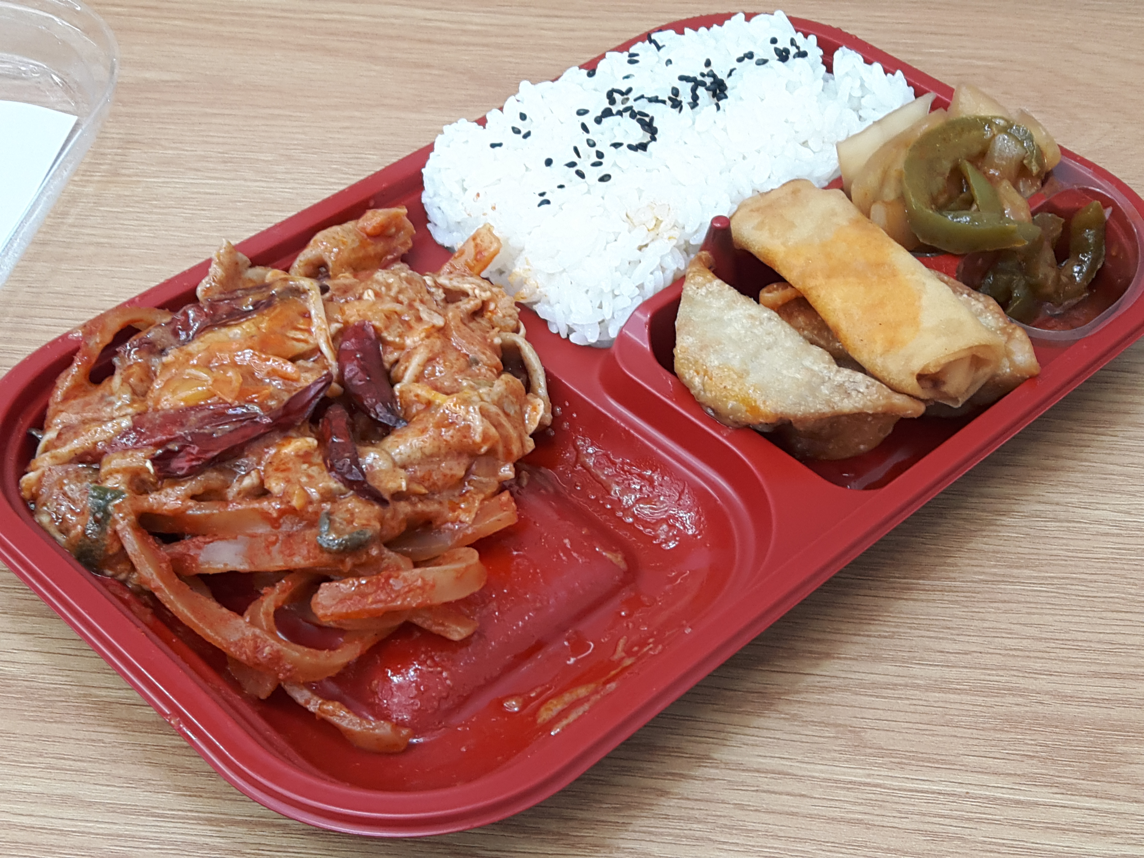 반찬이 전체적으로 무난해요. 양파피망조림, 만두튀김, 춘권은 그냥 무난하게 나오는 반찬이고요. 가장 유심히 봤던건 역시 짬뽕불고기죠! 매콤한 짬뽕맛나는 불고기에요. 독특해서 좋아요. 일반적으로 맵게 볶은 돼지불고기보다 1.5배 정도 더 매운거 같아요. 그리고 안에 당면이 들어 있어서 당면먹는 재미도 있고요. 기간한정판매상품인거 같은데 저는 계속 쭉 판매해도 좋을거 같아요. 독특해서 맛있네요. 다만 말린고추는 먹으면 엄청 매워서 한쪽으로 빼놨어요. 말린고추 좀 적게 들어갔으면 좋겠어요. 그리고 당면도 좋지만 고기양이 조금 아쉬웠네요.