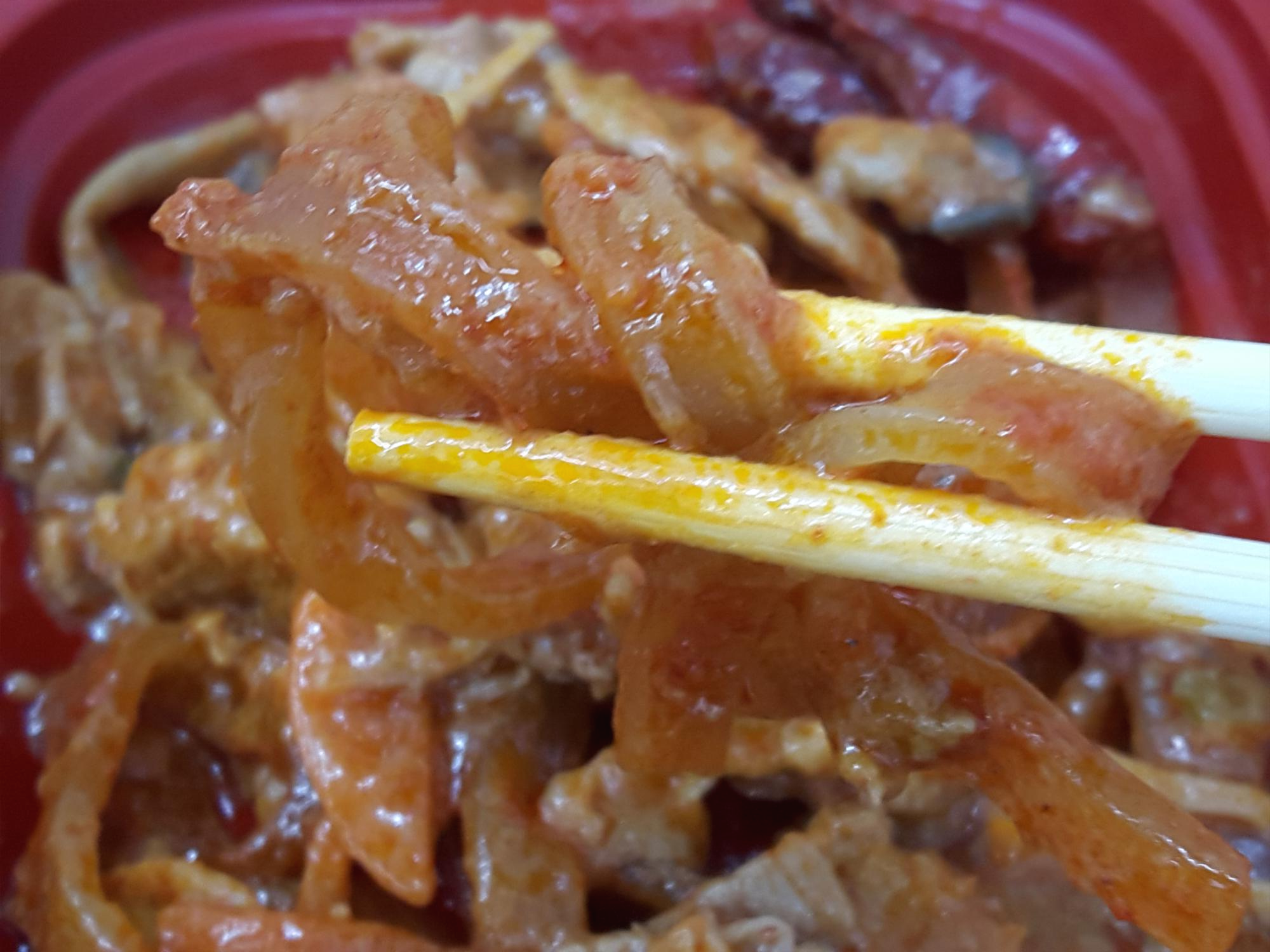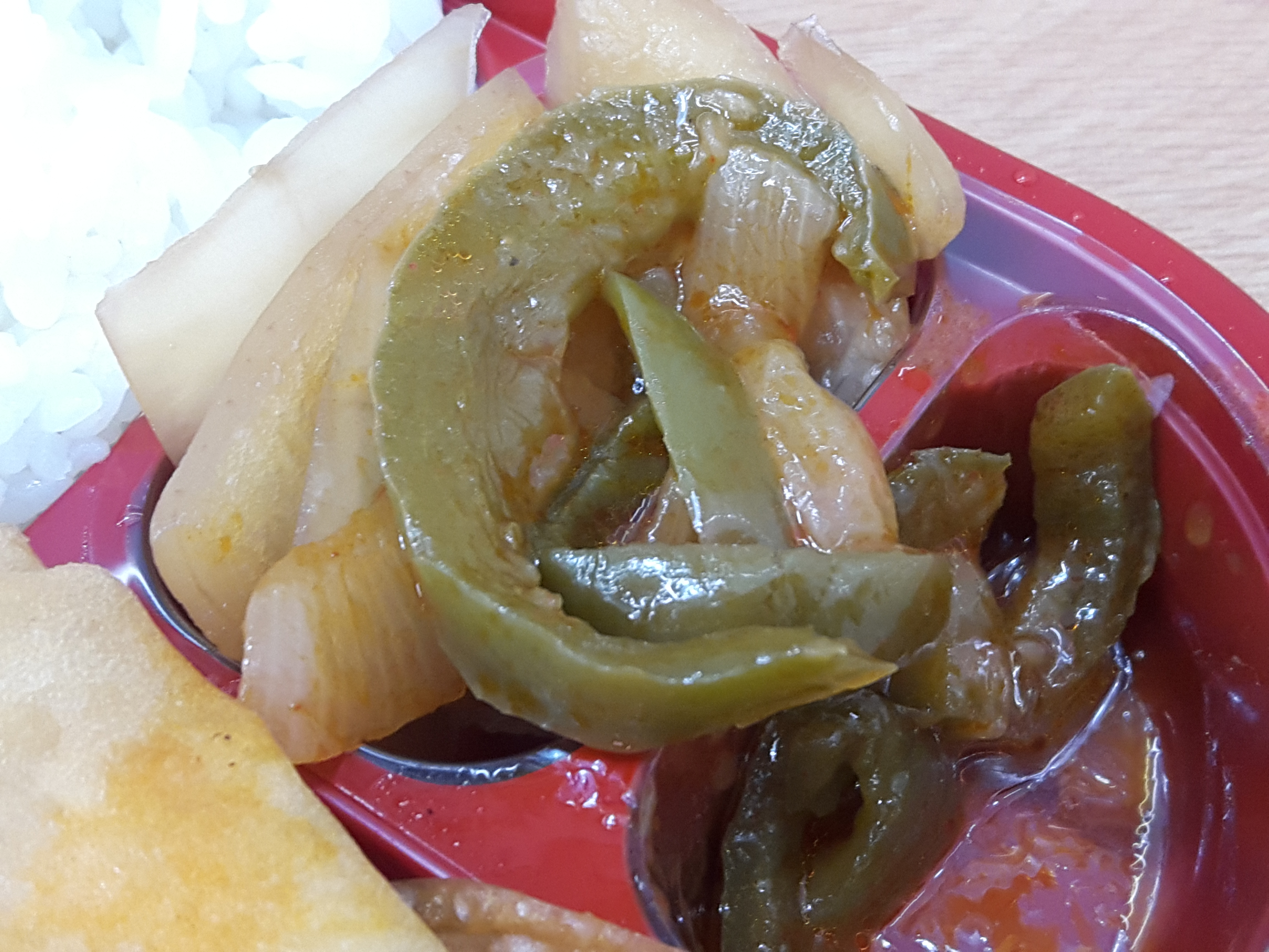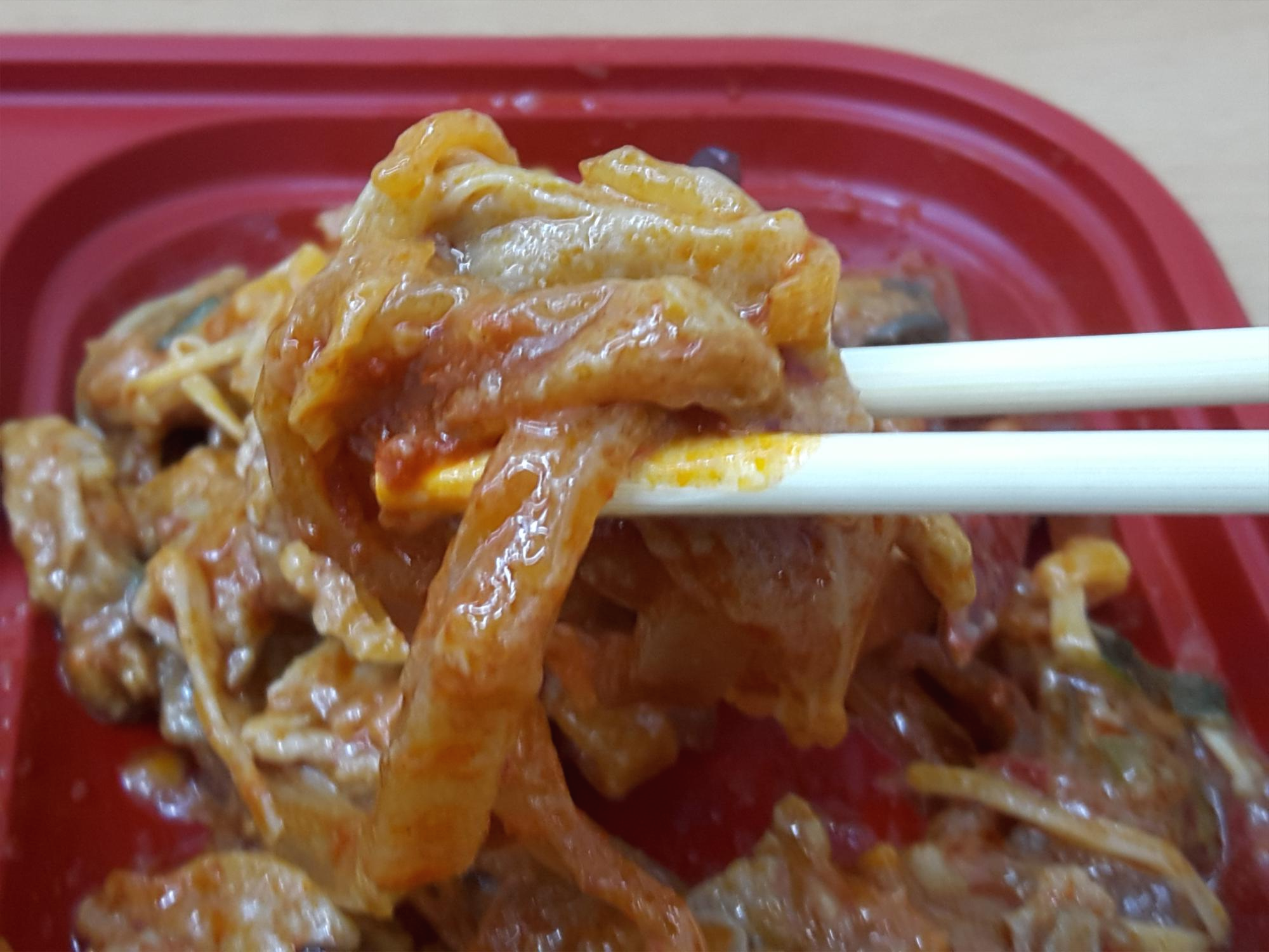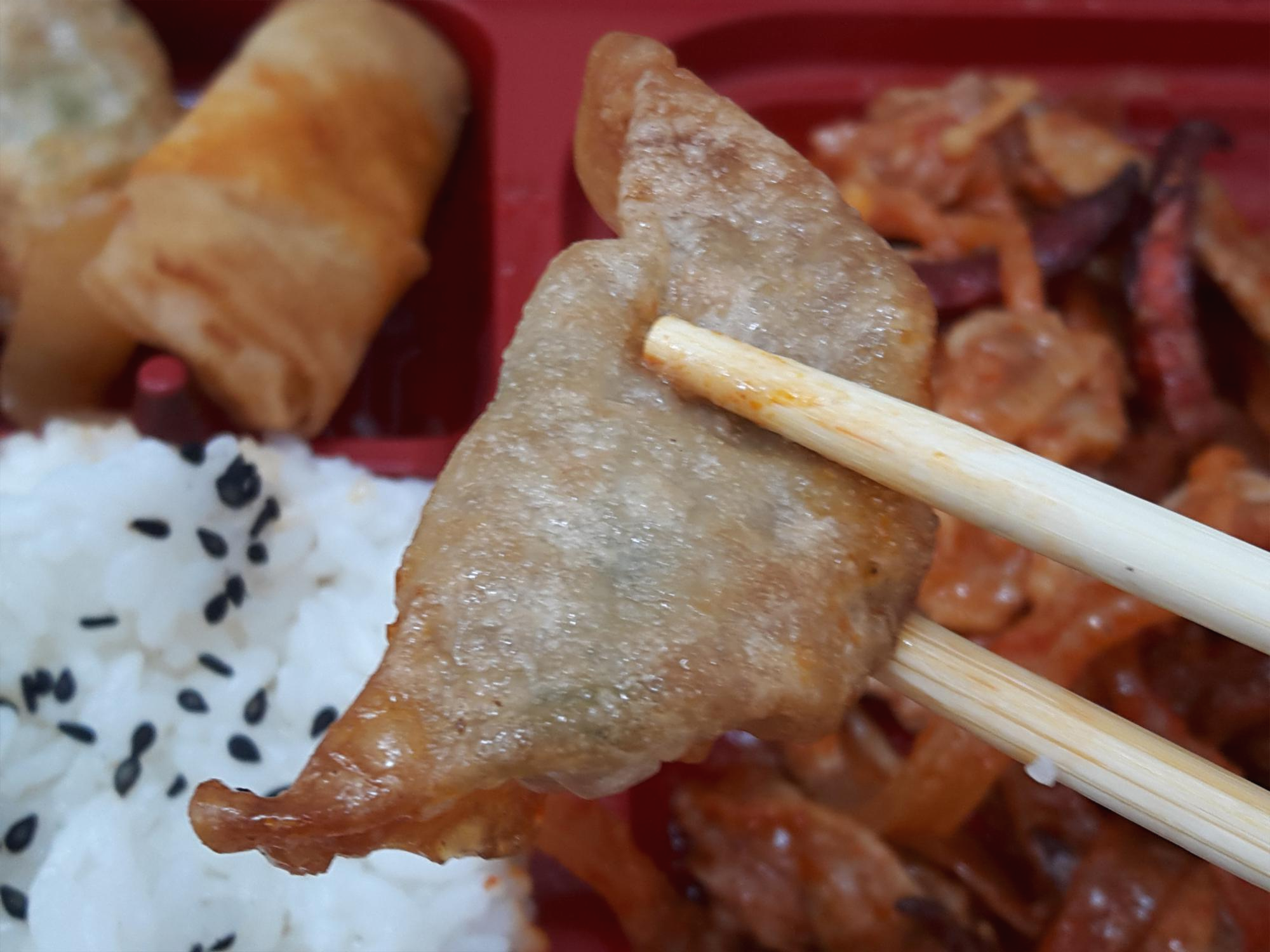 반찬이 전체적으로 무난해요. 양파피망조림, 만두튀김, 춘권은 그냥 무난하게 나오는 반찬이고요. 가장 유심히 봤던건 역시 짬뽕불고기죠! 매콤한 짬뽕맛나는 불고기에요. 독특해서 좋아요. 일반적으로 맵게 볶은 돼지불고기보다 1.5배 정도 더 매운거 같아요. 그리고 안에 당면이 들어 있어서 당면먹는 재미도 있고요. 기간한정판매상품인거 같은데 저는 계속 쭉 판매해도 좋을거 같아요. 독특해서 맛있네요. 다만 말린고추는 먹으면 엄청 매워서 한쪽으로 빼놨어요. 말린고추 좀 적게 들어갔으면 좋겠어요. 그리고 당면도 좋지만 고기양이 조금 아쉬웠네요.