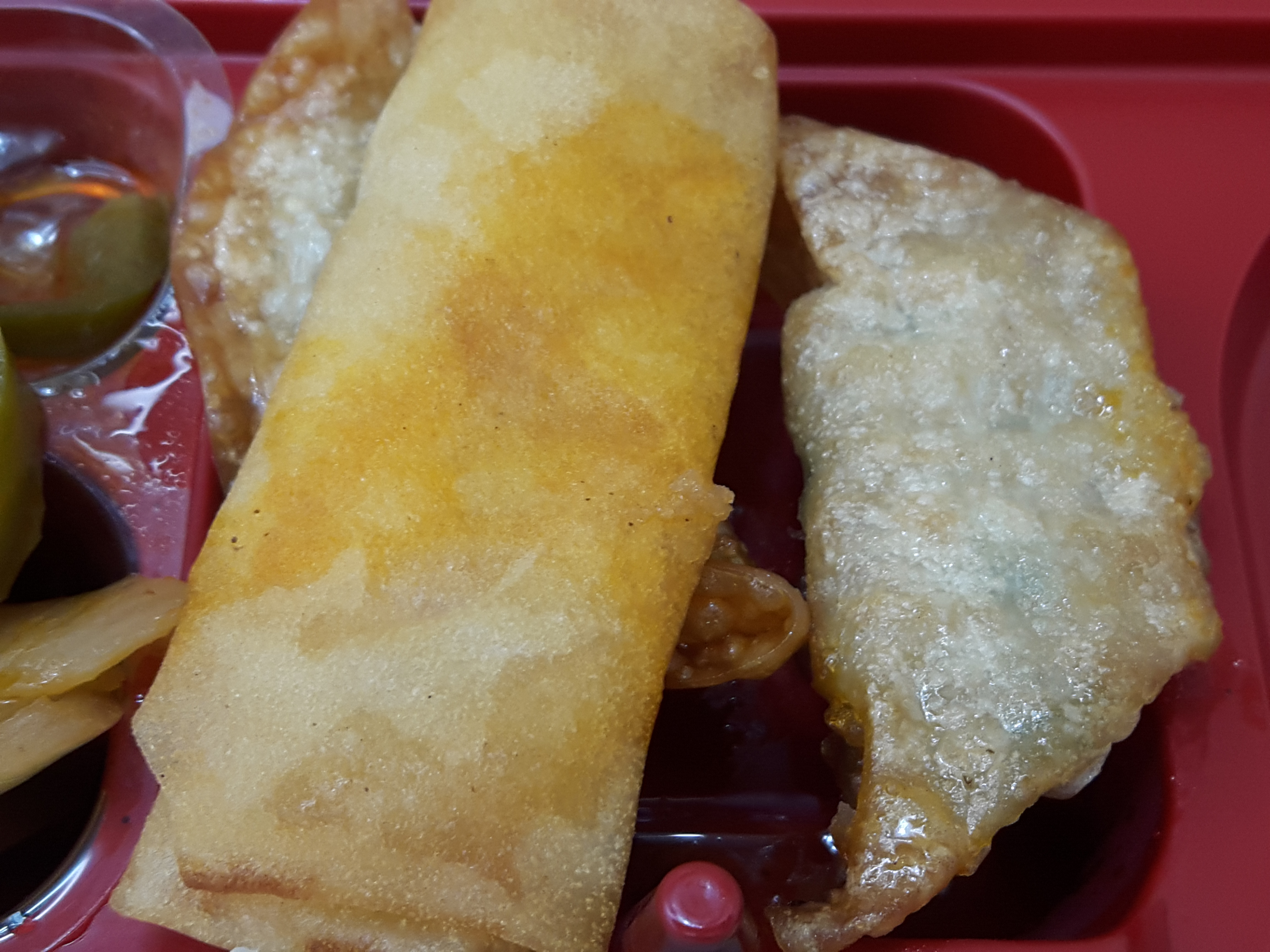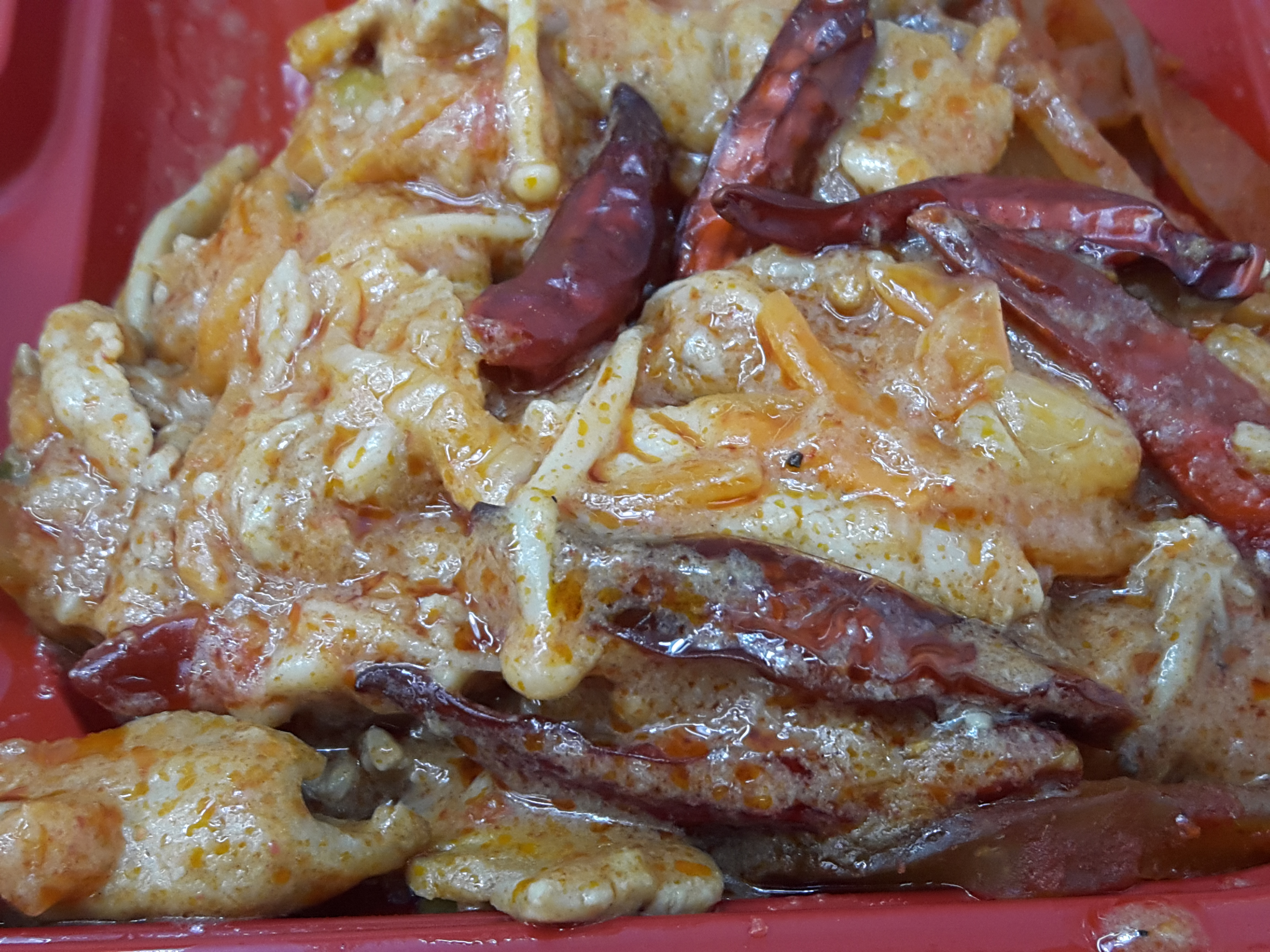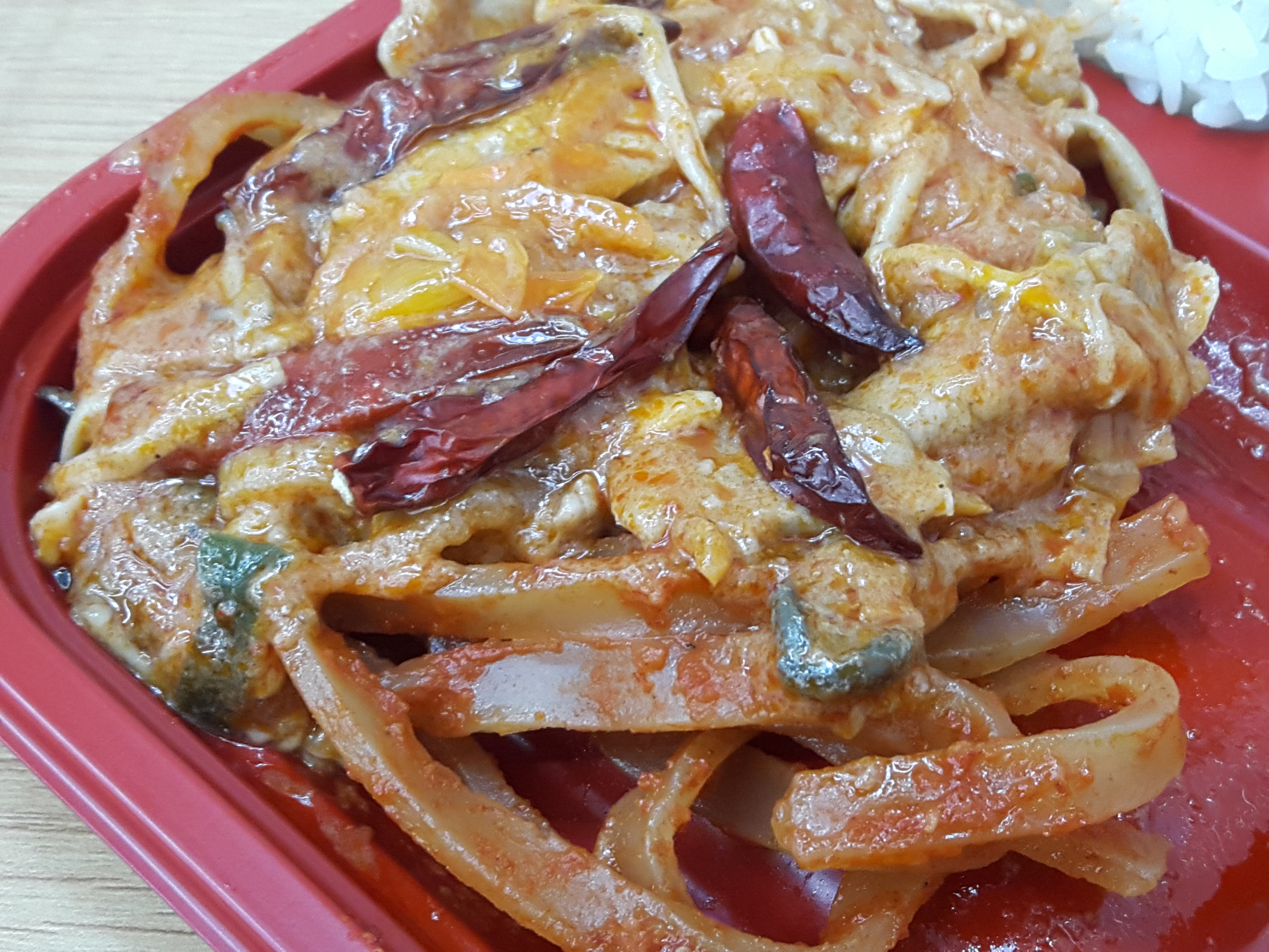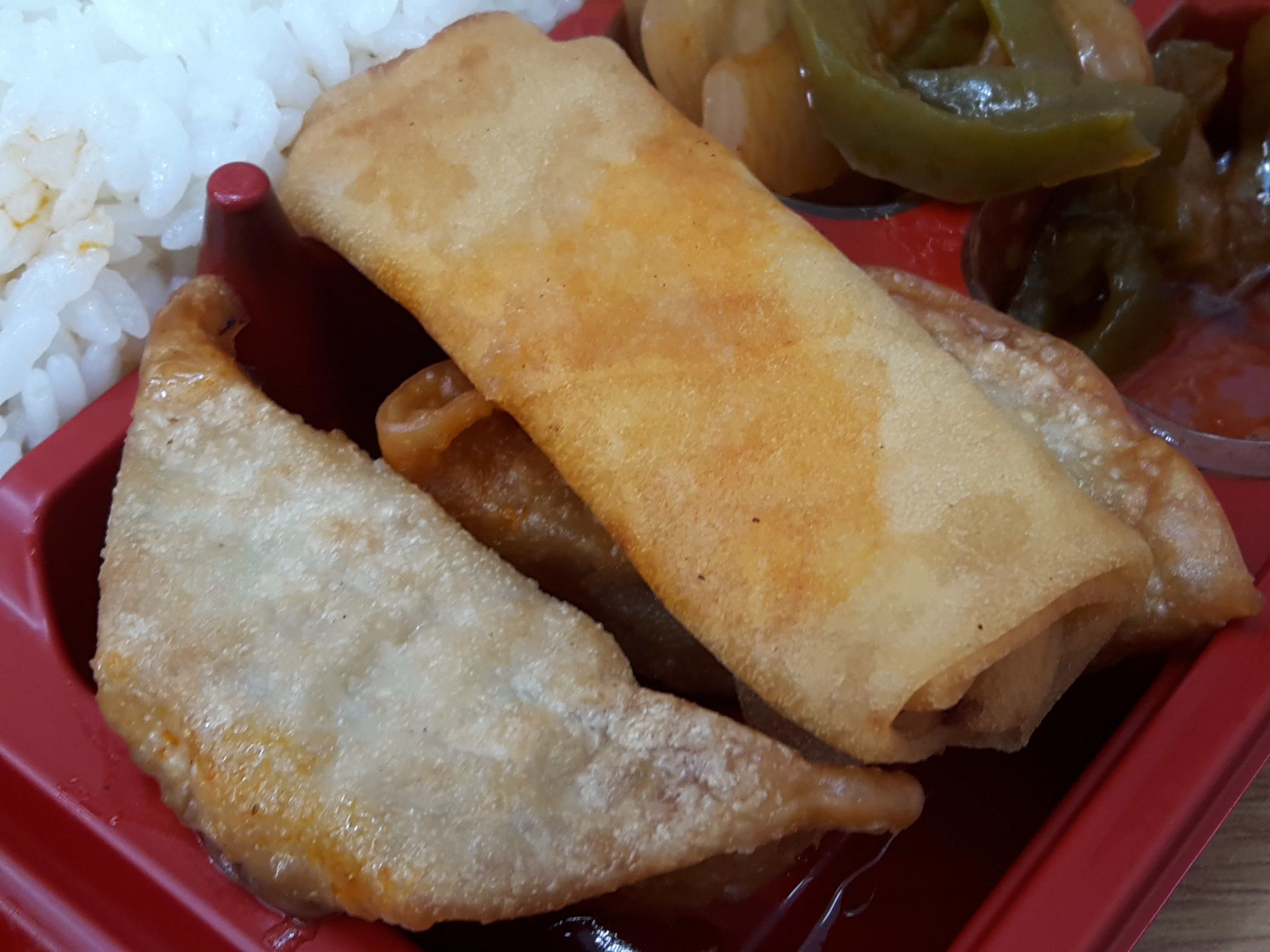 반찬이 전체적으로 무난해요. 양파피망조림, 만두튀김, 춘권은 그냥 무난하게 나오는 반찬이고요. 가장 유심히 봤던건 역시 짬뽕불고기죠! 매콤한 짬뽕맛나는 불고기에요. 독특해서 좋아요. 일반적으로 맵게 볶은 돼지불고기보다 1.5배 정도 더 매운거 같아요. 그리고 안에 당면이 들어 있어서 당면먹는 재미도 있고요. 기간한정판매상품인거 같은데 저는 계속 쭉 판매해도 좋을거 같아요. 독특해서 맛있네요. 다만 말린고추는 먹으면 엄청 매워서 한쪽으로 빼놨어요. 말린고추 좀 적게 들어갔으면 좋겠어요. 그리고 당면도 좋지만 고기양이 조금 아쉬웠네요.