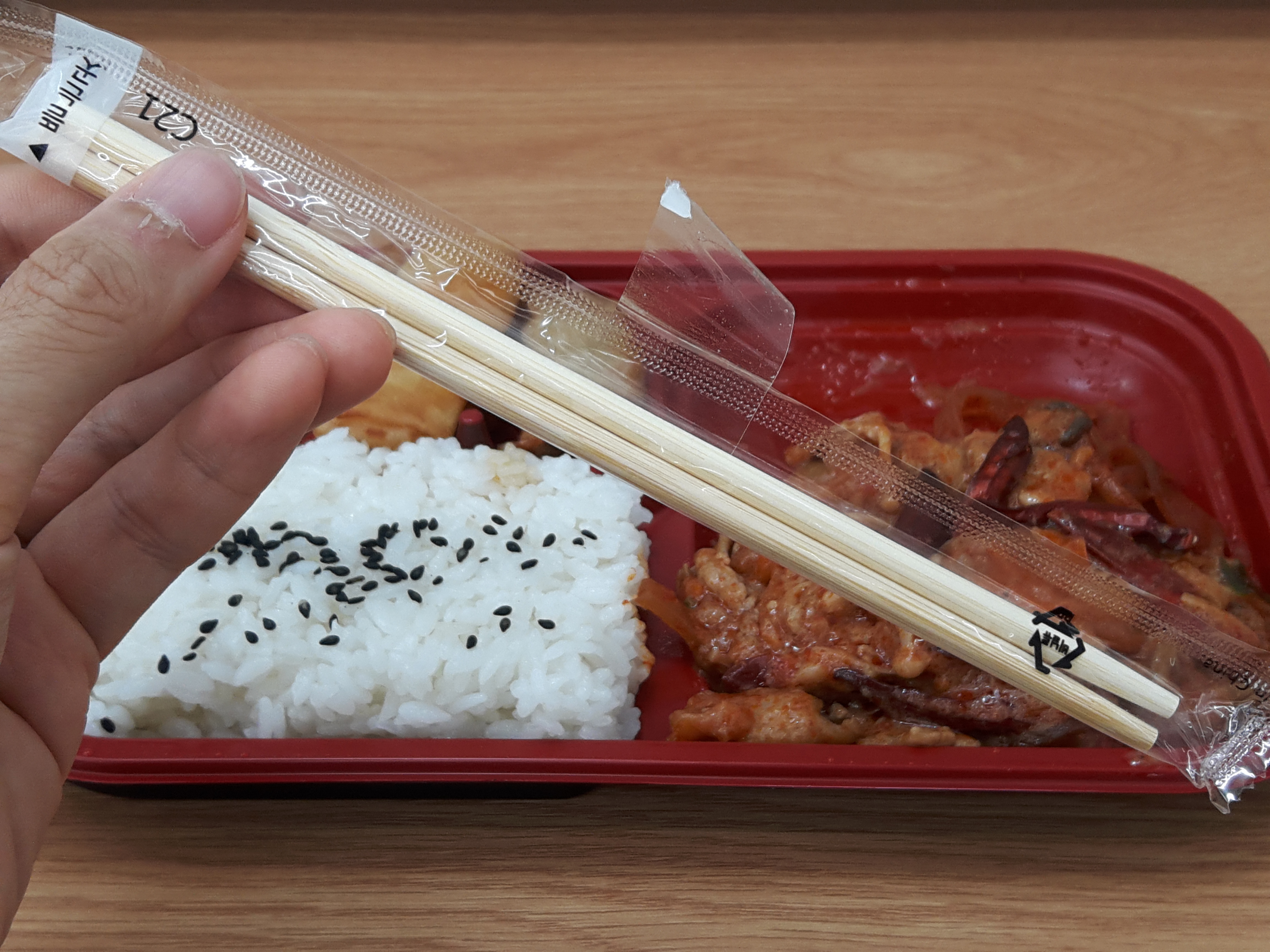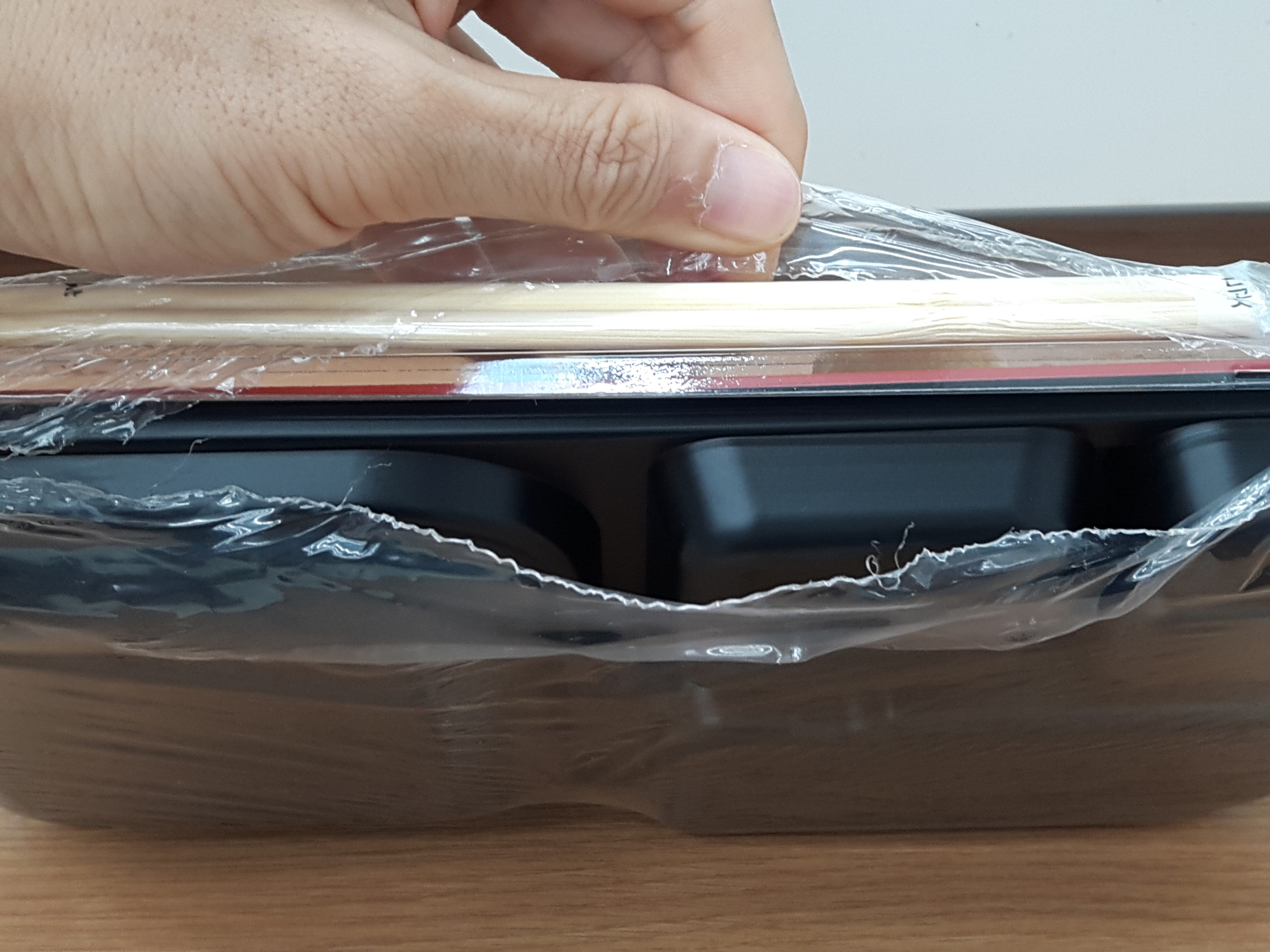 포장비닐에 담아져 있고요. 옆면에 나무젓가락이 들어 있어요. 옆면을 통해서 투명비닐을 뜯으면 잘 뜯어집니다.