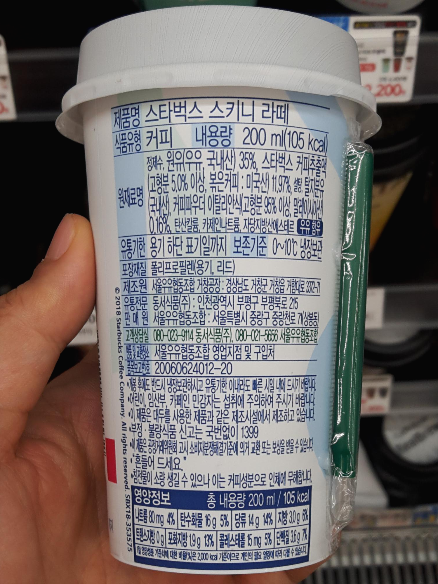 스타벅스 스키니라떼는 경남 거창에 있는 서울우유 거창공장에서 만들고, 인청 부평의 동서식품과 서울우유에서 유통 및 판매해요. 원재료는 정제수, 원유(우유, 국내산) 35%, 스타벅스 커피추출액(고형분 5.0% 이상, 볶은커피: 미국산) 11.97%, 설탕, 탈지분유(국내산), 커피파우더 이탈리안식(고형분 95% 이상, 말레이시아산) 0.16%, 탄산칼륨, 카제인나트륨, 자당지방산에스테르 입니다.