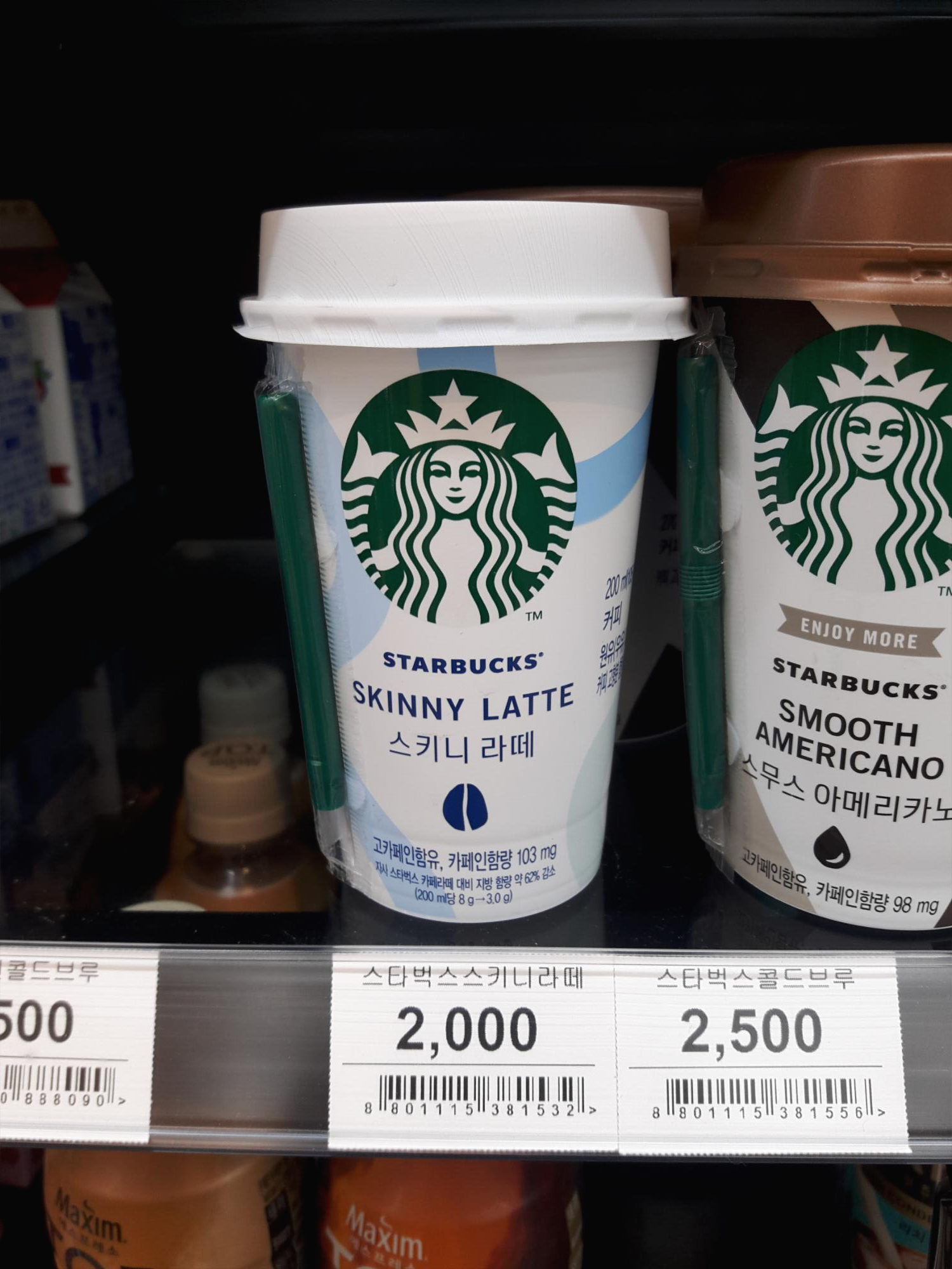 스타벅스 스키니 라떼 입니다. 2019년 9월 현재 이마트24에서 2,000원에 판매되고 있어요. 스키니라떼, 스무스아메리카노, 에스프레소 이렇게 3~4종류 되는거 같아요. 이번에 스키니라떼를 먹어보았습니다.