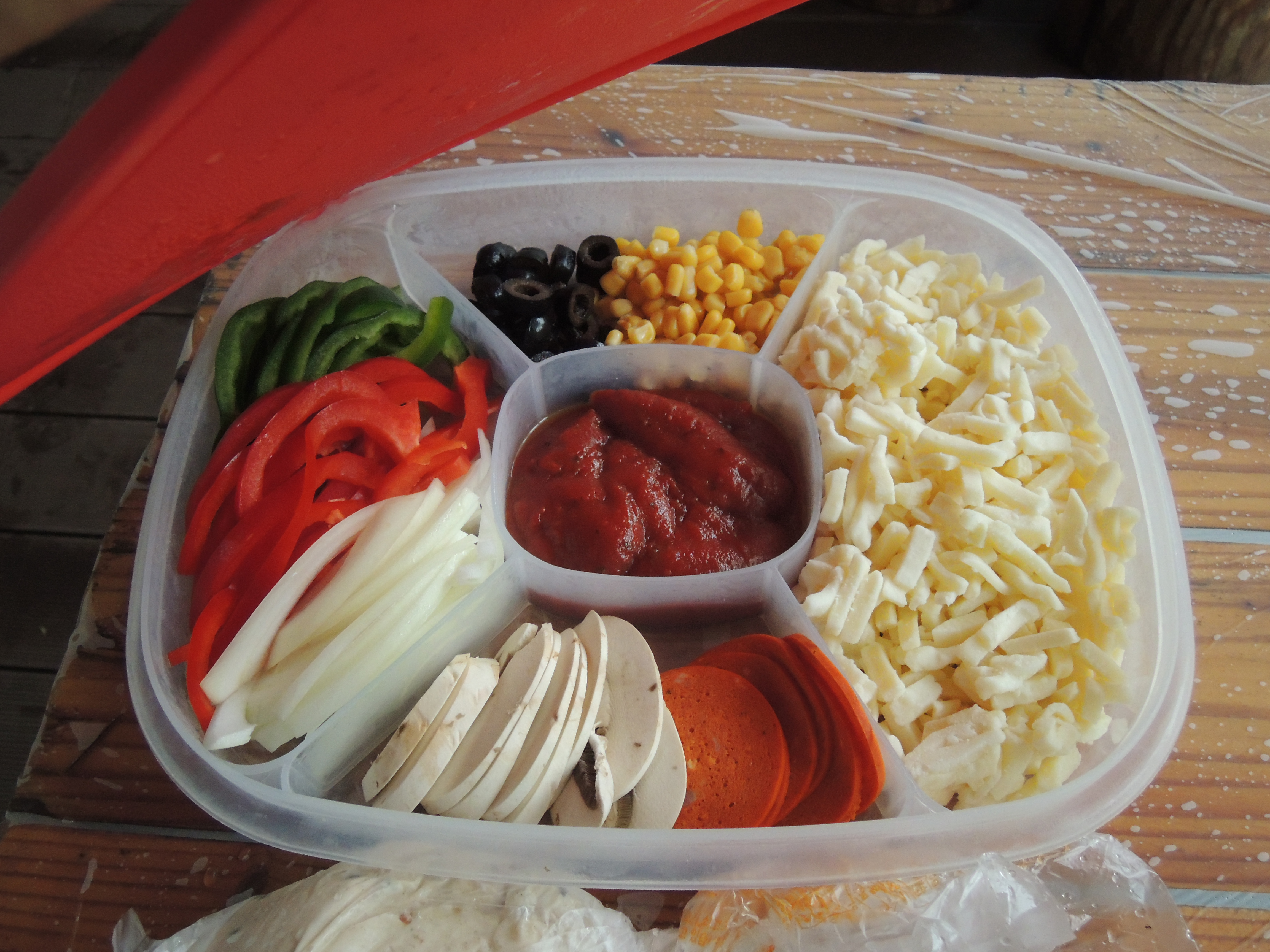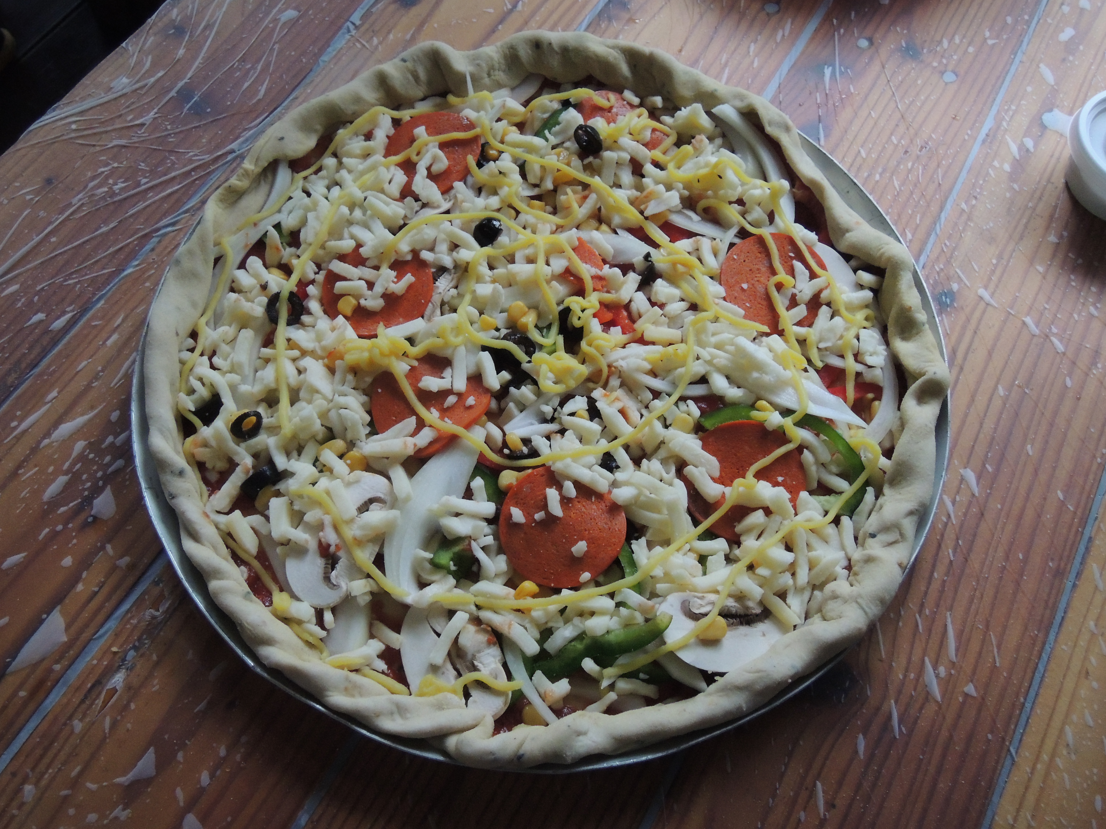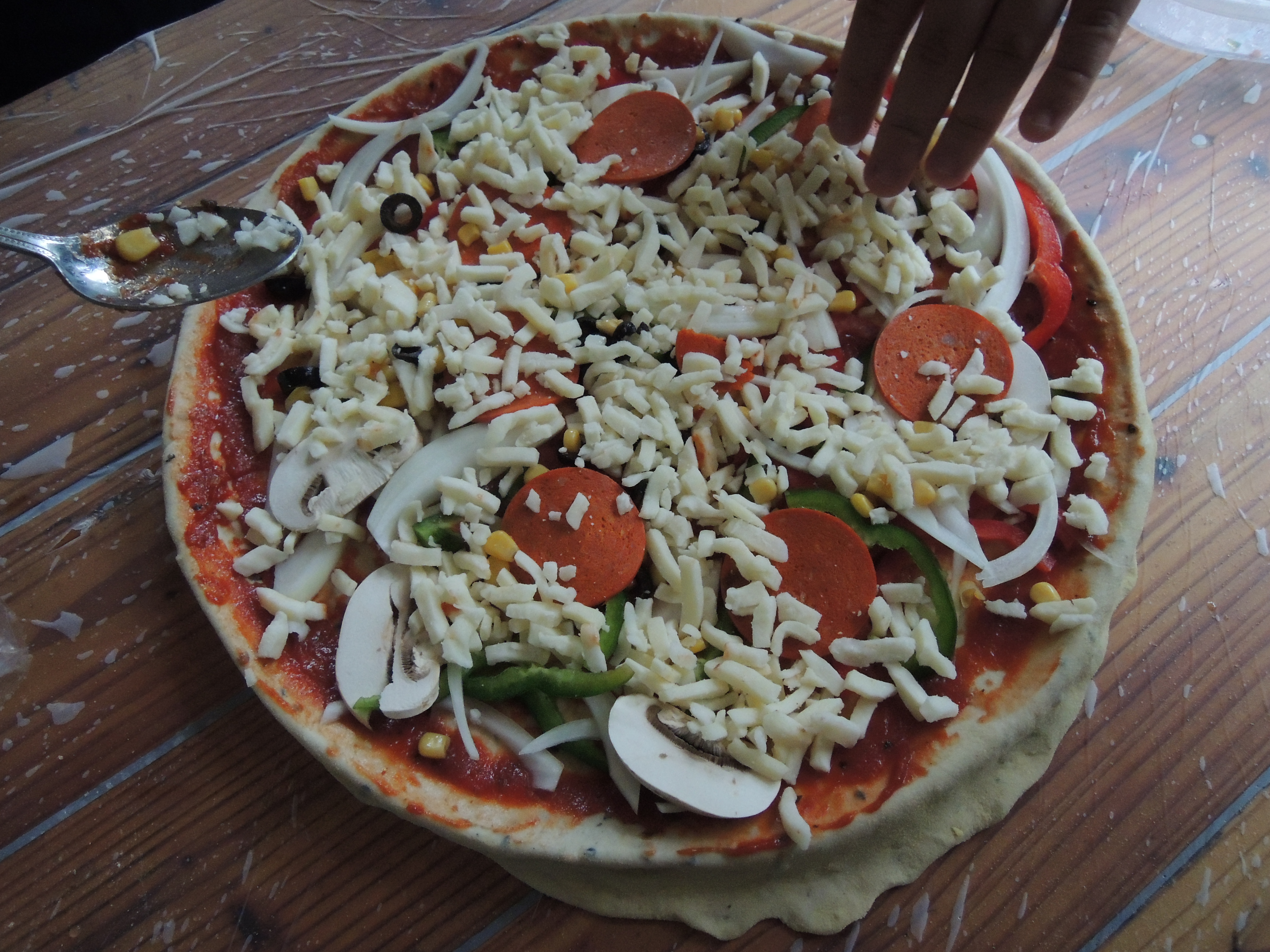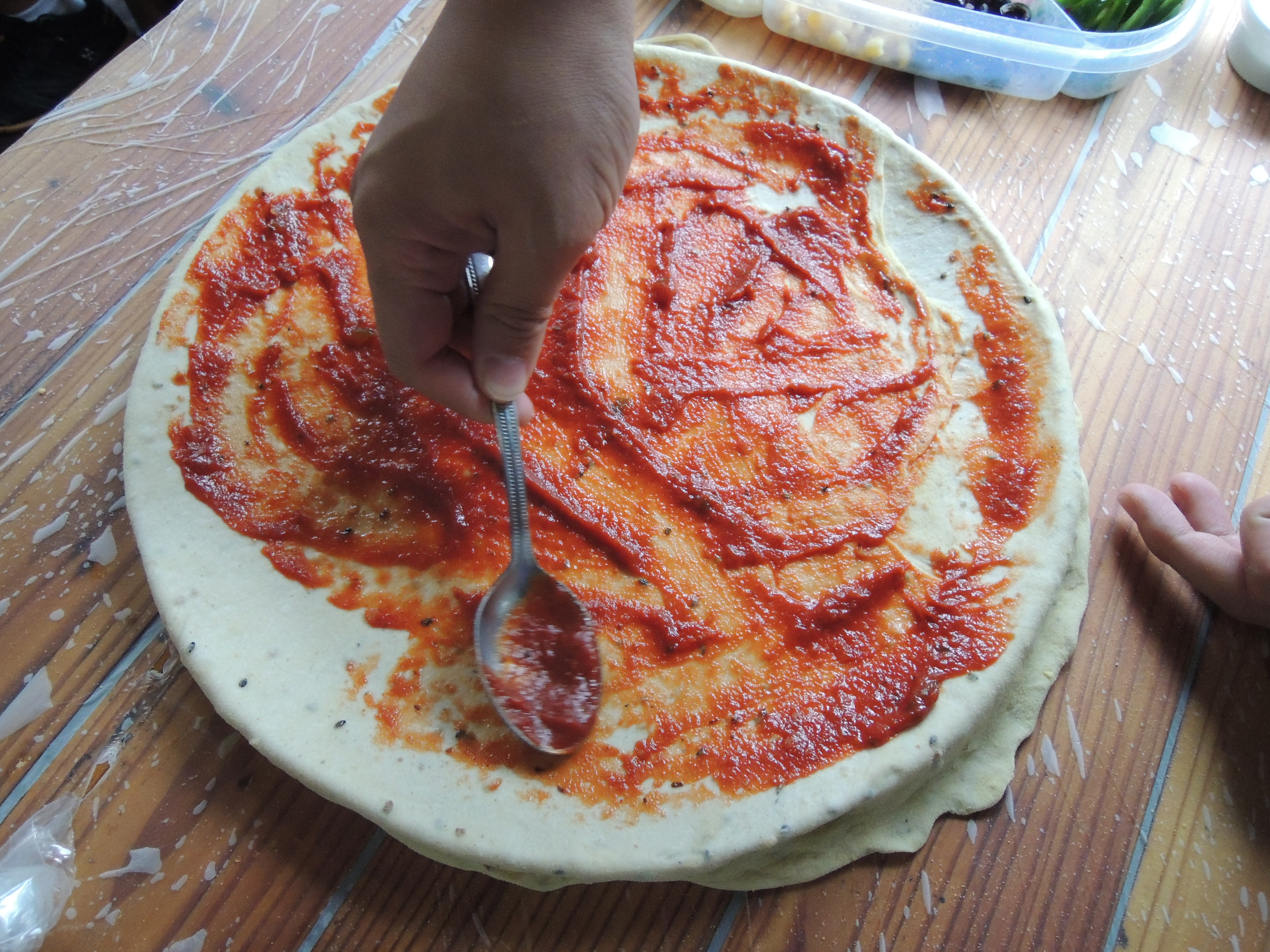 반죽 위에 토마토소스를 올리고요, 그 위에 각종 토핑을 올려줍니다.